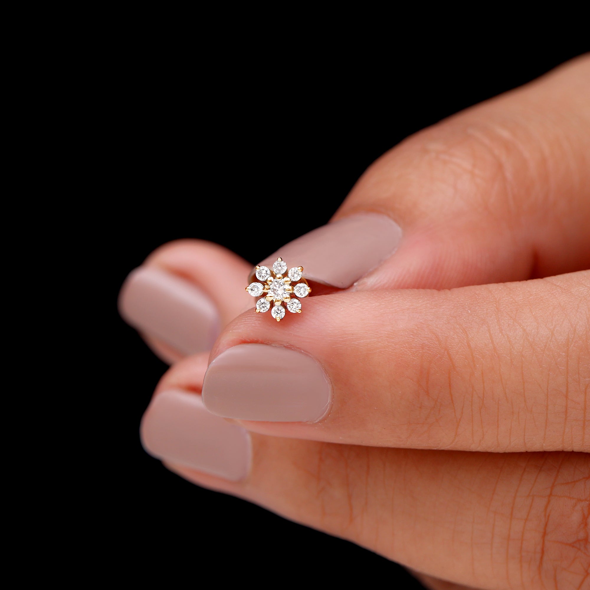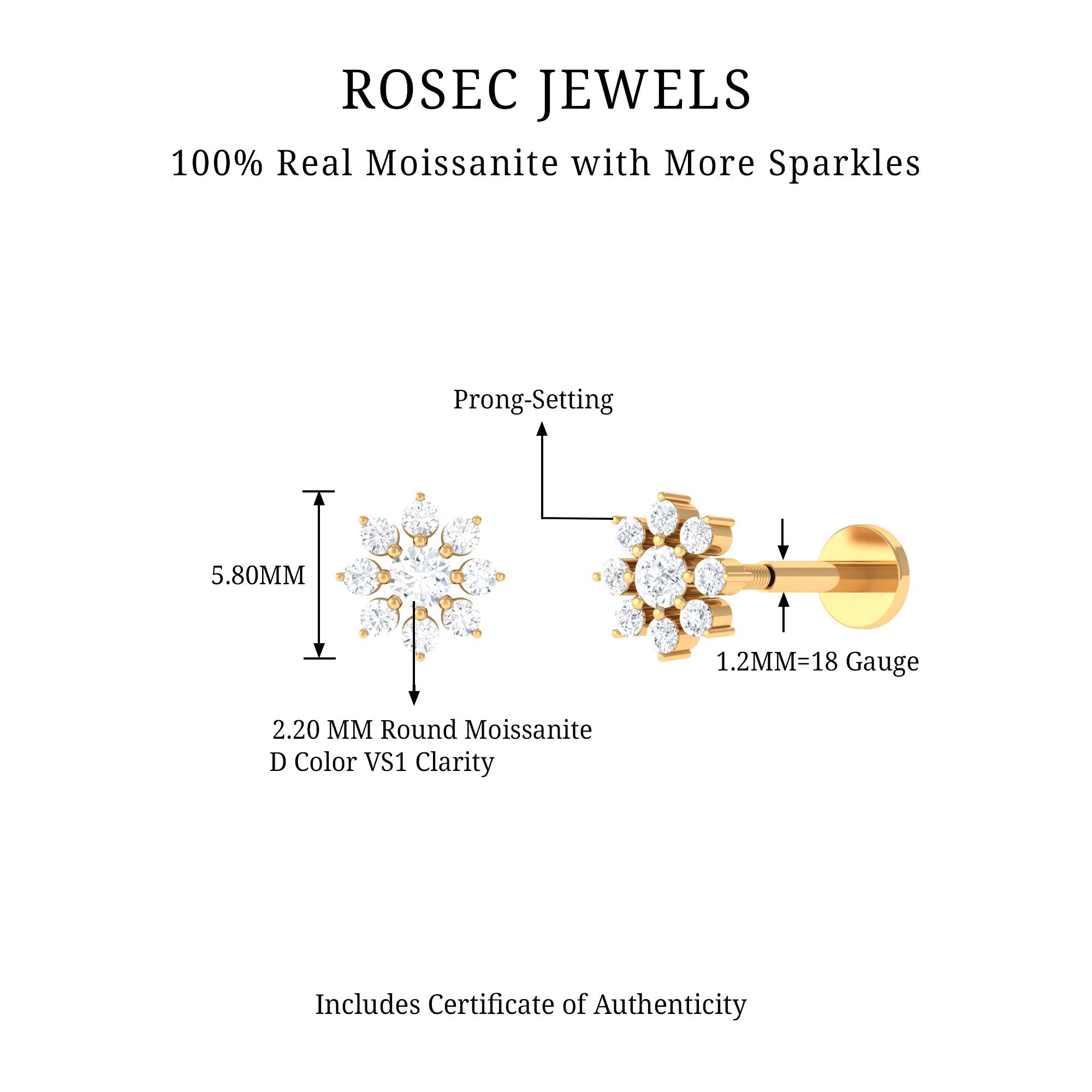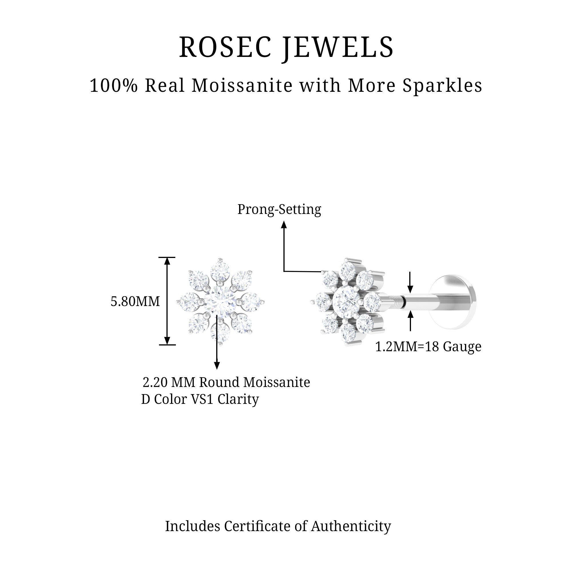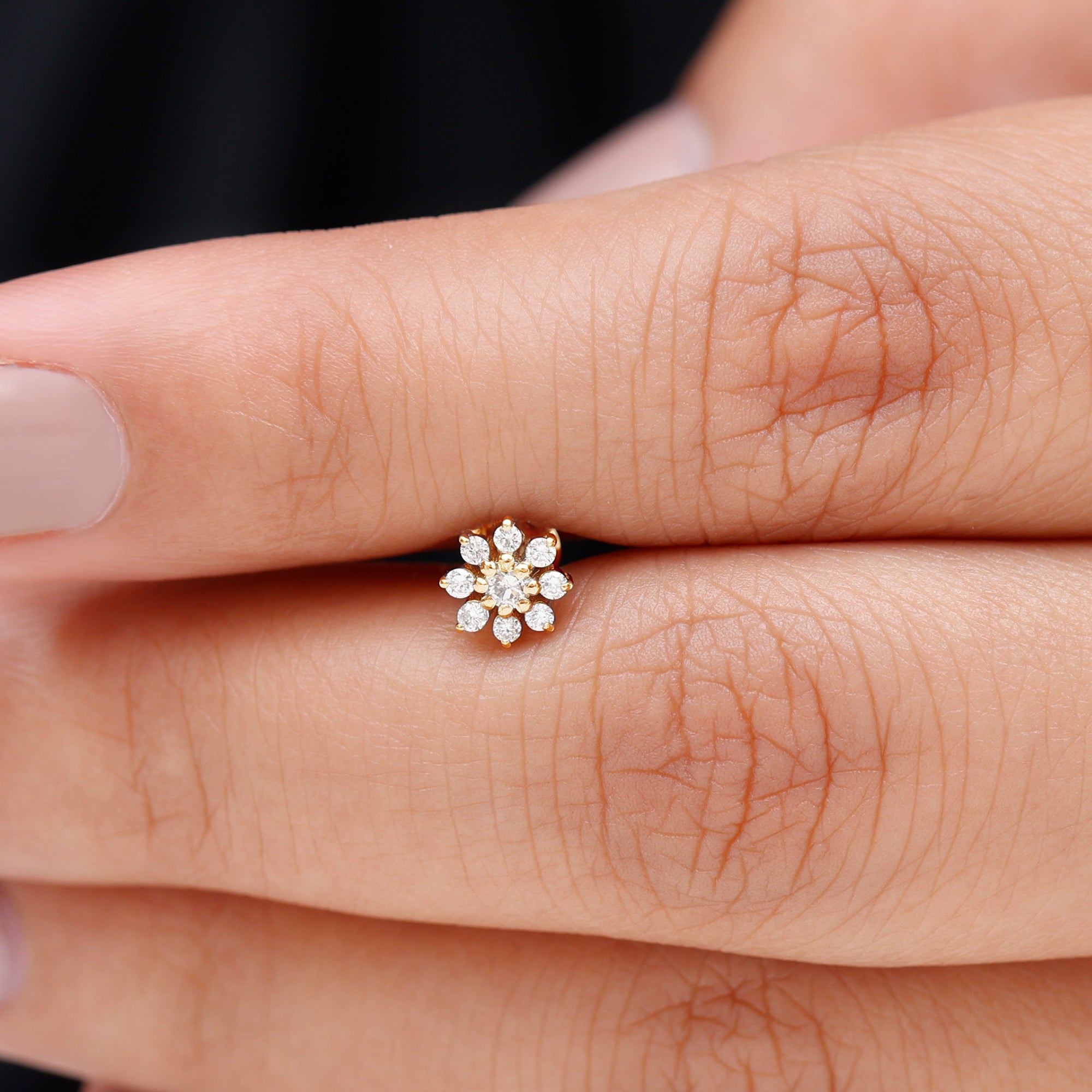 If youre in search of a versatile and stunning earring, look no further than this Moissanite Flower Cartilage Earring. The beautiful Flower Design is composed of high-quality Round Cut Moissanites set in Real Gold Metal. The Flat Back Closure provides a comfortable and secure fit, and this Floral Earring can be worn on your Helix, Conch, Tragus, Cartilage, or Upper Lobe Piercings. With timeless beauty and exceptional quality, this earring is perfect for any occasion.