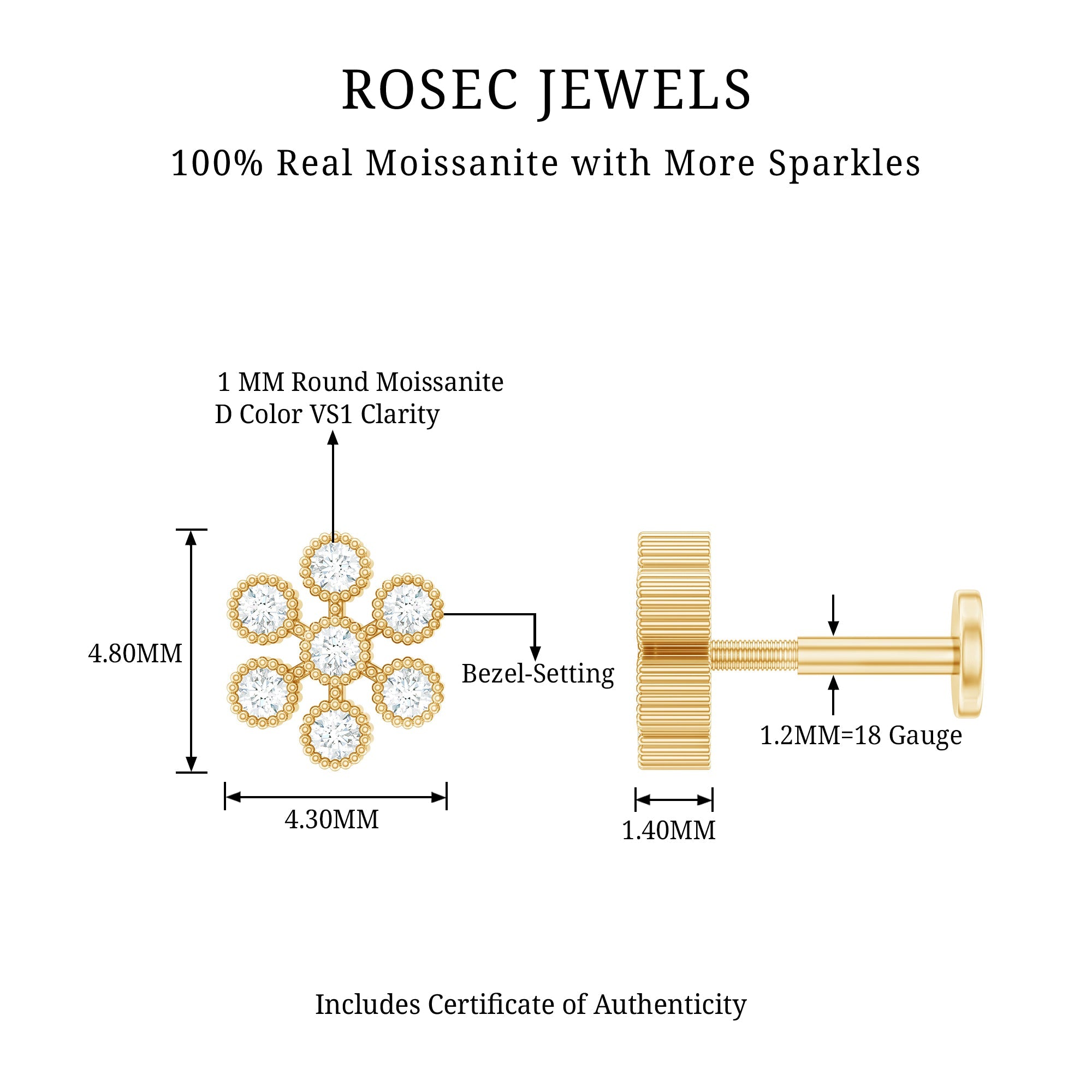 Moissanite Flower Cartilage Earring in Beaded Bezel Setting ‐ D-VS1 / 10K White Gold / Flat Back 6.5 MM