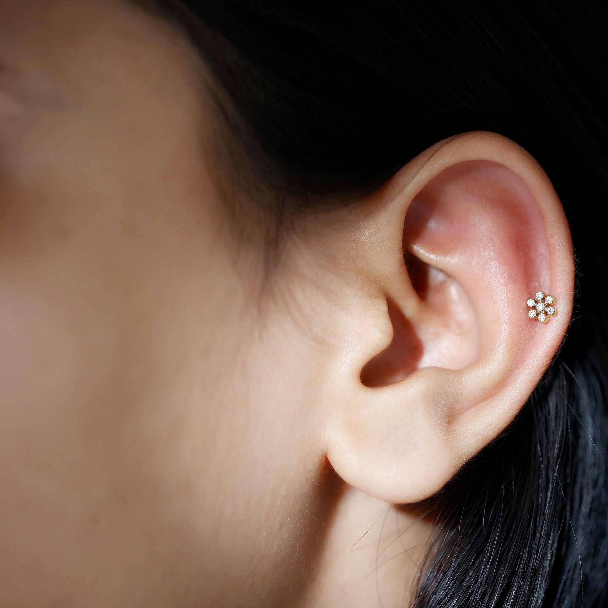 Moissanite Flower Cartilage Earring in Beaded Bezel Setting ‐ D-VS1 / 14K Yellow Gold / Flat Back 5.5 MM