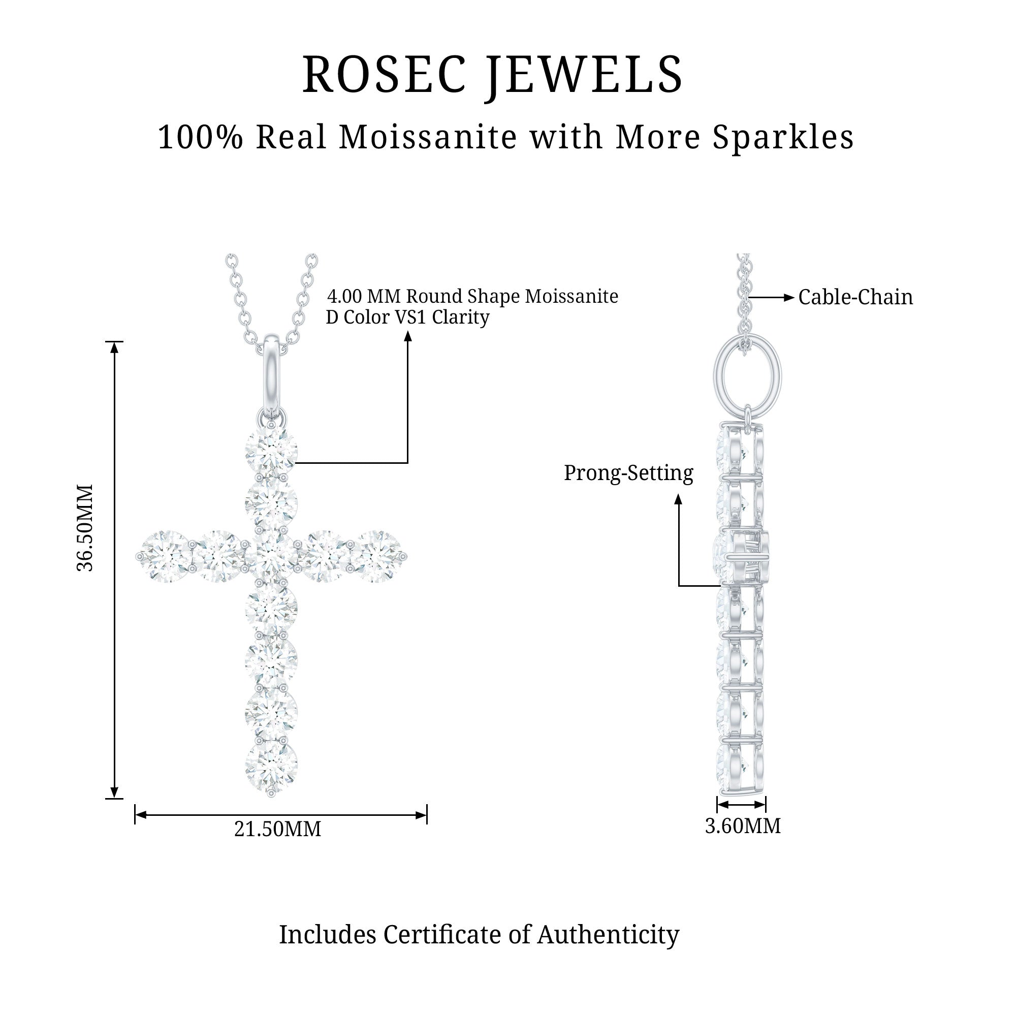 Keep your belief close to your heart with this Moissanite Cross Pendant, crafted with 14K White Gold Plated Silver. The pendant features Round Shape Moissanite embedded on the metallic cross frame in Prong Setting. The Necklace is accentuated with a standard bail that dangles in a sturdy chain, beholding the shine of D-VS1 Quality Moissanite. This Christian Cross Necklace is the symbol of divinity, blessing, and grace, which can be presented to your special one on occasions such as Christmas, birthdays, and graduation.