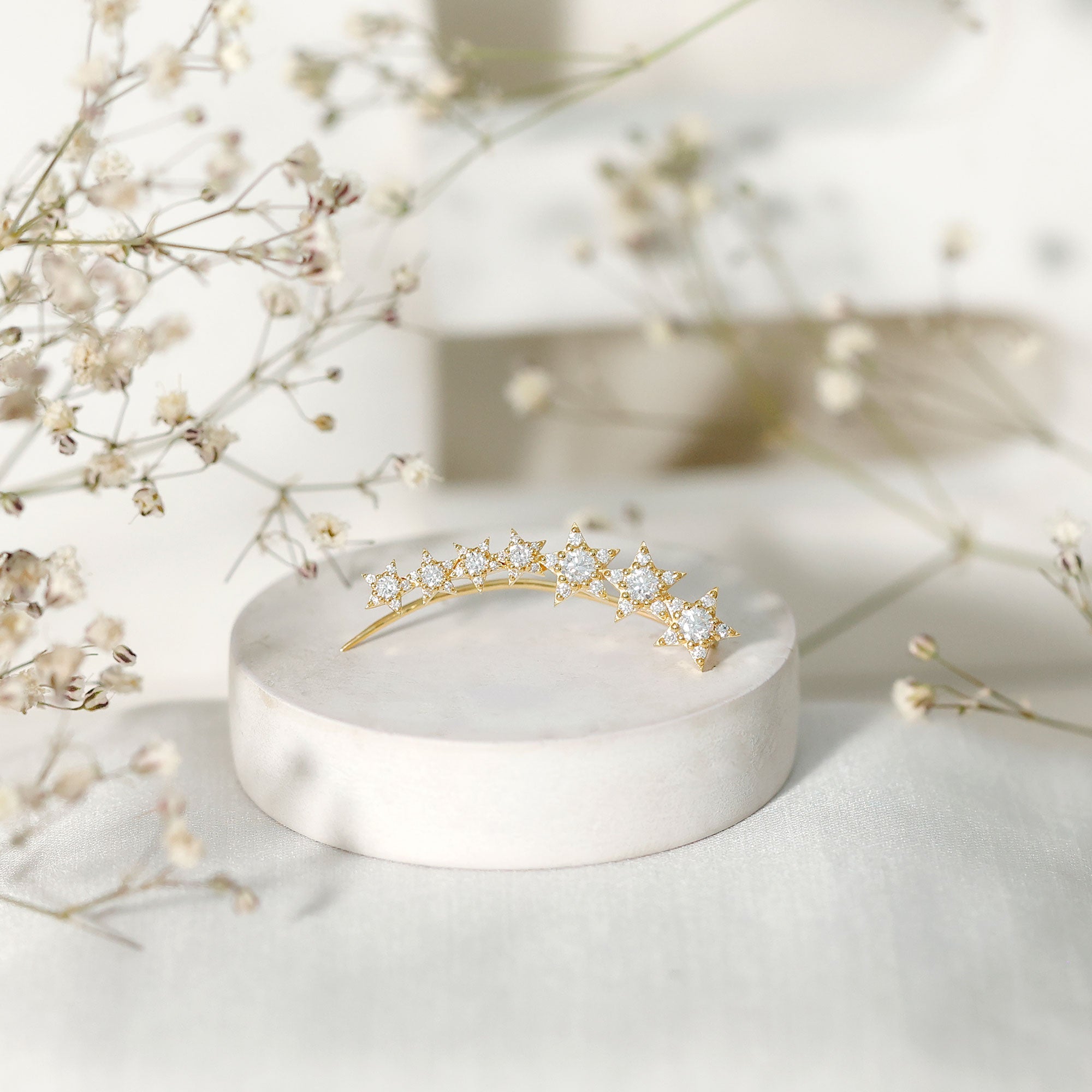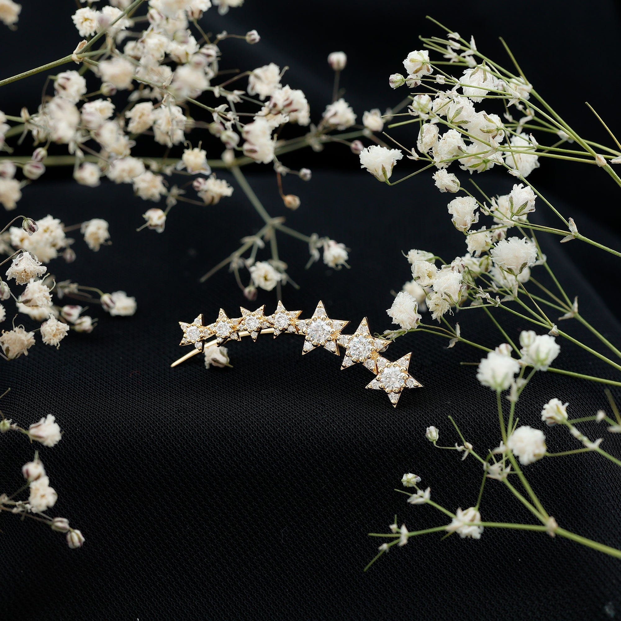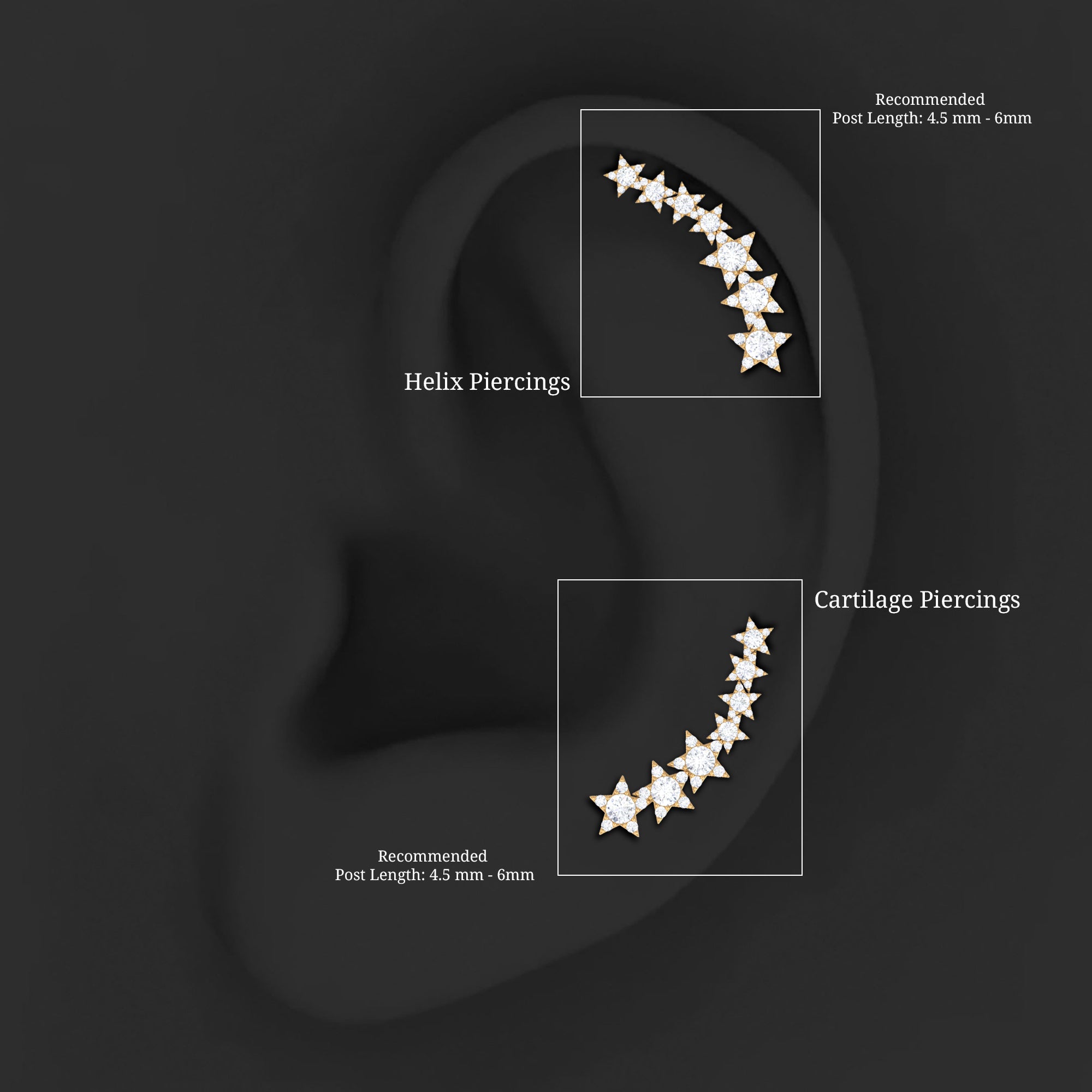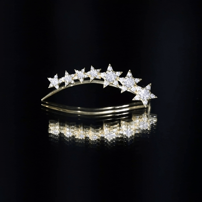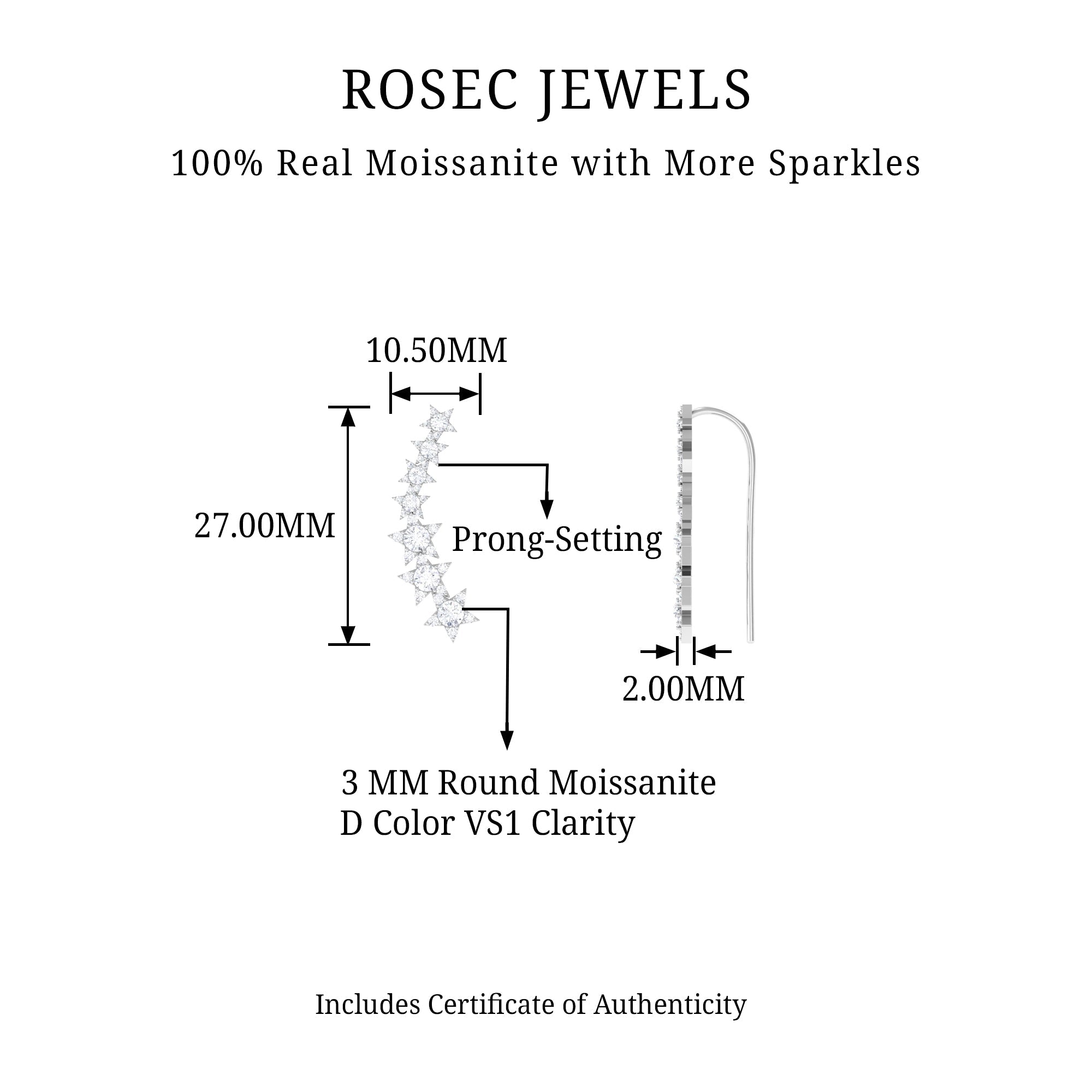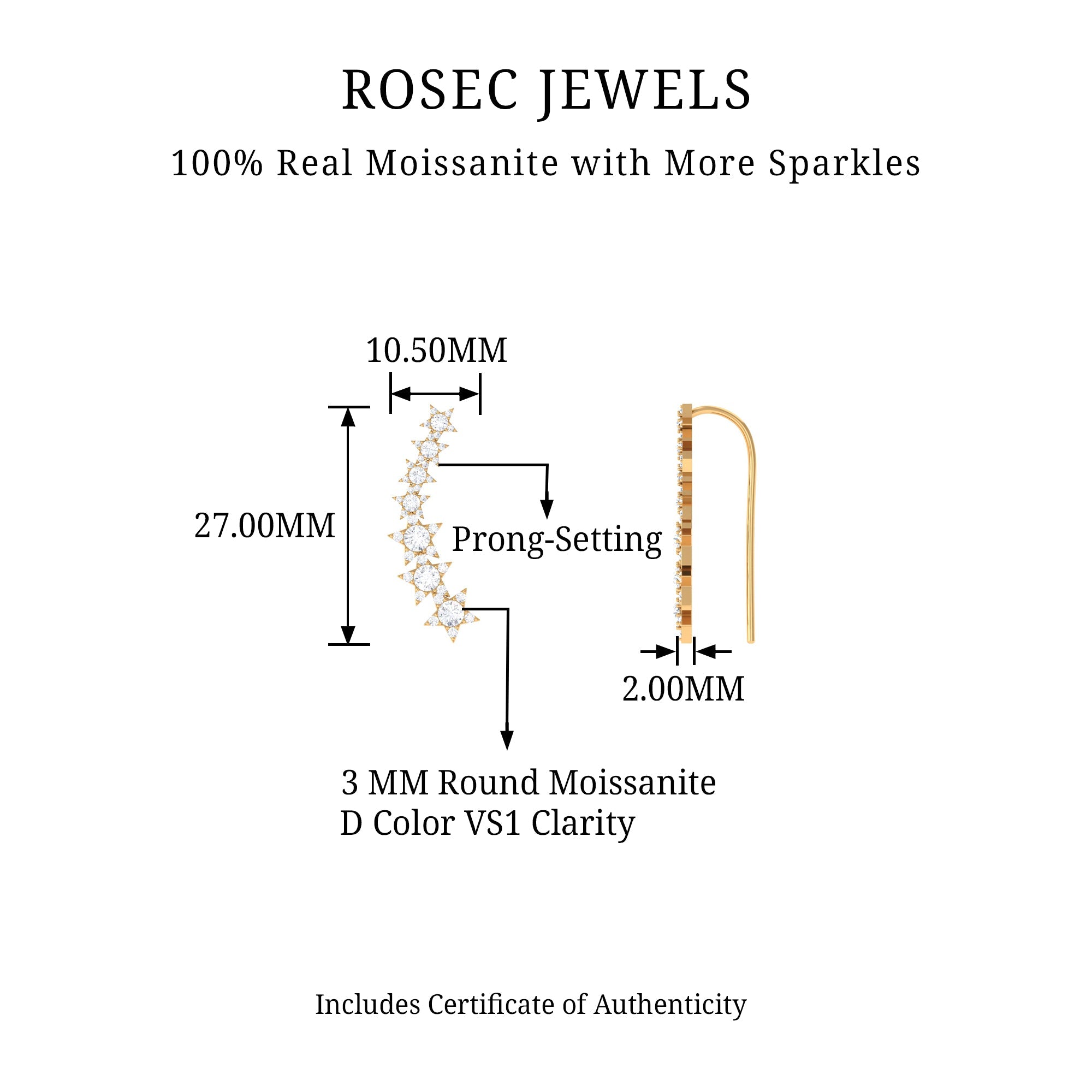 This Moissanite Star Climber Earring features Round Cut Moissanite studded on a gold star design. The earring is specifically designed for cartilage, helix, and upper lobe piercings, ensuring a comfortable and secure fit. Whether youre dressing up for a special occasion or adding a touch of sparkle to your everyday look, this crawler earring is sure to impress.