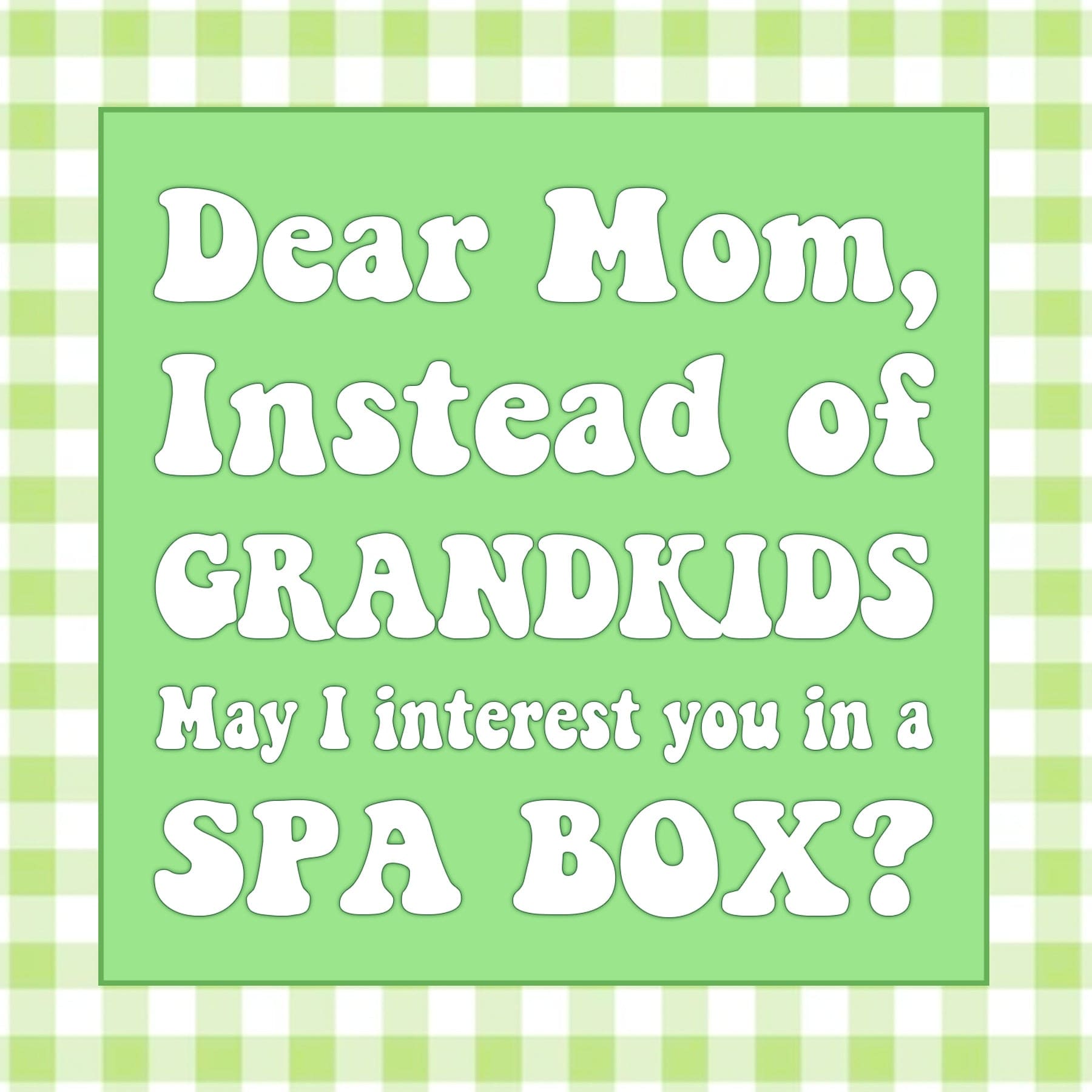 Mom Quote: Dear mom, Instead of grandkids may I interest you in a Spa Box?