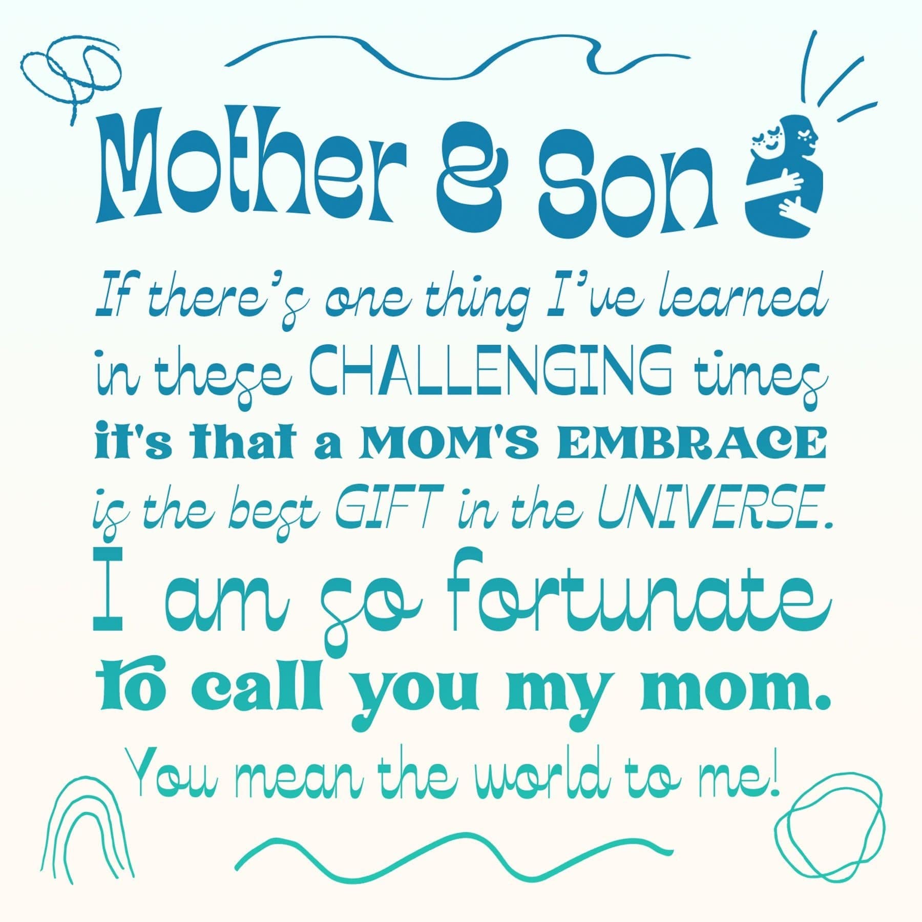 Mother and Son Quote: Mother & Son - If there's one thing I've learned in these challenging times it's that a Mom's embrace is the Best Gift in the universe. I am so fortunate to call you my mom. You mean the world to me!