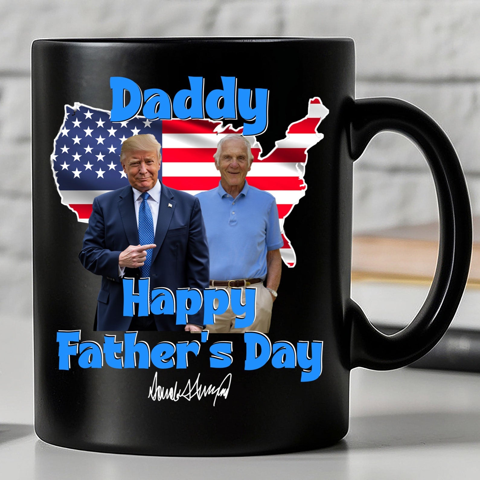 Introducing Our "My Mom With Donald Trump" Custom Black Mug! This unique design features a vibrant backdrop of the US map, with President Donald Trump standing proudly. What sets this mug apart is the option to upload your own photo, making it a truly special keepsake for any occasion. Customize the text and name to create a heartfelt gift for your mom or a memorable piece for yourself. Ideal for family gatherings, political events, or simply to express your support, this black mug is a must-have for any Trump enthusiast. Order yours today and showcase your pride in style!