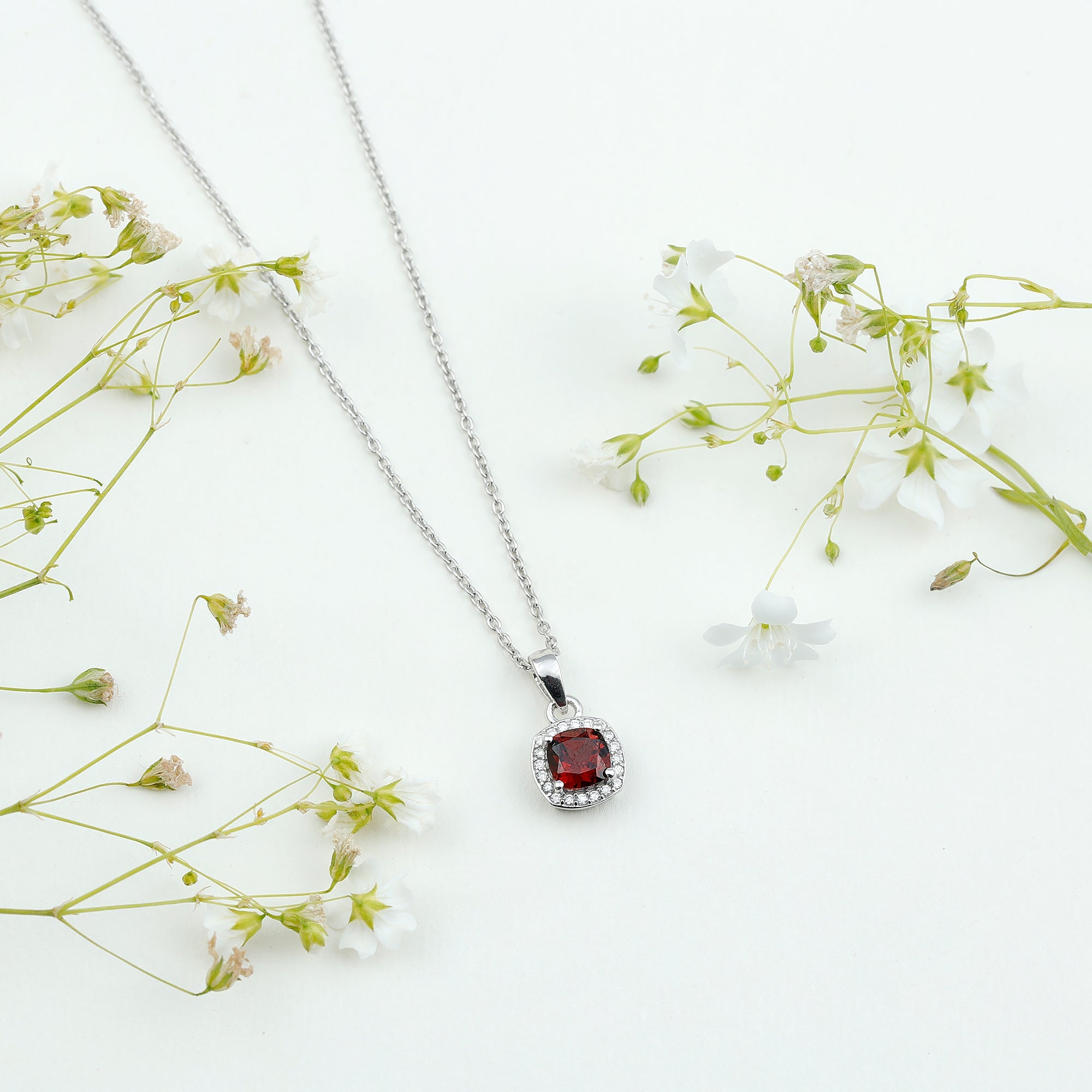 This Halo Pendant Necklace shines with a rich red hue of AAA quality Garnet, making it an ideal choice for a bold fashion statement. Made from 14K White Gold Plated Silver, it features an 8 MM Cushion Cut Garnet set securely in prong setting, framed by smaller Moissanite Stones in a halo design. Its a stunning piece for any jewelry lover. The Red Gem Necklace hangs from a standard bail and is attached to a durable cable chain. With its classic and minimalist style, this Real Garnet Necklace symbolizes love and devotion, making it a perfect gift for someone special. The vibrant red of the garnet beautifully contrasts with the white gold and the halo of Moissanites. It is destined to be a cherished part of any jewelry collection, ideal for those who love the elegance of fine jewelry. It adds a touch of luxury to both everyday outfits and special occasions. Additionally, this Garnet Silver Necklace is a fantastic gift for January birthdays or to celebrate significant milestones together. It exudes a royal charm and has a seamless shine. We send this beautiful and luxurious pendant necklace in a high-quality velvet pouch along with a certificate of authenticity.