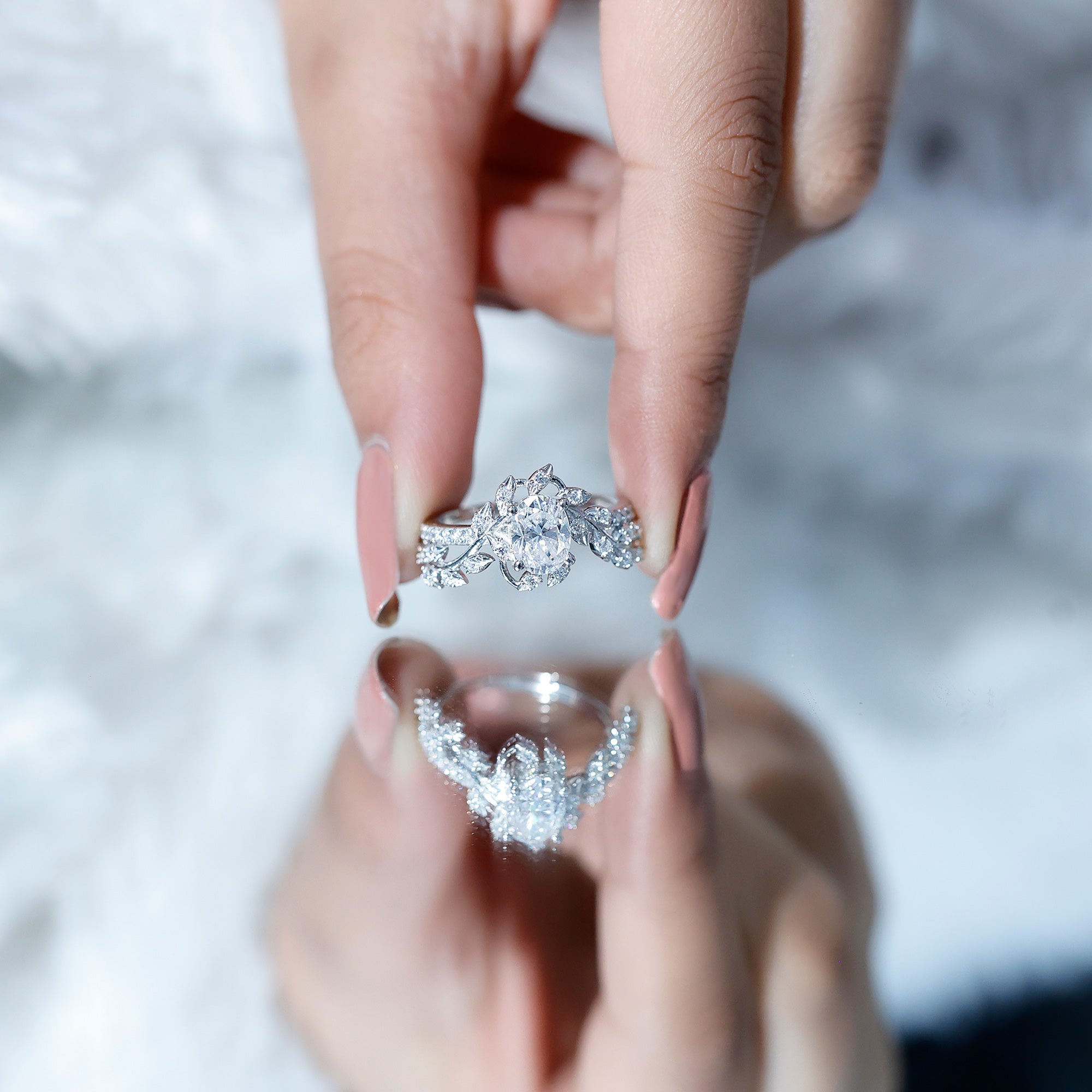 Directly picked from the garden of gemstones, this Moissanite Engagement Ring will definitely win her heart with its nature-inspired beauty. An Oval Shaped Moissanite is set in between floral leaf branch studded with petite round gemstones, seems like flower and leaves are covering the finger. The ring is crafted with 14K White Gold Plated Silver, featuring a 6X8 MM Oval Shape Moissanite securely placed in Prong Setting. This Flower Engagement Ring holds an adorable shine of D-VS1 Quality, which makes it perfect for the big day. This Nature Inspired Ring will be delivered to you in a velvet pouch with the certificate of authenticity.