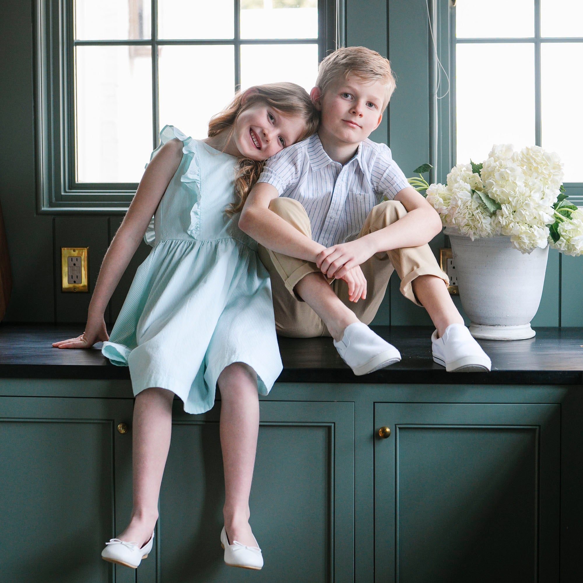 Our pretty flutter sleeve dress in soft organic cotton seersucker is a statement piece she'll want to twirl in all spring and summer long. Features flutter sleeves along a pinafore bodice, a pretty open back with button closure at the neck, and an elastic waist for easy dressing. Lined at the bodice in 100% organic cotton.