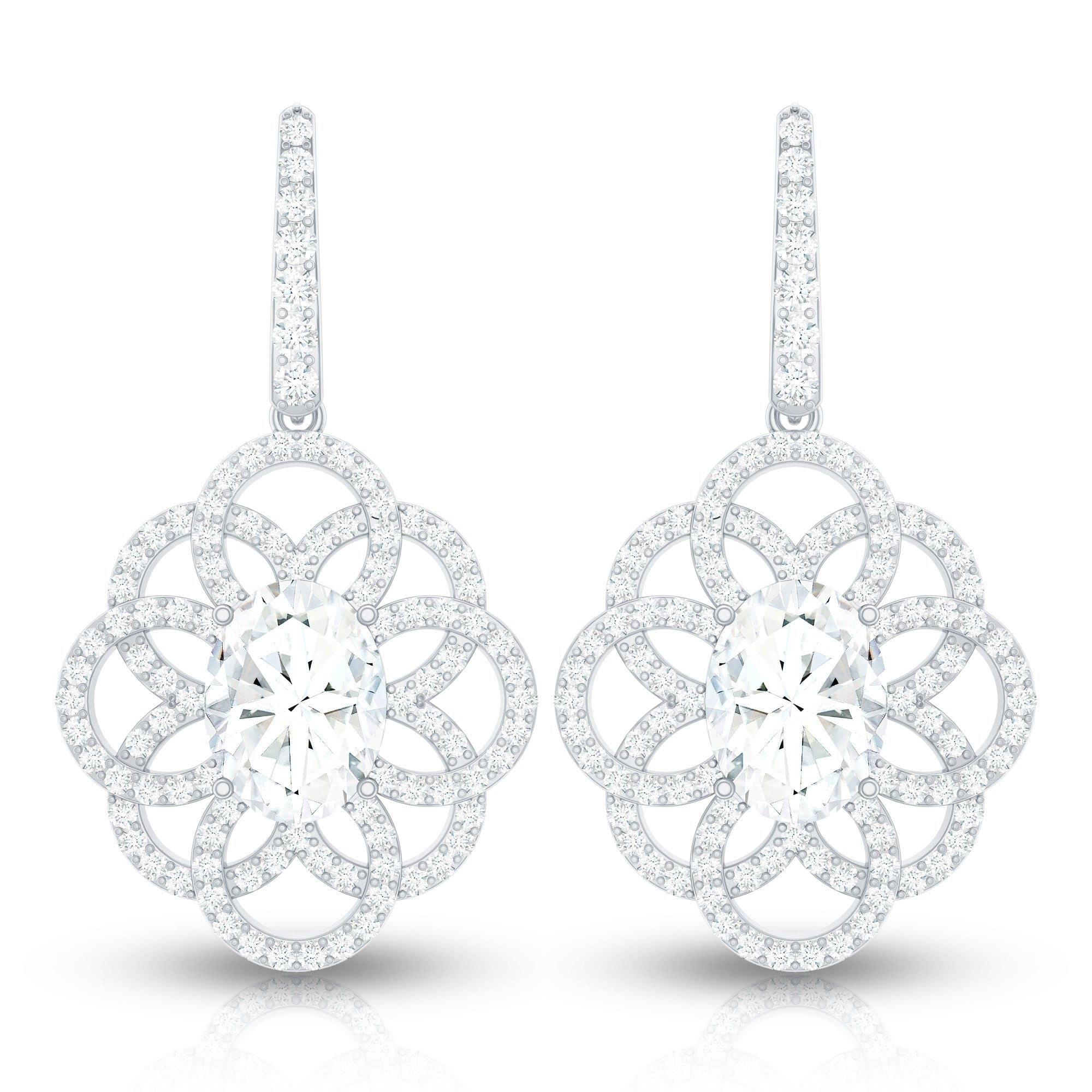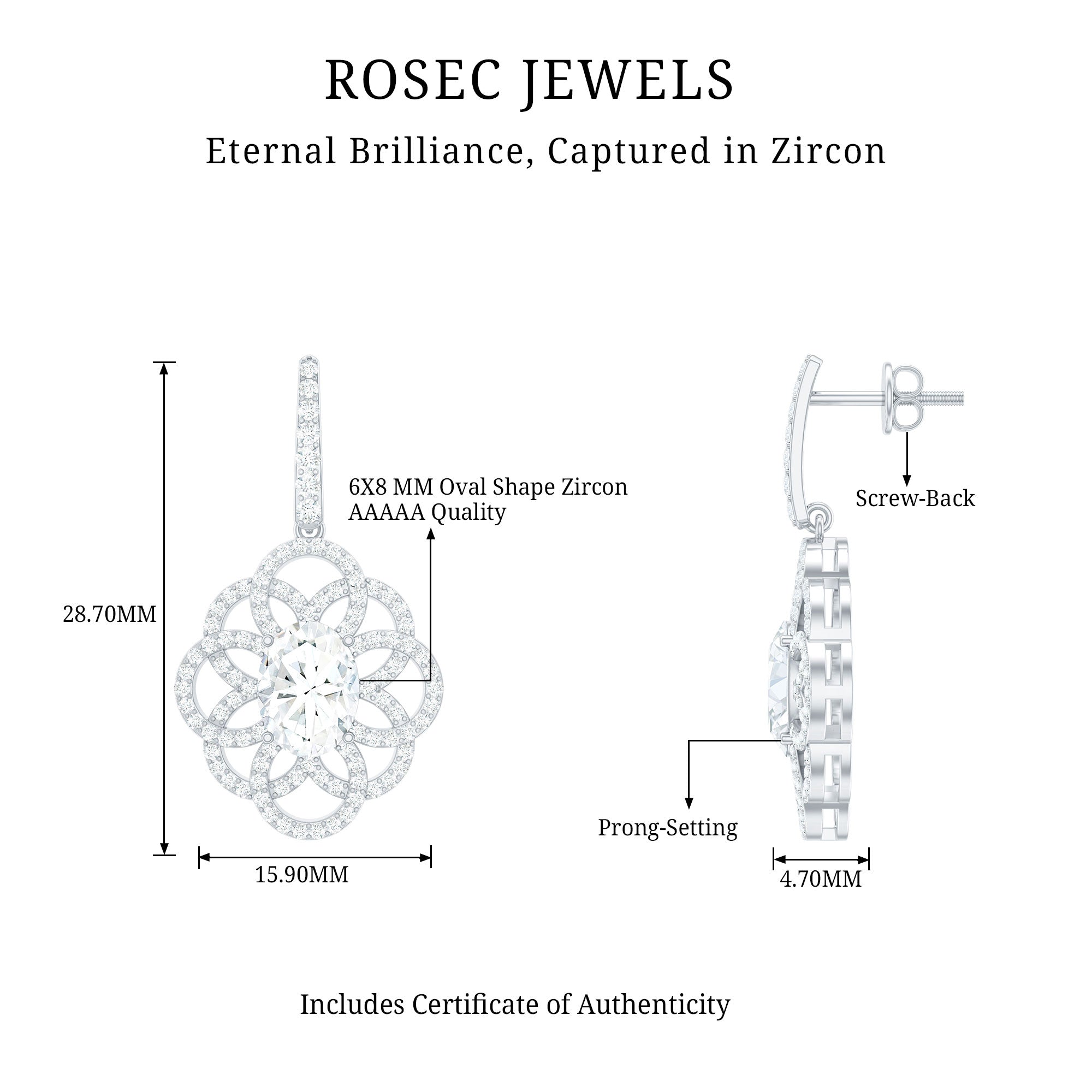 Make your ears adorned with these CZ Drop Earrings, crafted with 14K White Gold Plated Silver. The earrings feature a 6X8 MM Oval Shape Zircon of AAAAA Quality placed between the intricate flower motif studded with smaller stones. These Drop and Dangle Earrings can be paired with outfits for cocktail parties. These Flower Drop Earrings can be presented to your lady love as a symbol of love that will invoke the inner radiance. The dangling earrings will be delivered to you in a signature velvet pouch.