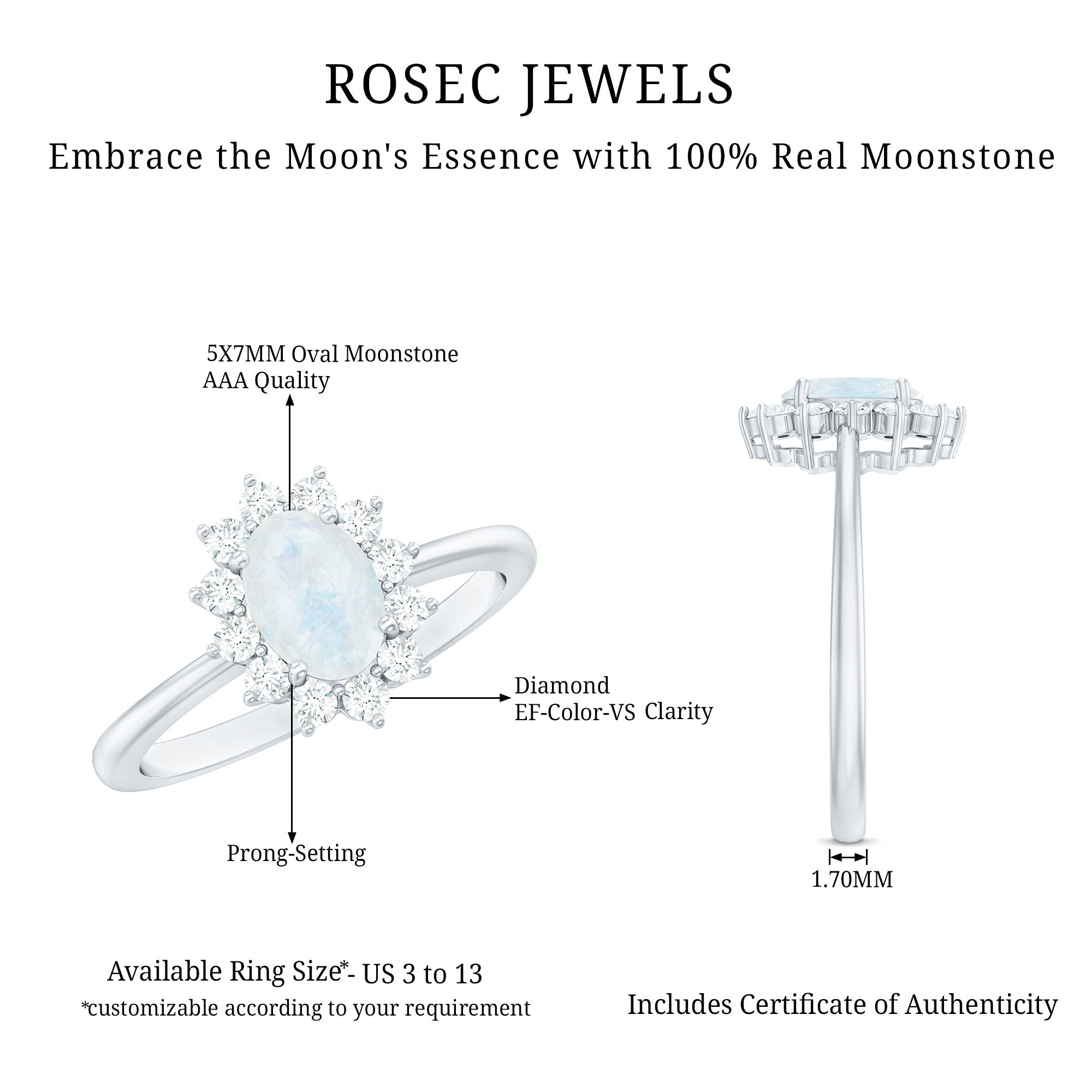 Oval Cut 5X7 MM Moonstone and Diamond Halo Engagement Ring ‐ AAA / 92.5 Sterling Silver / 7