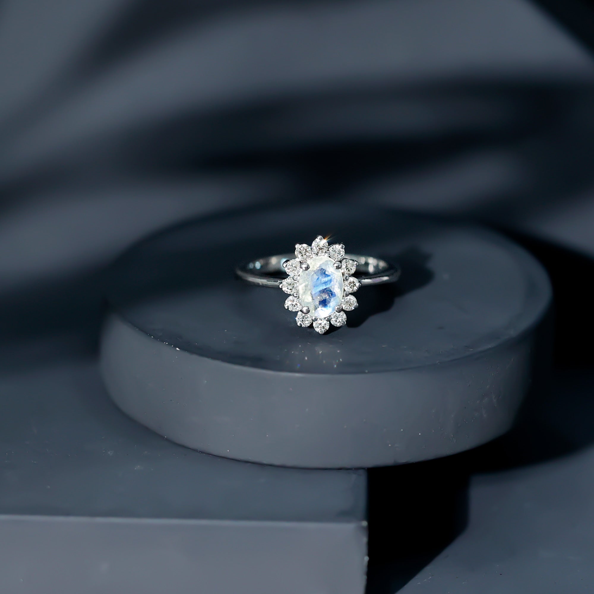 Oval Cut 5X7 MM Moonstone and Diamond Halo Engagement Ring ‐ AAA / 92.5 Sterling Silver / 5.5