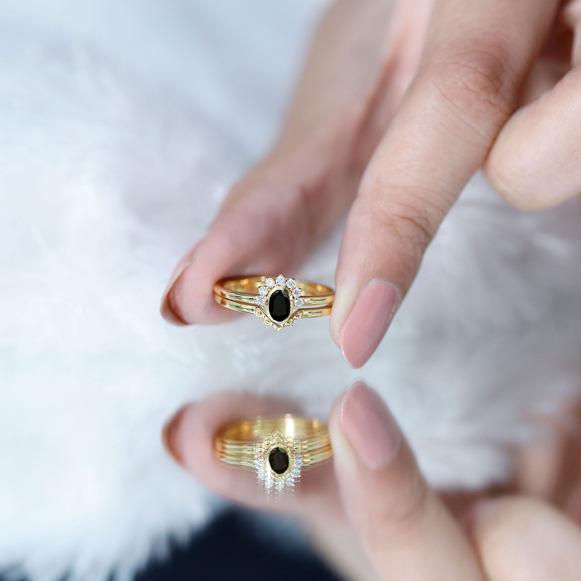 Bold, elegant, and effortlessly timeless, this Black Onyx Bridal Ring Set is the perfect choice for brides who love to make a quiet yet powerful statement. With a simple yet modern design, this Oval Wedding Ring Set is crafted to reflect strength, confidence, and understated beauty, ideal for anyone who prefers a sleek and minimal look. Handcrafted in yellow gold plated silver, the ring features a 3X5 MM oval shaped Black Onyx set securely in bezel setting. Its dark hue is beautifully framed by a delicate half halo of round lab-grown diamonds that add brilliant sparkle. The overall design feels both modern and vintage-inspired, giving it timeless charm. Paired with a V-shaped enhancer band, this Engagement Ring with Enhancer forms a seamless and stylish stack that adds elegance and edge to your bridal look. The band gently curves to nest perfectly against the engagement ring, completing the design with balance and harmony. Whether you are walking down the aisle, marking a milestone, or simply expressing your unique style, this Promise Engagement Wedding Ring Set brings character and grace to any occasion. It is also a meaningful gift for someone who values bold elegance and wants something a little different from the usual sparkle.