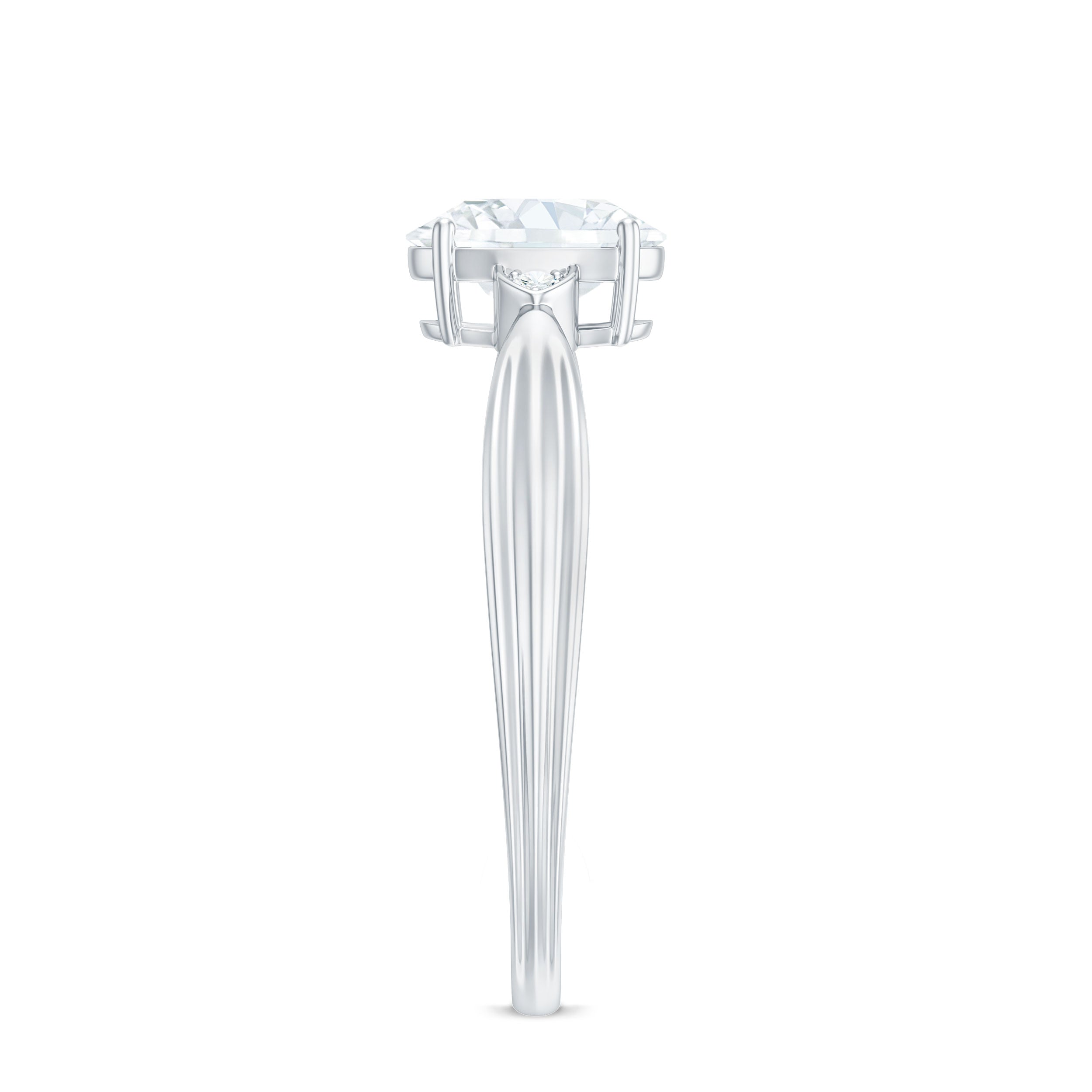 Embrace the allure of understated elegance with this exquisite solitaire ring, showcasing a captivating oval Lab Grown Diamond at its core. Complemented by smaller Lab Grown Diamonds on each side, this design exudes timeless beauty and charm. It becomes an enduring symbol of love and commitment. Perfect for the modern bride who appreciates simplicity and grace, this ring captures the essence of everlasting love.