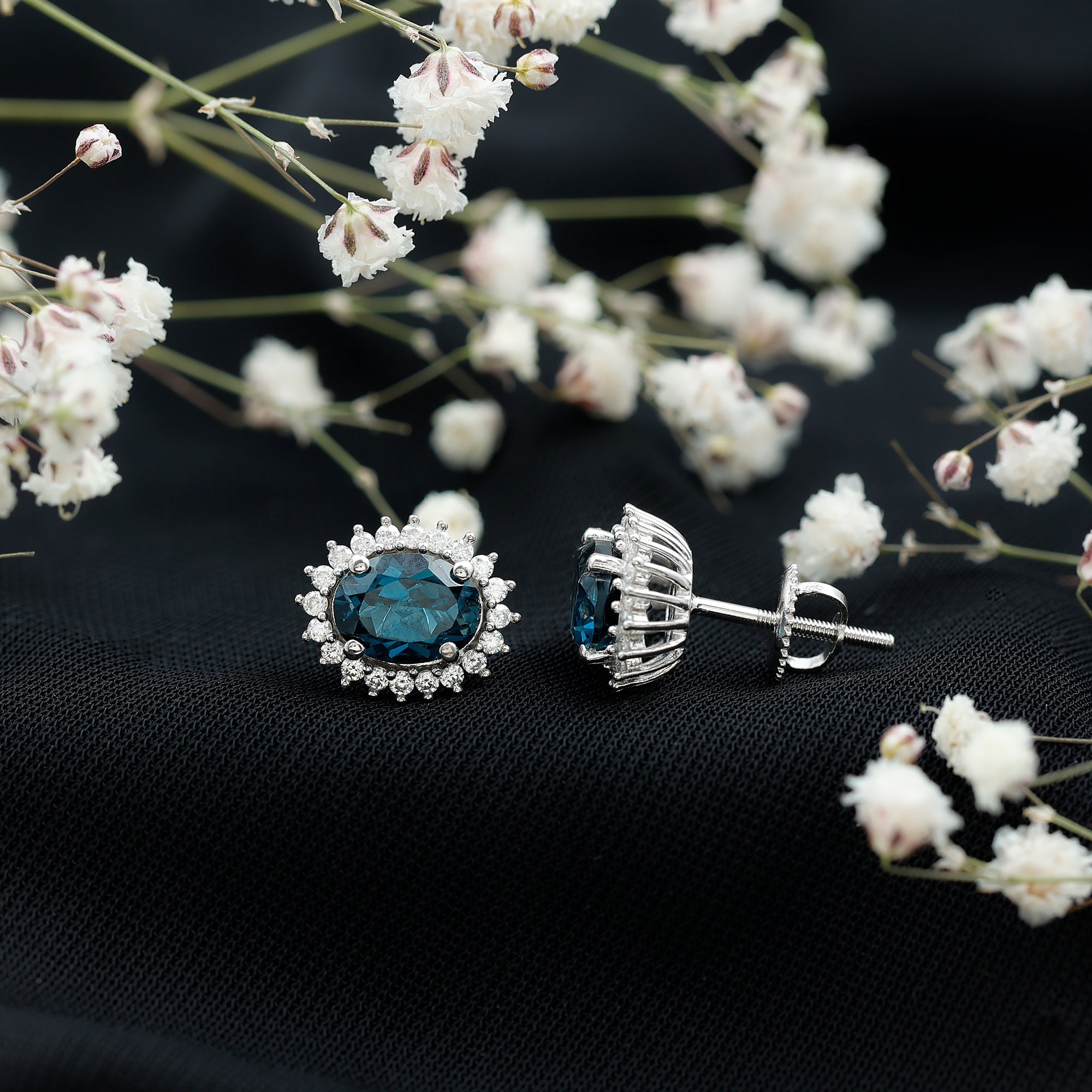 Add a deep blue allure of these London Blue Topaz Stud Earrings to your outfit. The earrings are precisely crafted with 14K White Gold Plated Silver and feature a 6X8 MM Oval Shape London Blue Topaz of AAA Quality encircled with smaller Moissanite stones of D-VS1 Quality securely placed in Prong Setting. These Halo Stud Earrings will complete the look with a dazzling shine and can also be a thoughtful gift for your wife or mother on their special occasions. These Earrings with Screw on Backs will stay on place throughout the day and will be delivered to you in a signature jewelry pouch along with the certificate of authenticity.