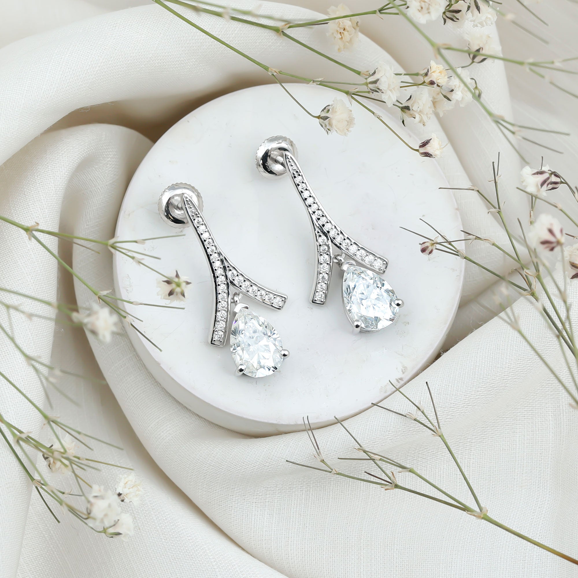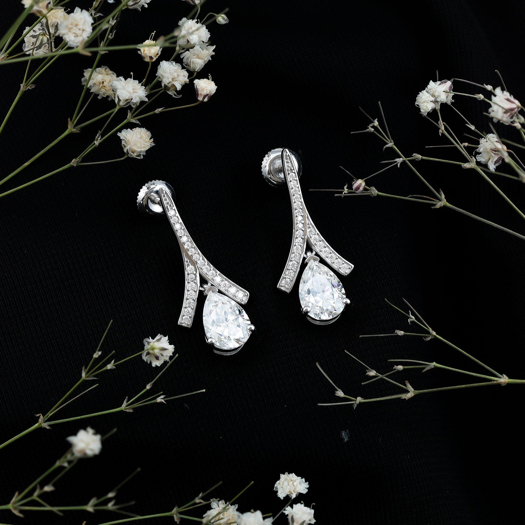 Make your Wedding day look perfect with these Moissanite Drop Earrings, crafted with 14K White Gold Plated Silver. These earrings feature Y-shaped metallic frame studded with smaller Moissanite on top. An 7X10 MM Pear Shape Moissanite secured in Prong Setting is dropping down from the reverse Y Motif. These Drop Dangle Earrings carry the radiance of D-VS1 Quality Moissanite, which not only makes the look complete but also makes you feel like a queen when you walk down the aisle. These Earrings with Screw on Backs will stays on the place throughout the day and will be delivered to you in a signature velvet pouch with the certificate of authenticity.