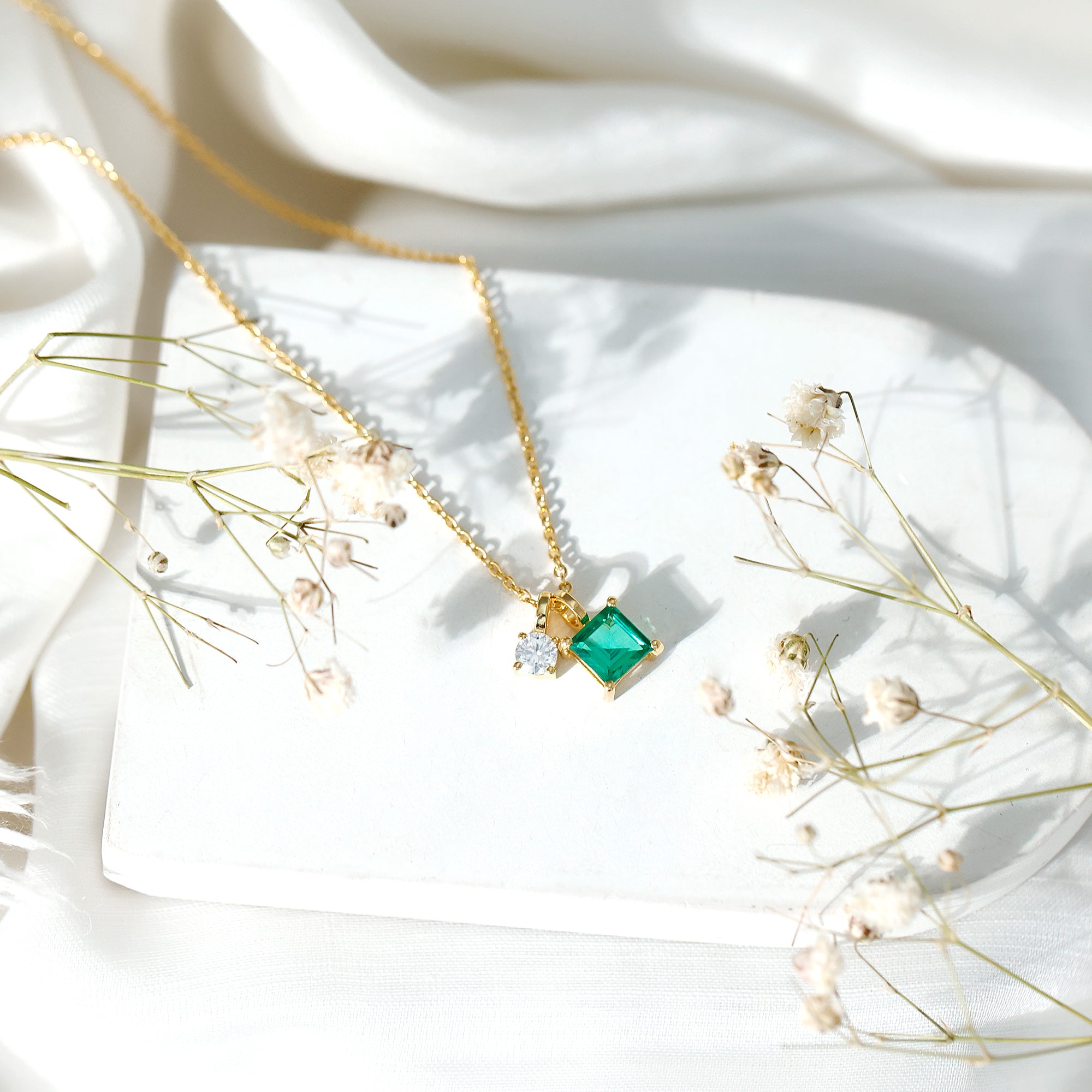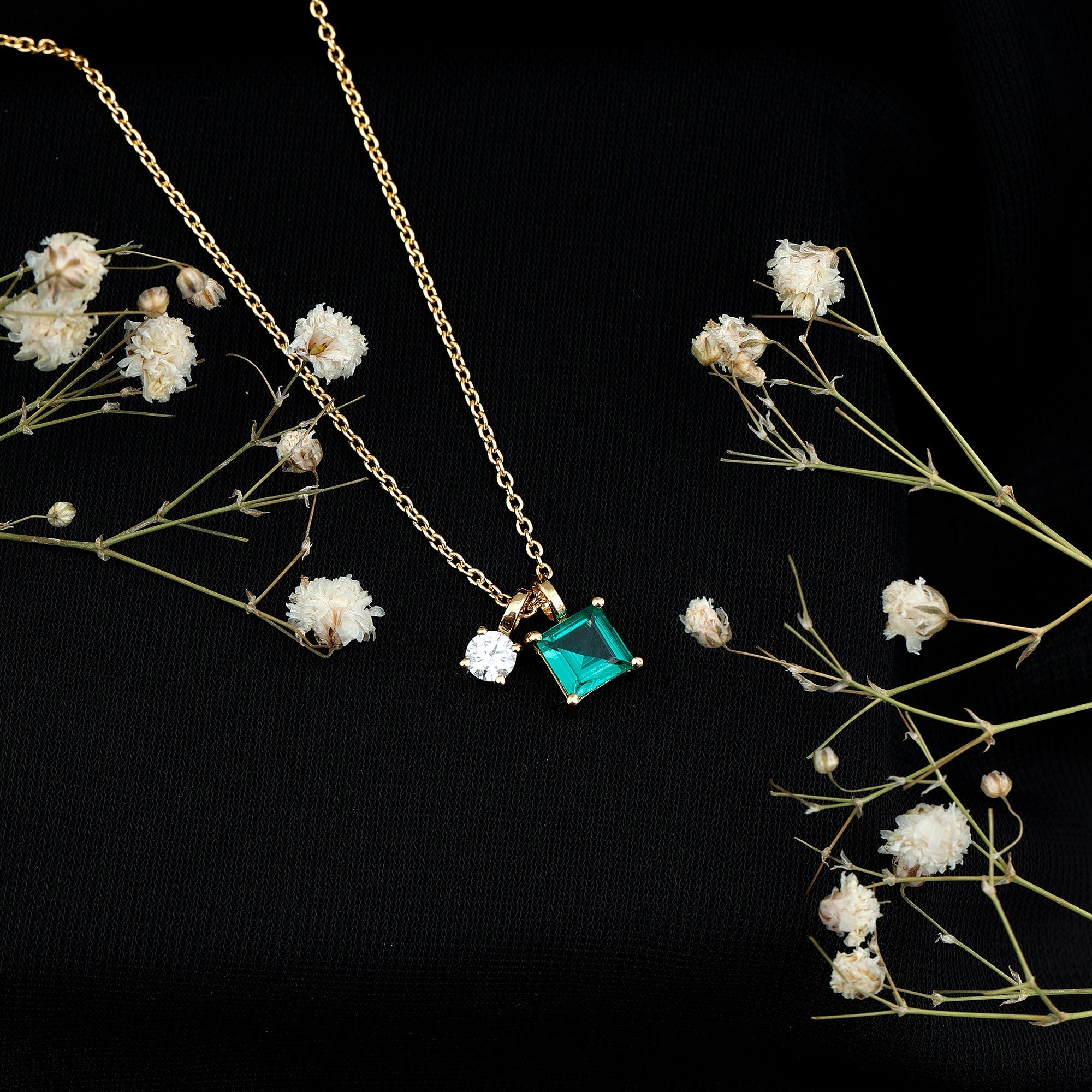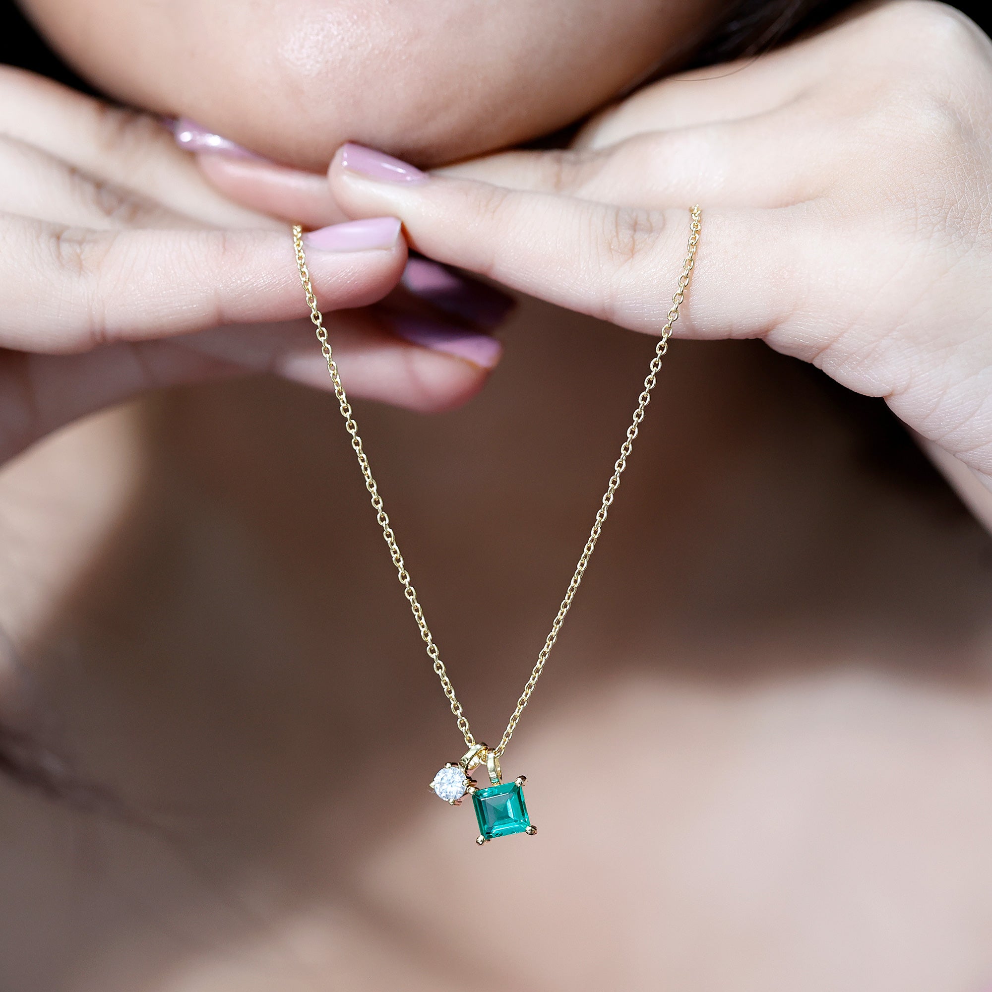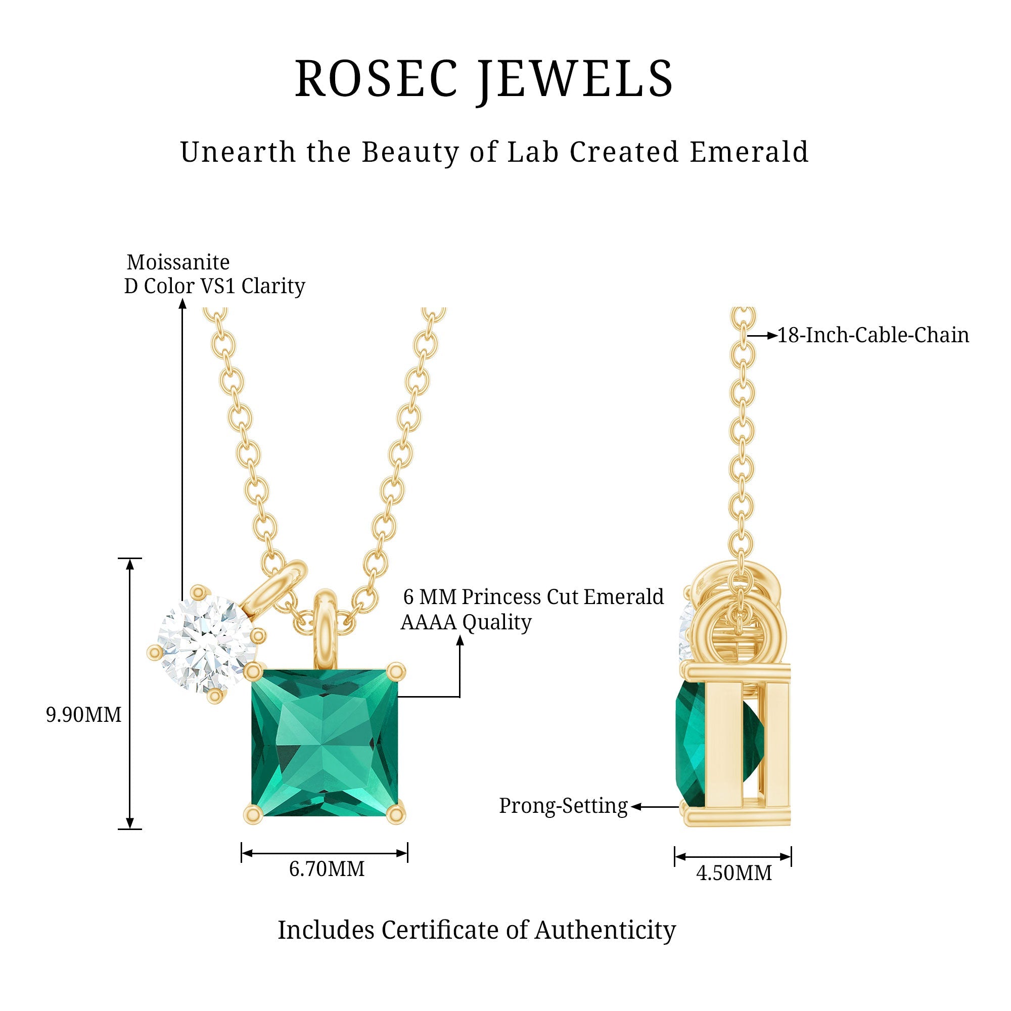 This elegant Lab Grown Emerald Necklace brings modern charm and classic sparkle together in a timeless design you will love to wear every day. Thoughtfully crafted in 14k yellow gold plated silver, the 2 Stone Pendant features a bold 6 MM princess cut lab created emerald set in prong setting. Just beside it, a brilliant 4 MM round moissanite adds a touch of light and fire. The pairing creates a striking contrast and just the right amount of shimmer. Both stones are securely set and dangle from a polished cable chain that sits softly around the neckline. The simple design keeps things light and wearable, while the pop of color from the emerald and the sparkle from the moissanite make it stand out in the best way. The two stone design represents you and your loved one, adding meaning to the necklace. It is a piece that holds its own on a casual day out or adds a personal touch to dressier looks. This Emerald and Moissanite Necklace is also perfect as a gift, thoughtful, stylish, and full of charm. A lovely combination of color and brilliance, this Princess Cut Necklace is a piece you will reach for again and again.