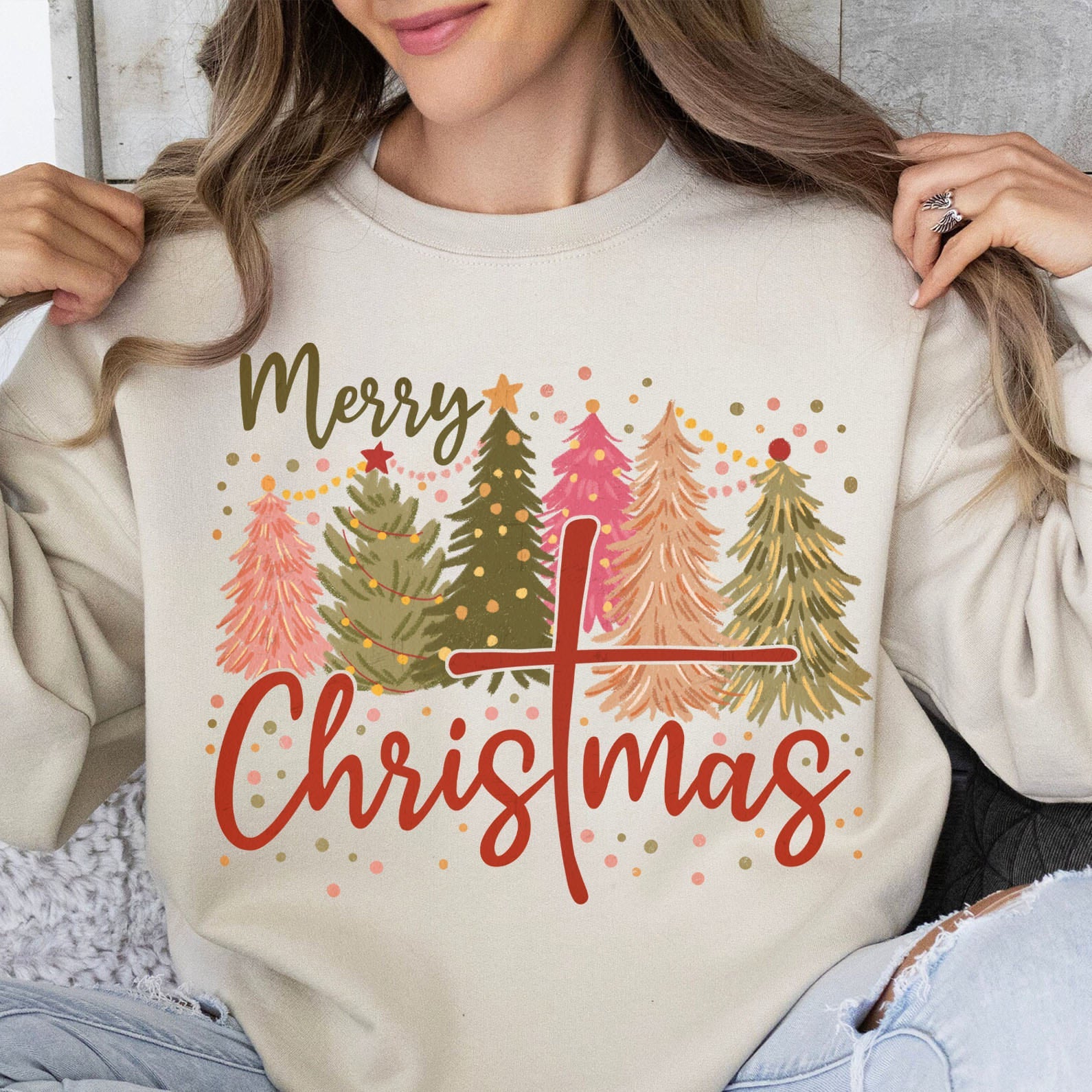 Retro Merry Christmas Shirt, Christmas Cross Sweater, Xmas Tree Holiday Sweatshirt T1650 ‐ Sweatshirt / S Sand / L