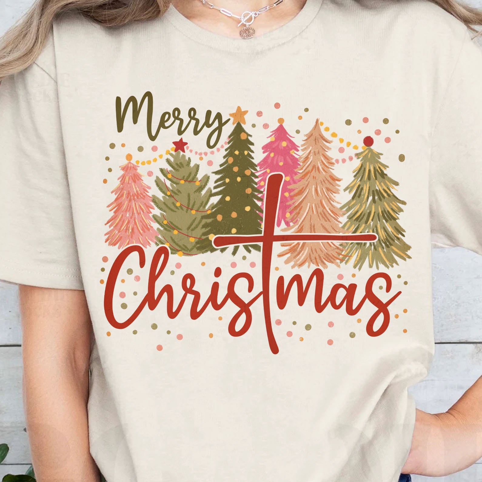 This festive t-shirt design features a charming line of Christmas trees in a variety of vibrant colors, bringing a joyful and seasonal feel to the shirt. Below the trees, the words "Merry Christmas" are displayed in a bold and cheerful font, with a special twist: the letter "T" in "Christmas" is creatively designed to resemble a cross, giving the design a deeper meaning of faith and celebration. This shirt beautifully blends holiday spirit with a subtle nod to religious symbolism, making it perfect for those who want to express both their festive cheer and faith during the Christmas season.