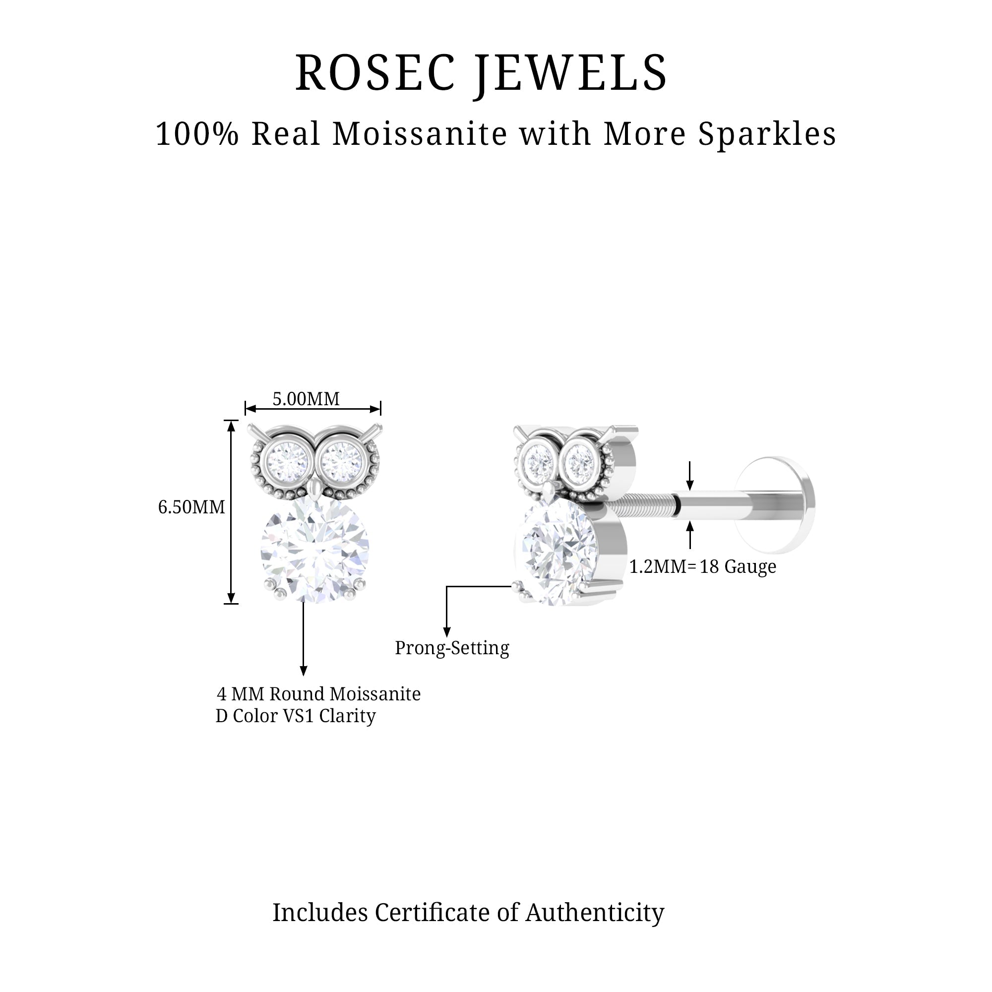 Round Cut Moissanite Owl Earring for Cartilage Piercing ‐ D-VS1 / 18K White Gold / Flat Back 4.5 MM