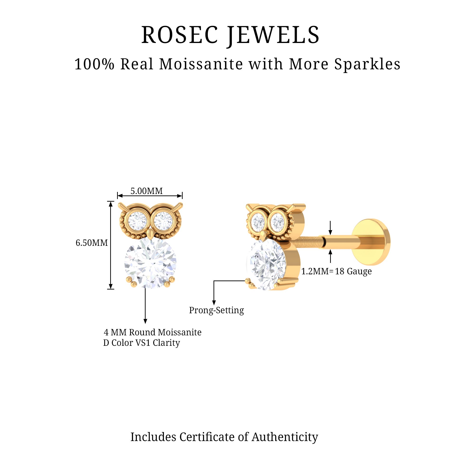 Round Cut Moissanite Owl Earring for Cartilage Piercing ‐ D-VS1 / 18K Yellow Gold / Flat Back 4.5 MM