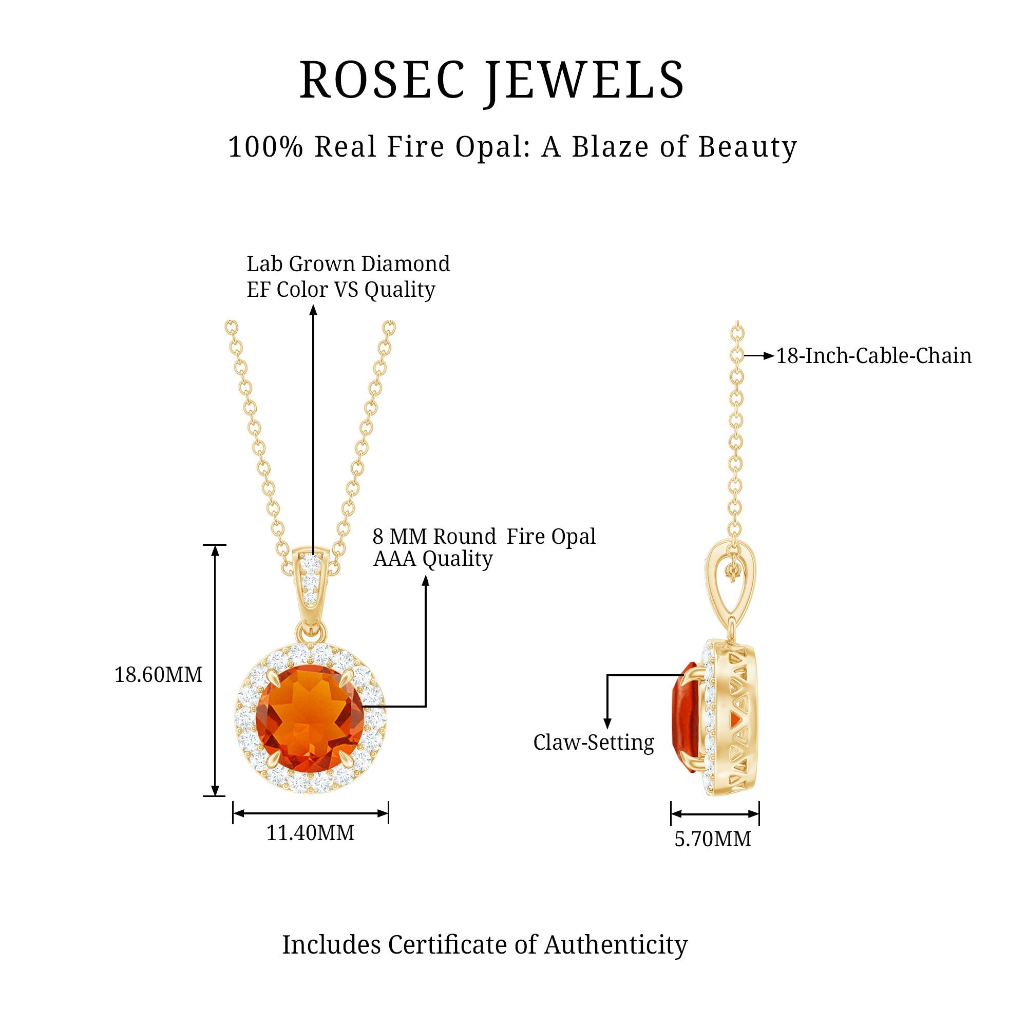 Round Shaped Fire Opal and Diamond Halo Necklace with Chain