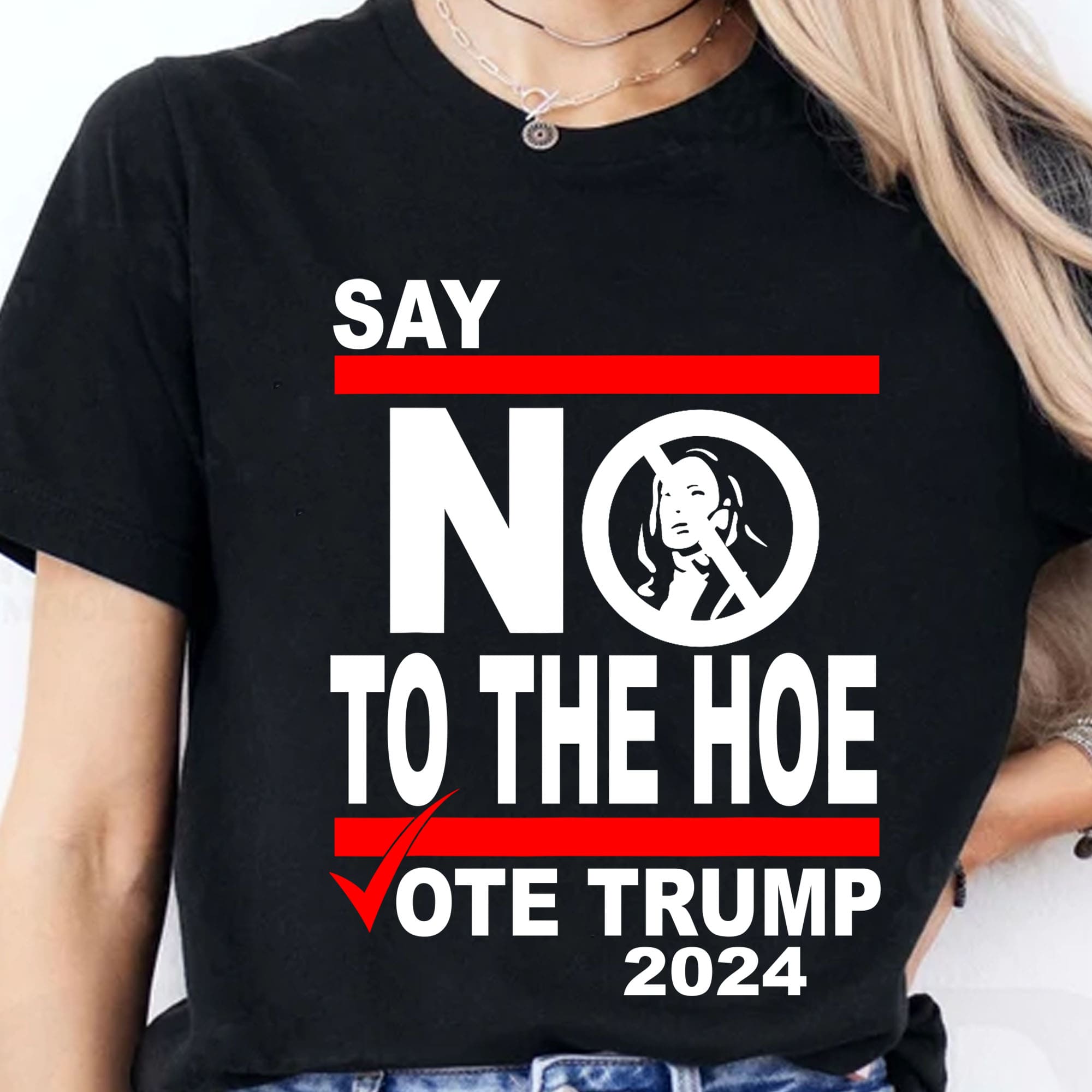 The shirt displays a strong, offensive political message. The large text reads "Say NO to the HOE," with the word "NO" emphasized and featuring an image of Kamala Harris crossed out inside the letter "O." The phrase is printed in bold white font with red accents, including a red line above and below the central message. Below the main text is the slogan "Vote Trump 2024" with a red checkmark next to it. The shirt is designed to criticize Kamala Harris while promoting support for Donald Trump’s 2024 campaign.