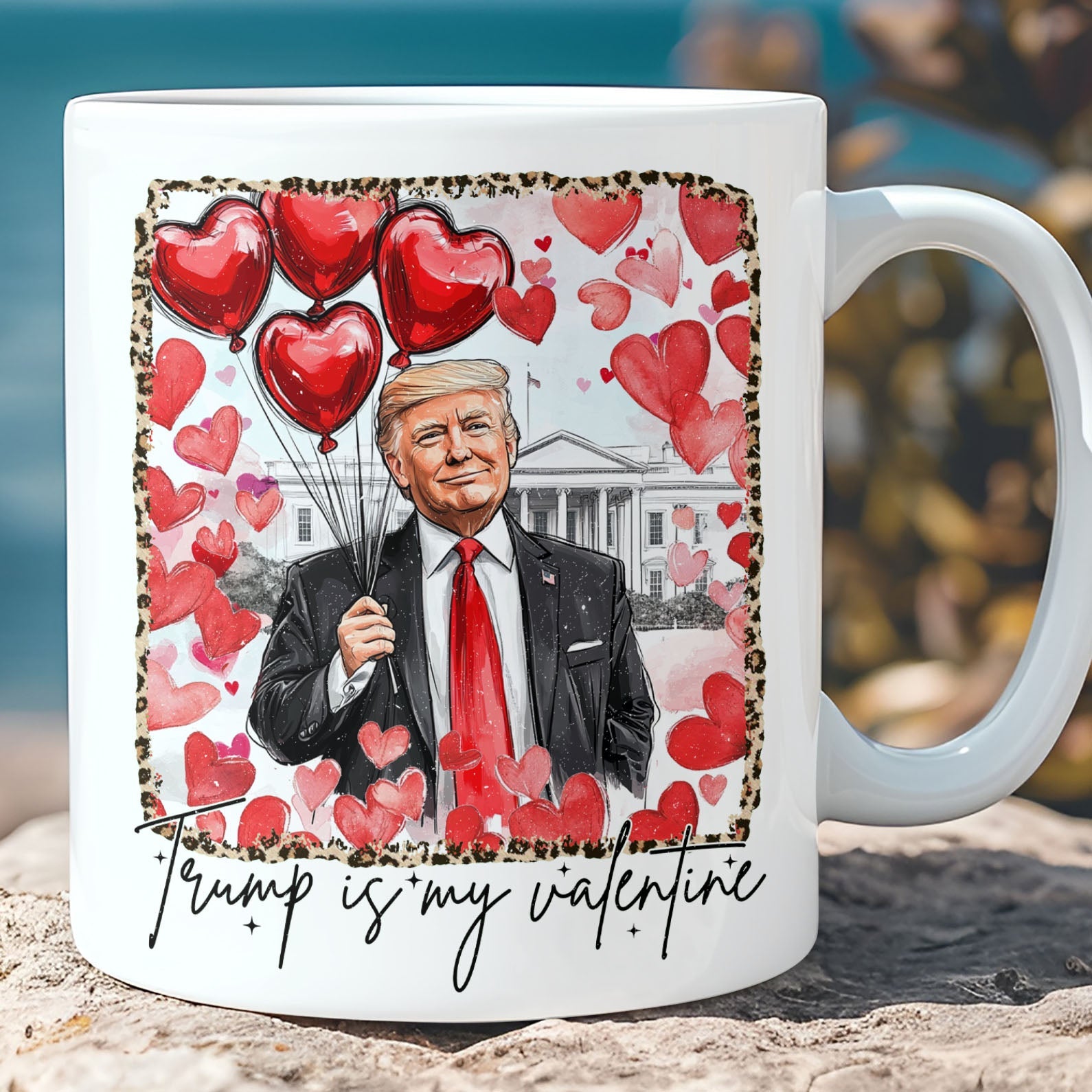 This mug design features a vibrant illustration of Donald Trump in front of the White House, holding a bouquet of shiny red heart-shaped balloons. The background is filled with scattered red hearts, creating a festive, romantic vibe. A leopard print border surrounds the design, adding a stylish flair. Below the illustration, the text "Trump is my Valentine" is written in an elegant, script font, adding a playful and affectionate tone to the overall look. Perfect for Valentine's Day or as a humorous gift for Trump supporters.