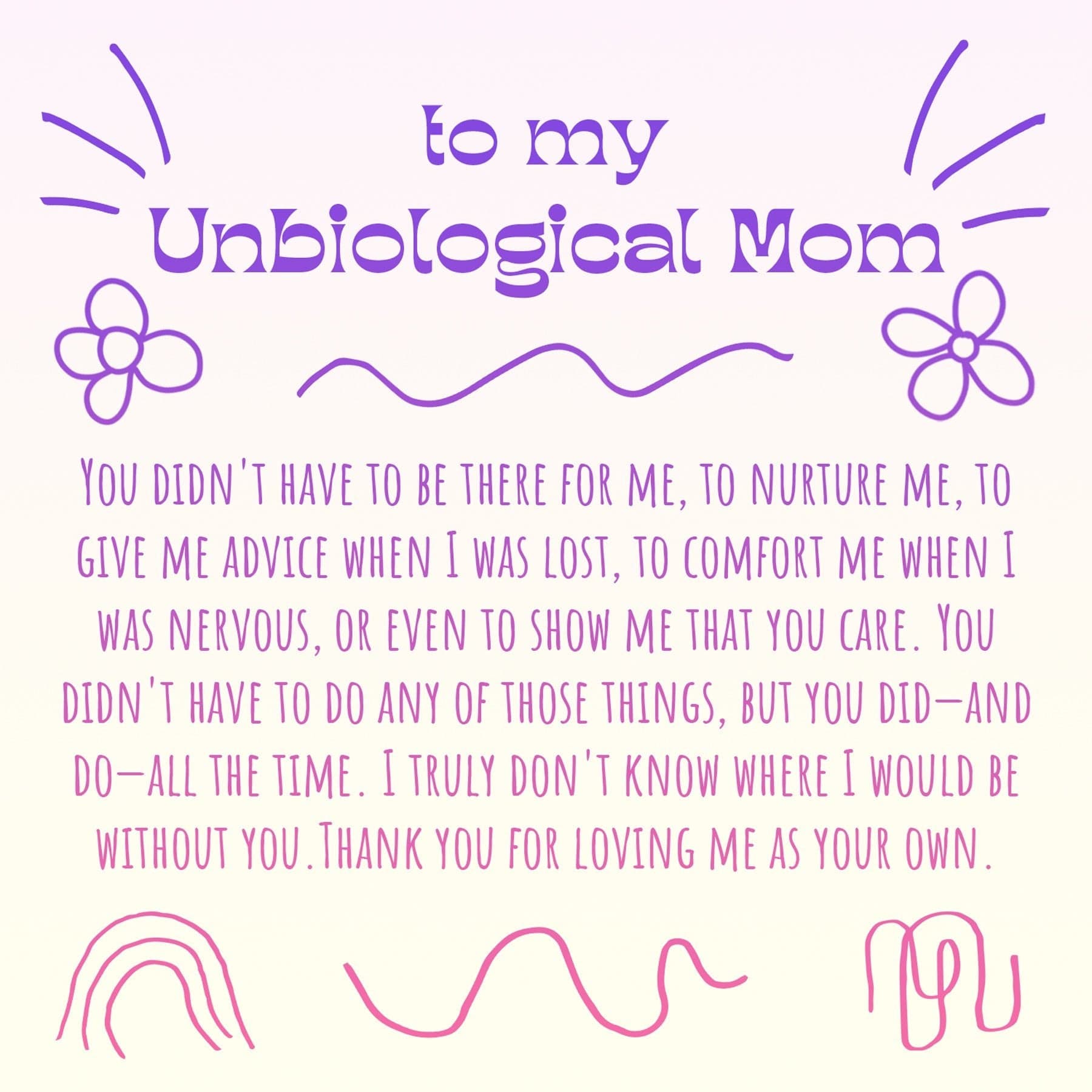 Unbiological Mom Quote: To my Unbiological Mom - You didn't have to be there for me, to nurture me, to give me advice when I was lost, to comfort me when I was nervous, or even to show me that you care. You didn't have to do any of those things, but you did-and do-all the time. I truly don't know where I would be without you. Thank you for loving me as your own.