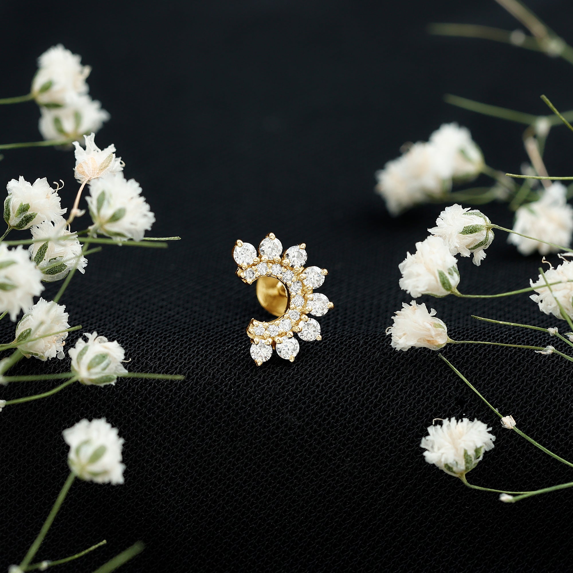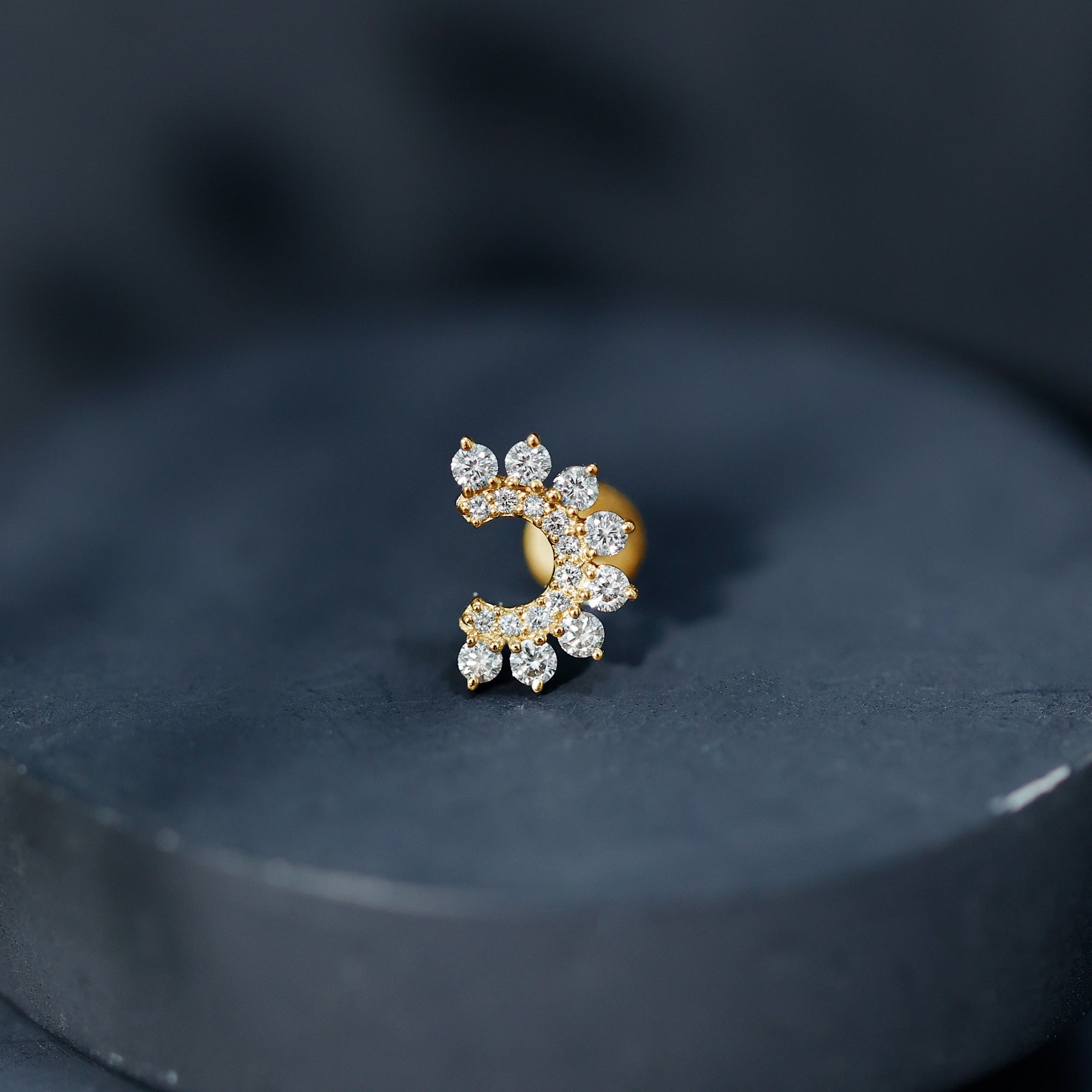 Unique Diamond Curved Earring for Helix Piercing ‐ Natural - ( HI-SI ) / 18K Yellow Gold / Flat Back 4.5 MM