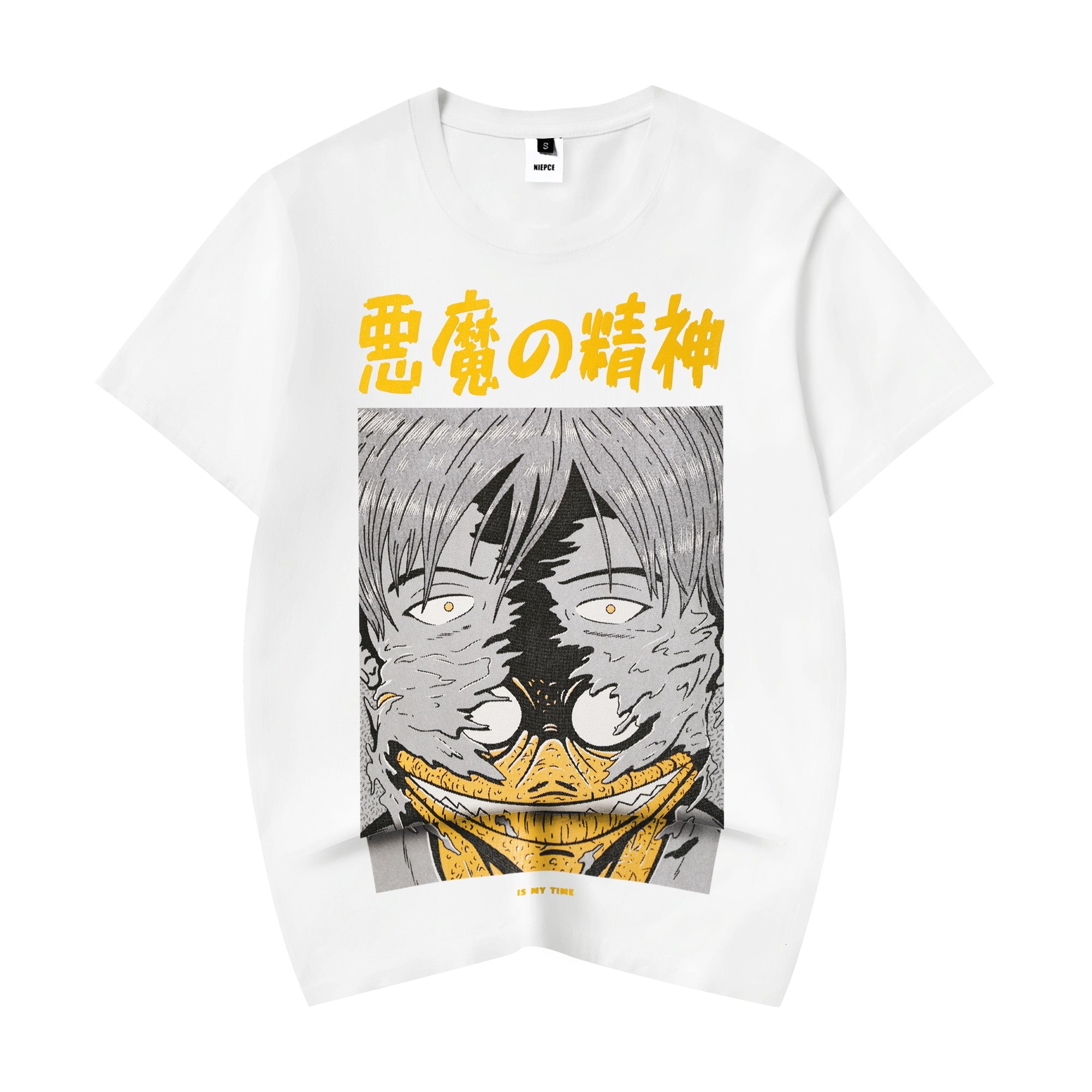 - The short sleeve t-shirt features a Japanese kanji translating to "Demon Energy" and a graphic of a face revealing of the demon hidden within a human face signalling the evilness of many humans