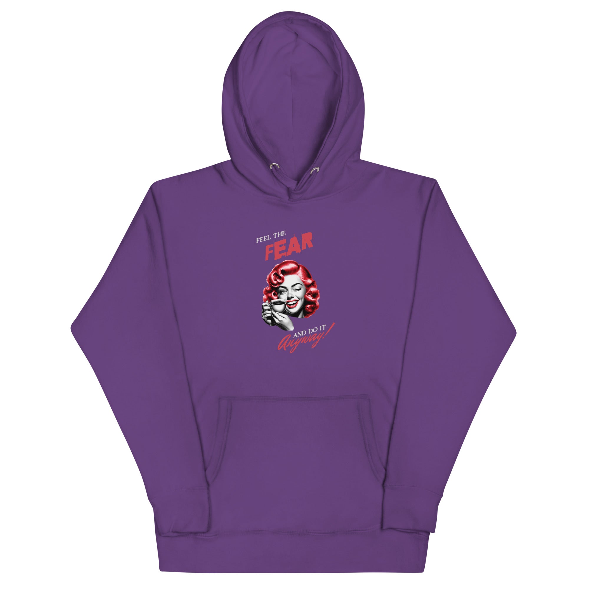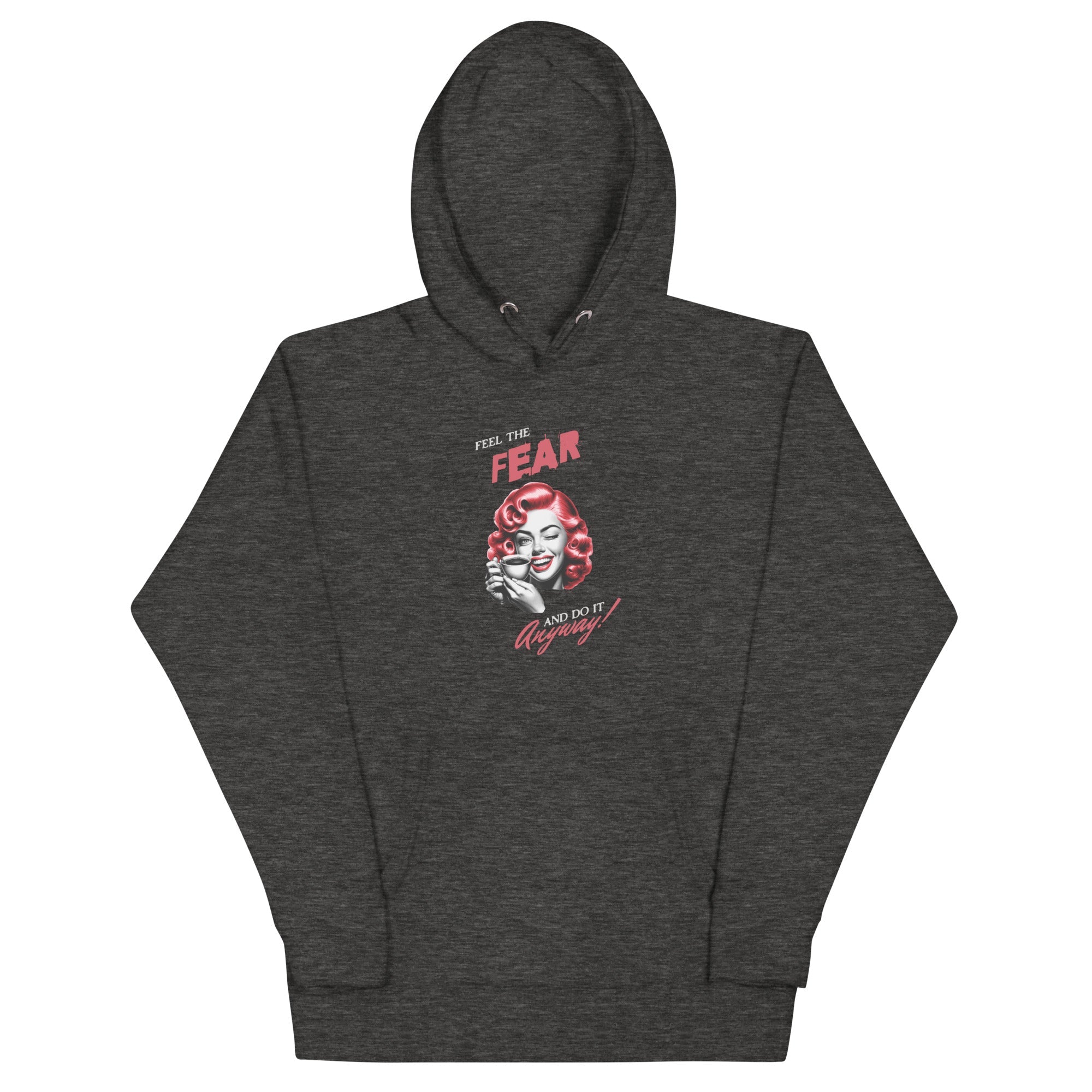 Step into comfort and courage with our impossibly soft hoodie featuring an eye-catching retro 1940s design. The woman confidently holding her coffee cup with a smile, paired with the empowering message "Feel the fear and do it anyway," makes this more than just a hoodie—it's wearable inspiration.