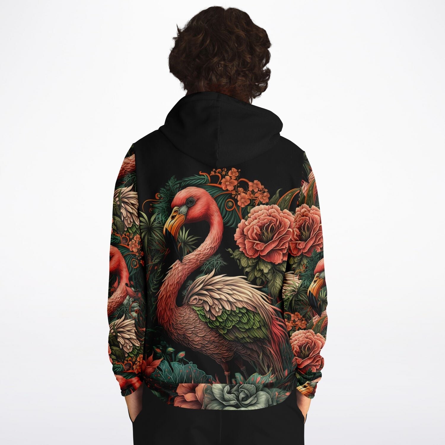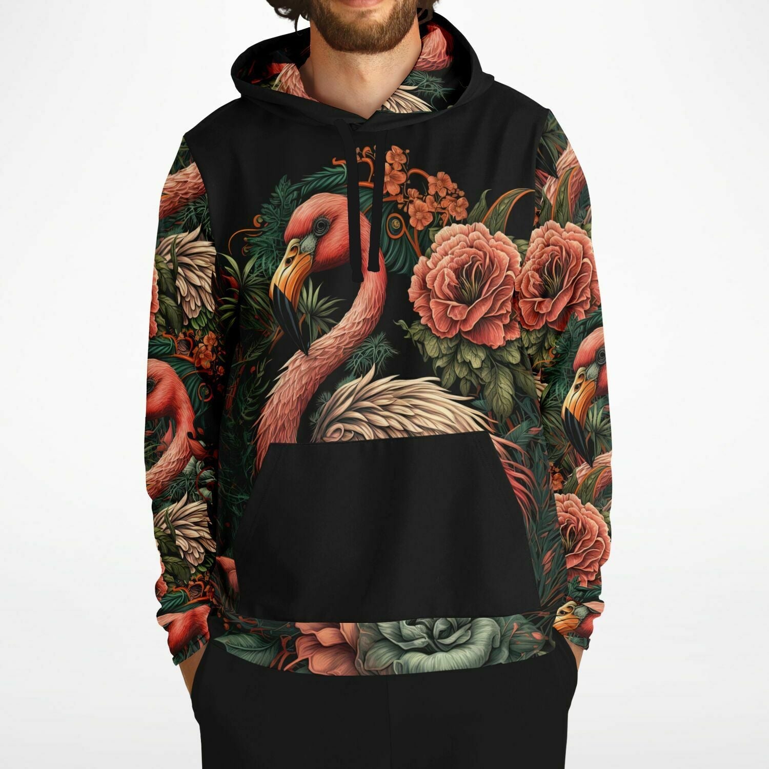 Our flamingo pullover hoodies are soft and plush thanks to brushed fleece fabric on the inside and the inclusion of cotton as 20% of their material. The boosted comfort can be felt as soon as you pull it over your torso and wrap yourself in the most majestic bird in the world. A double-layer hood provides even more protection from the elements, and the front kangaroo pocket ups the hoodie’s convenience.