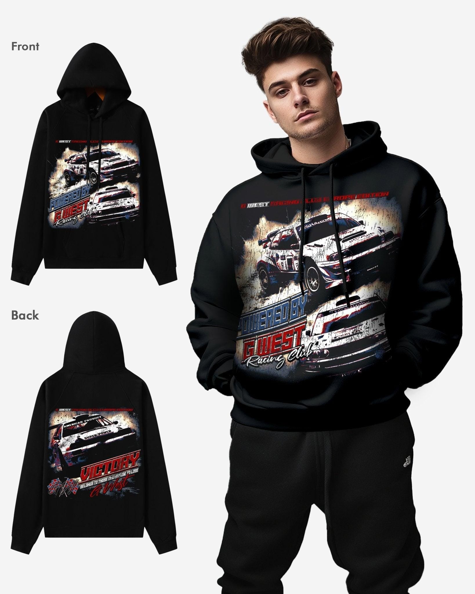 Rev up your style with the G West Racing Club Double Hit Hoodie, a perfect blend of comfort and dynamic design. Made from a premium cotton-polyester blend, this hoodie provides a soft, cozy fit that's ideal for both active days and relaxed evenings. The standout feature is the bold "Racing Club" graphic, prominently displayed on both the front and back, capturing the energy and excitement of the racing world. The classic drawstring hood and roomy kangaroo pocket add practical elements, making it both stylish and functional. Whether you're hitting the track or just enjoying a casual day out, the G West Racing Club Double Hit Hoodie is a must-have for those who embrace a sporty, adventurous lifestyle.