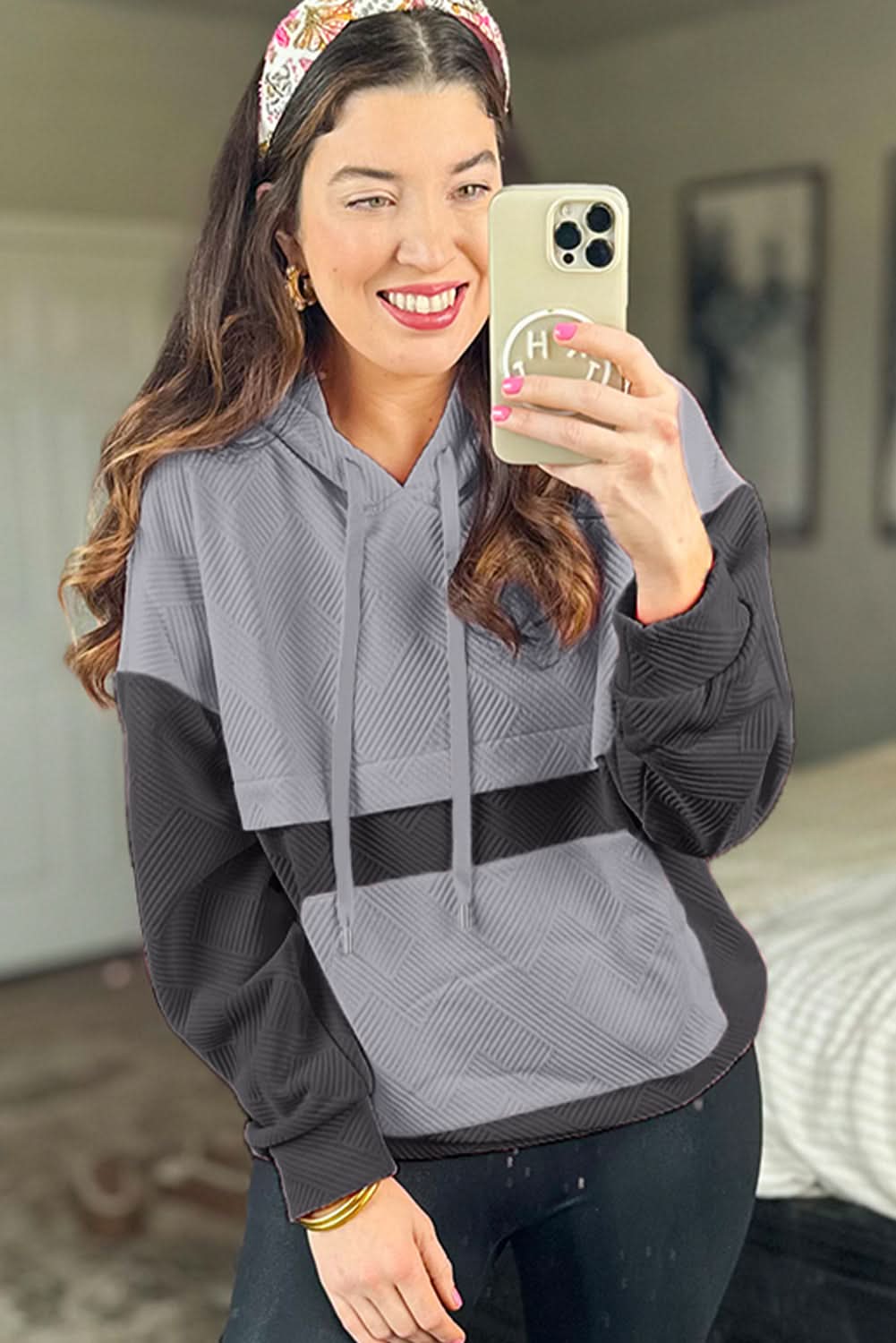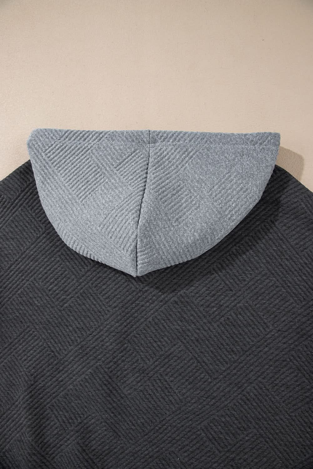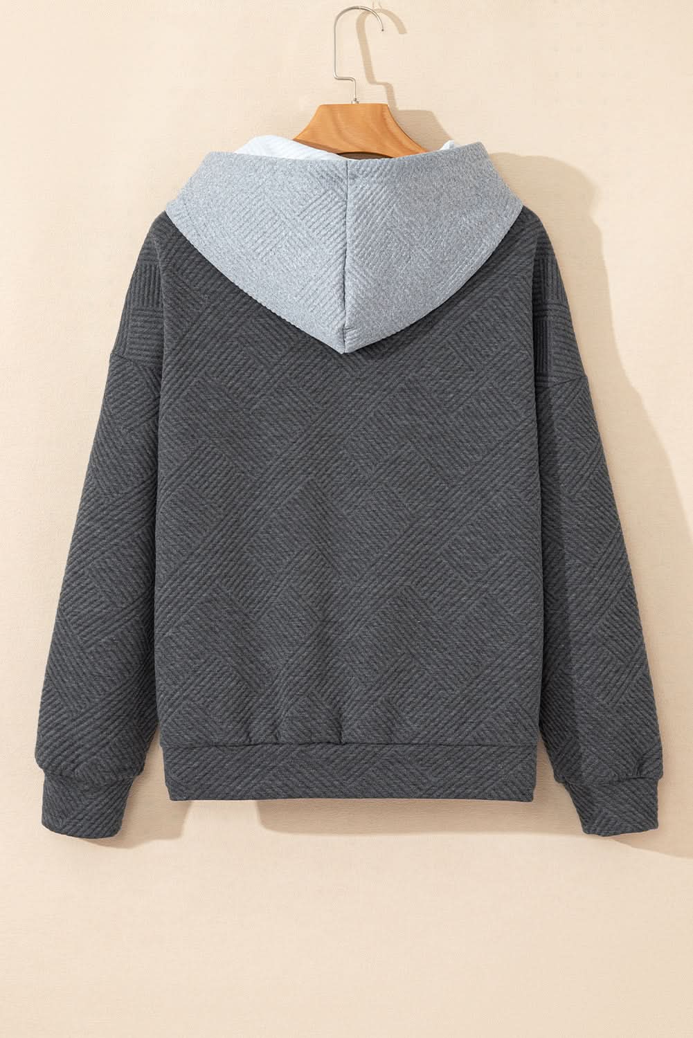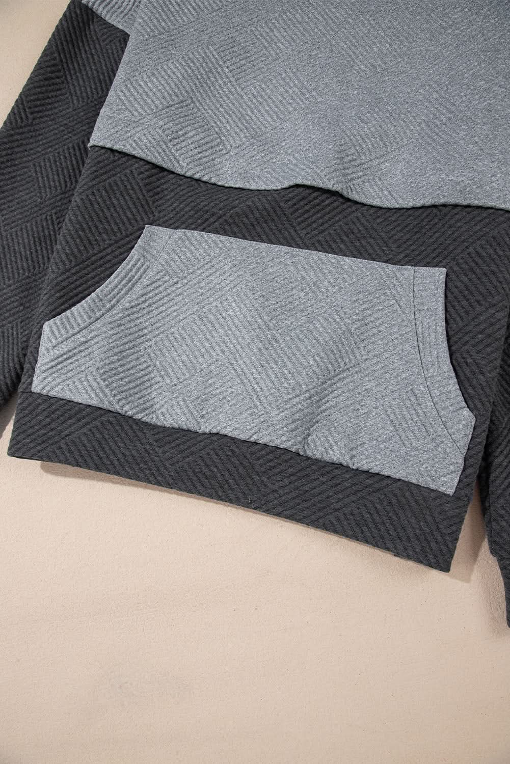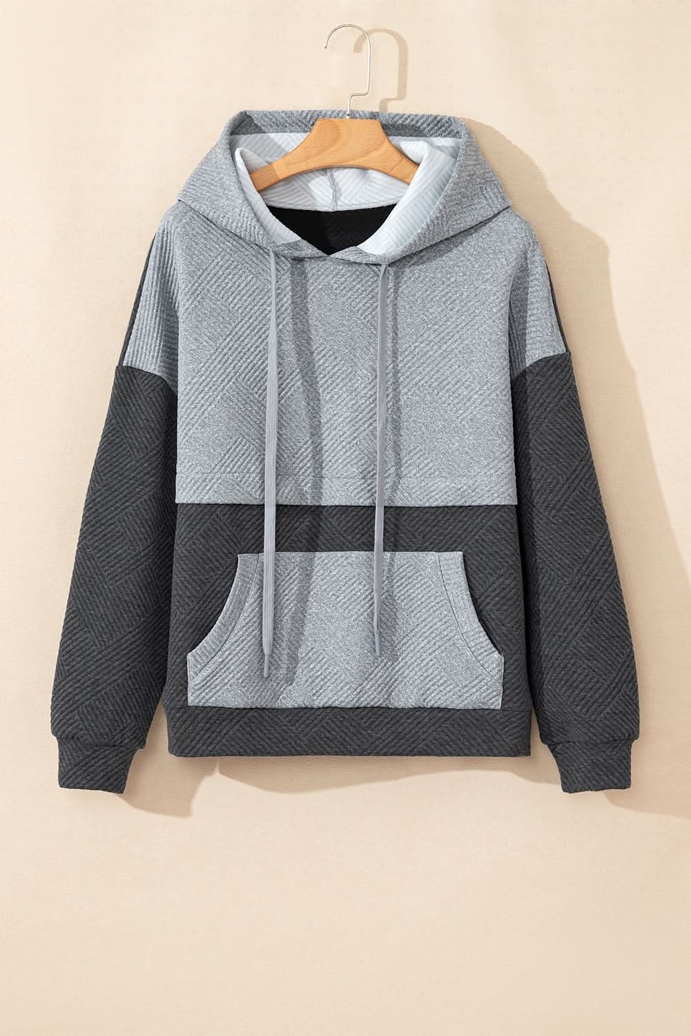 Elevate Your Casual Wardrobe with our Gray Textured Color Block Drop Shoulder Hoodie. This essential piece combines comfort and style, perfect for everyday wear.