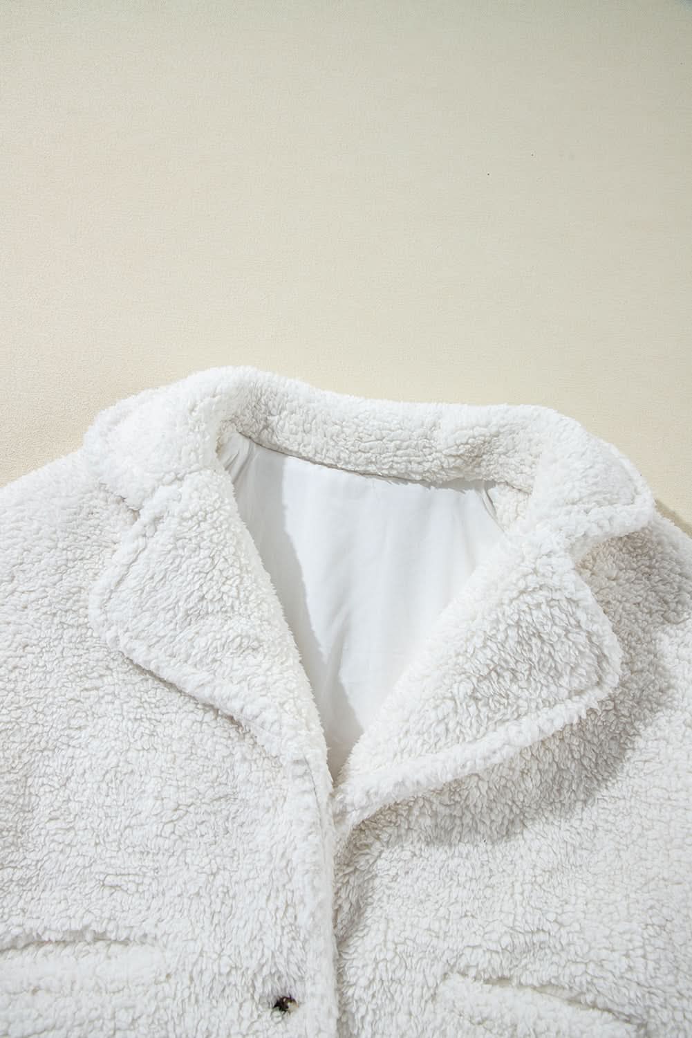 Elevate your winter wardrobe with our Beige Faux Fur Button Pocketed Lapel Collar Jacket, designed for those who appreciate both style and comfort.