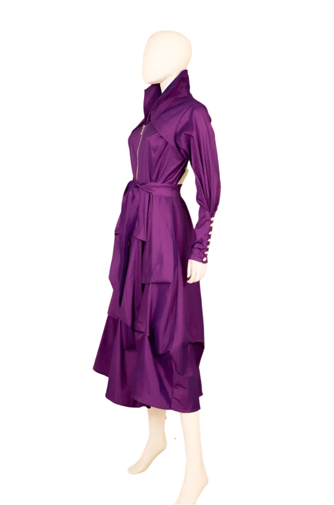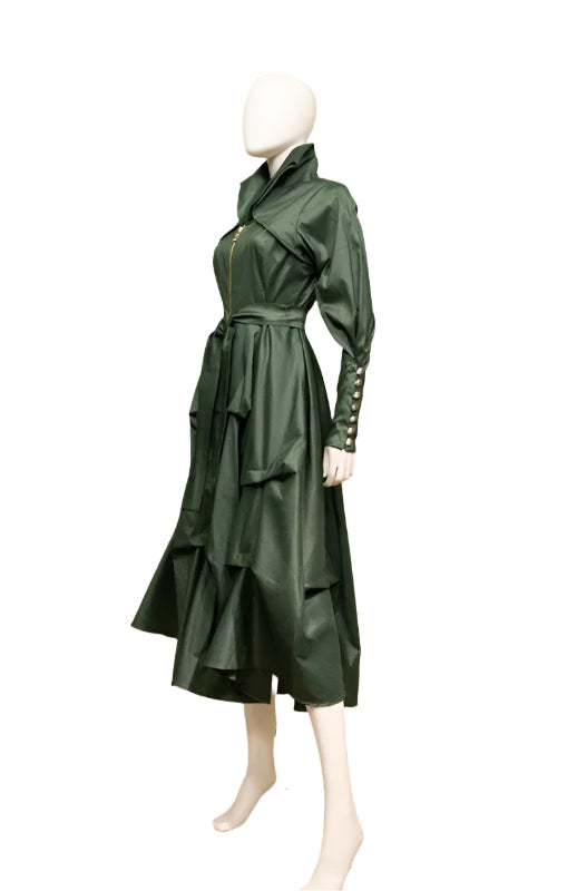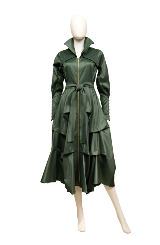 Stretch duppioni long sleeve zip dress-coat with wired collar, buttons on cuff, self-belt