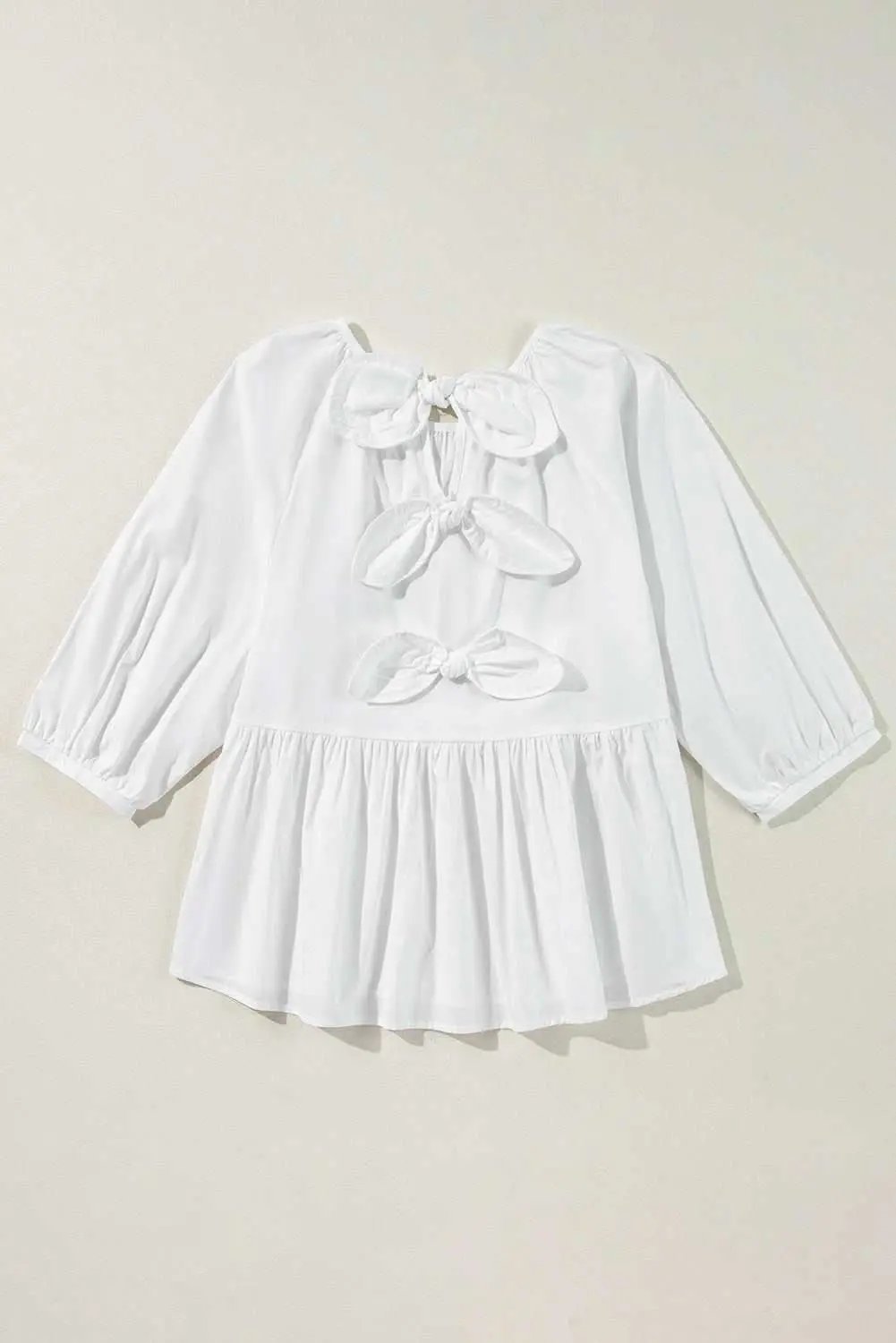 Love Salve White Bow Knot Cutout Back Loose Fit 3/4 Sleeve Blouse