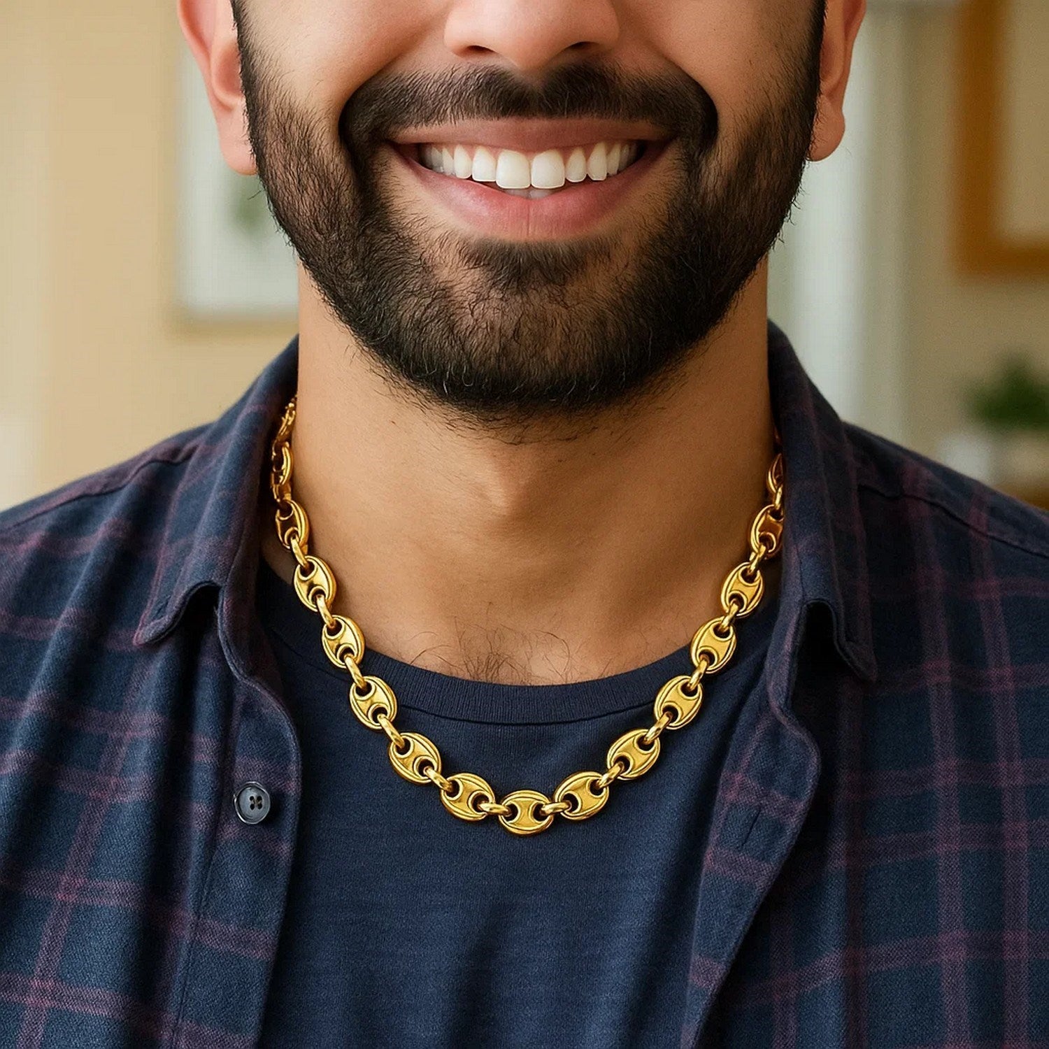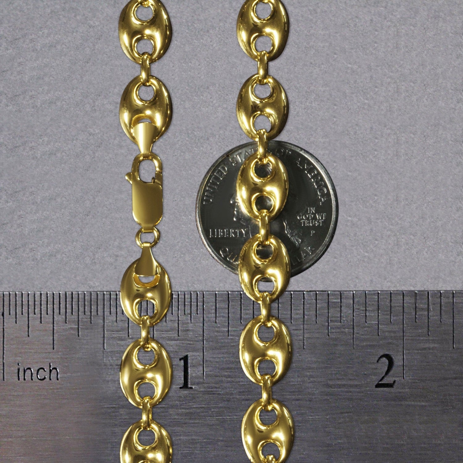This puffed mariner link chain comes in 14k yellow gold and has a width of 9.00 millimeters.