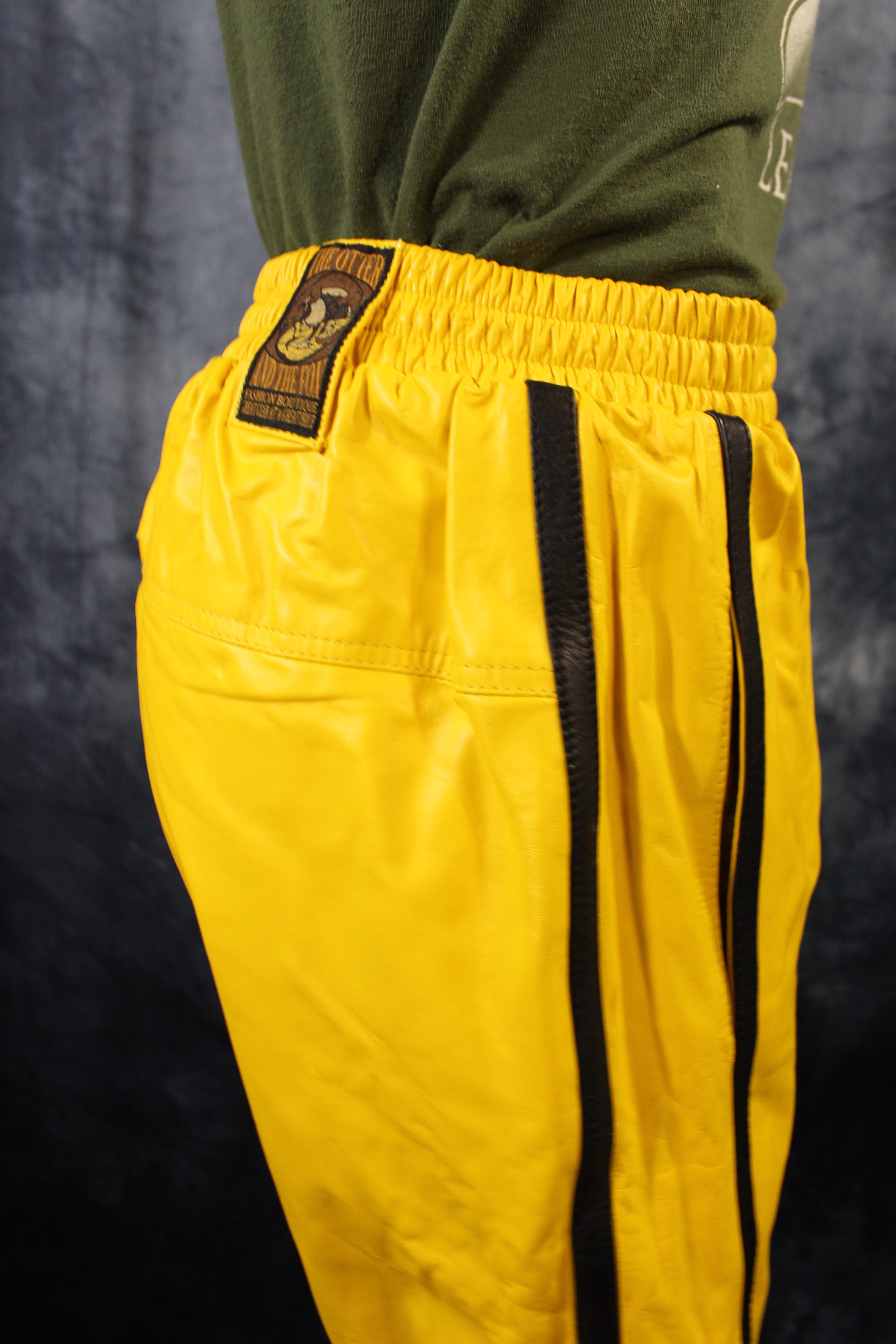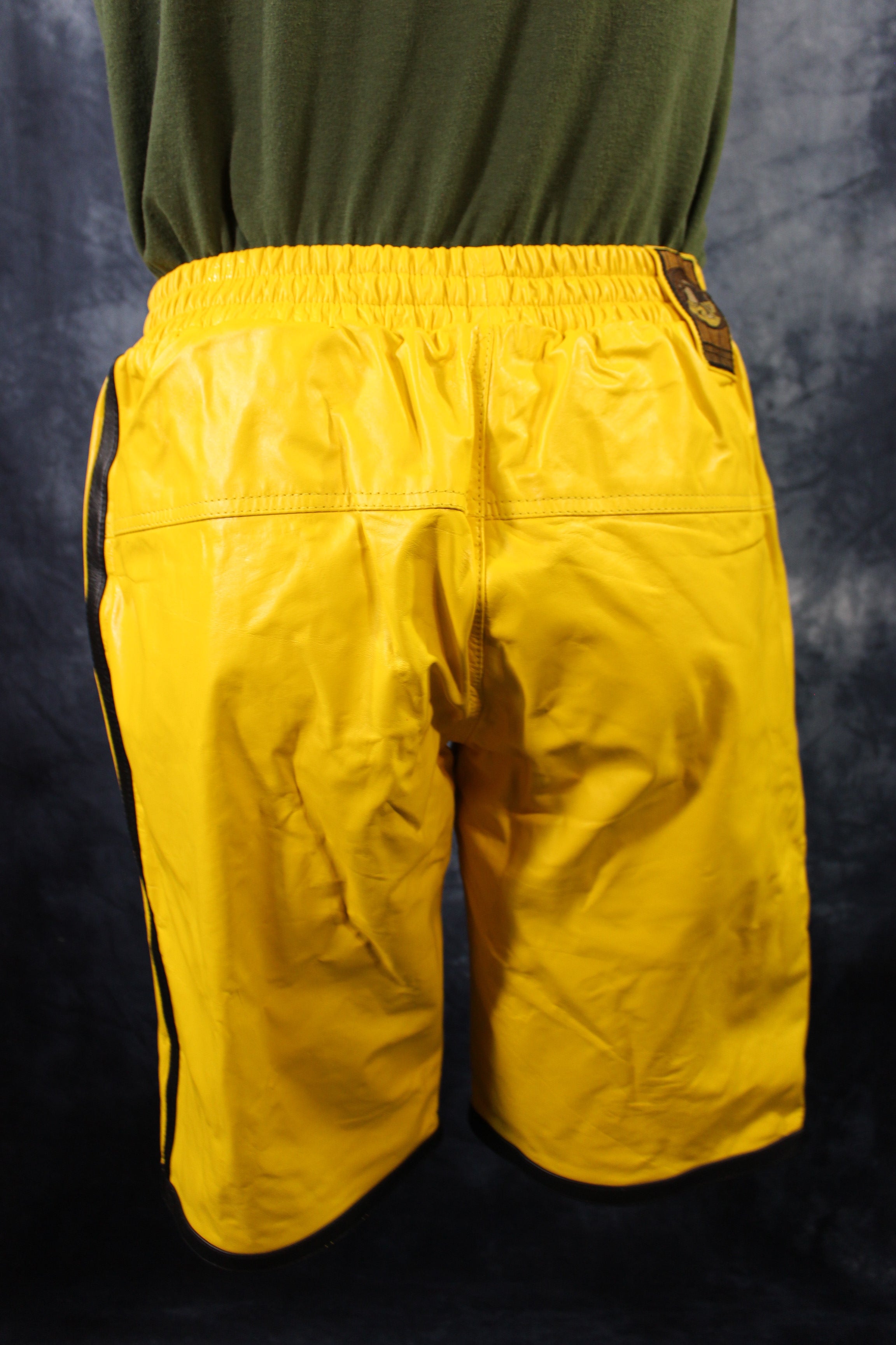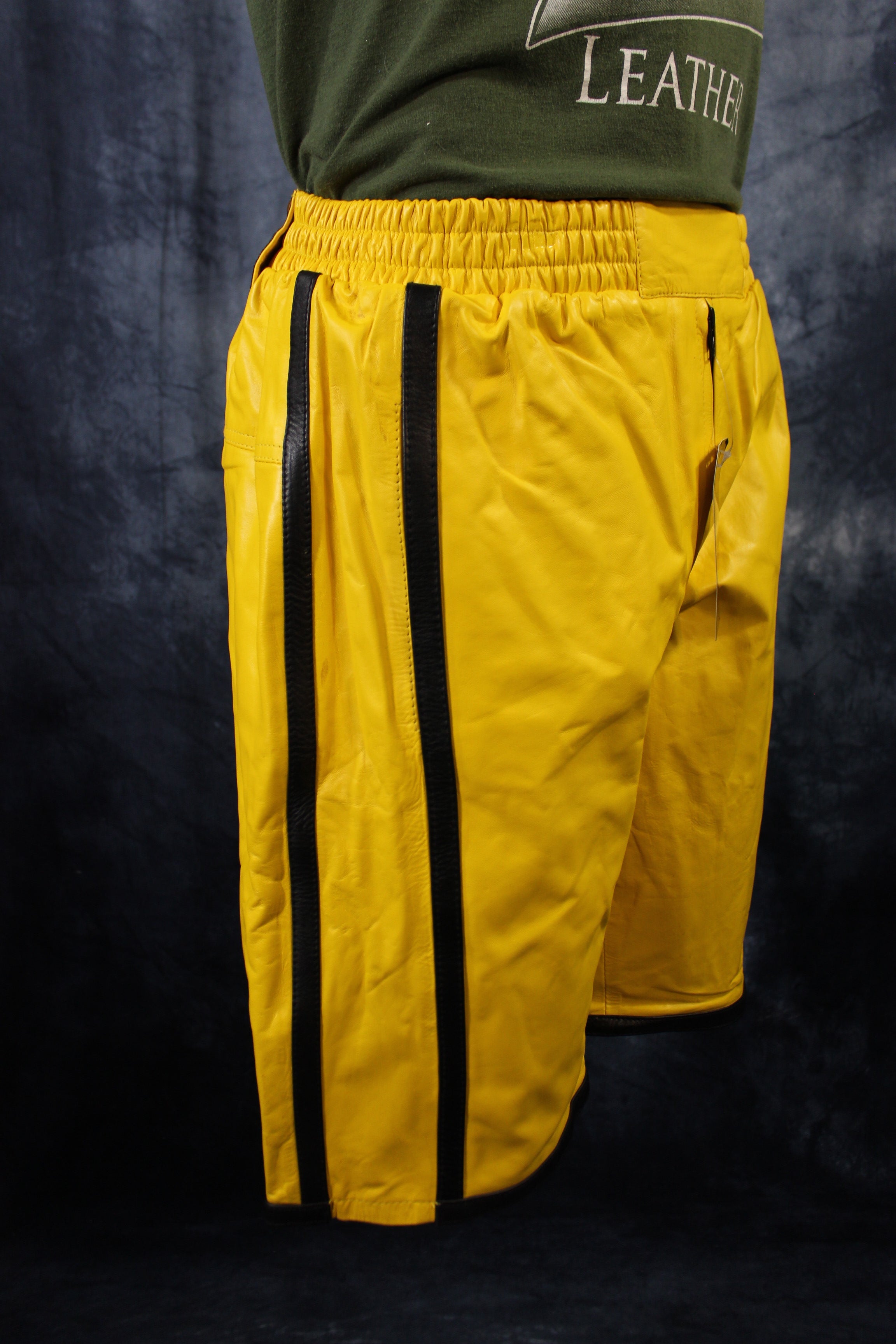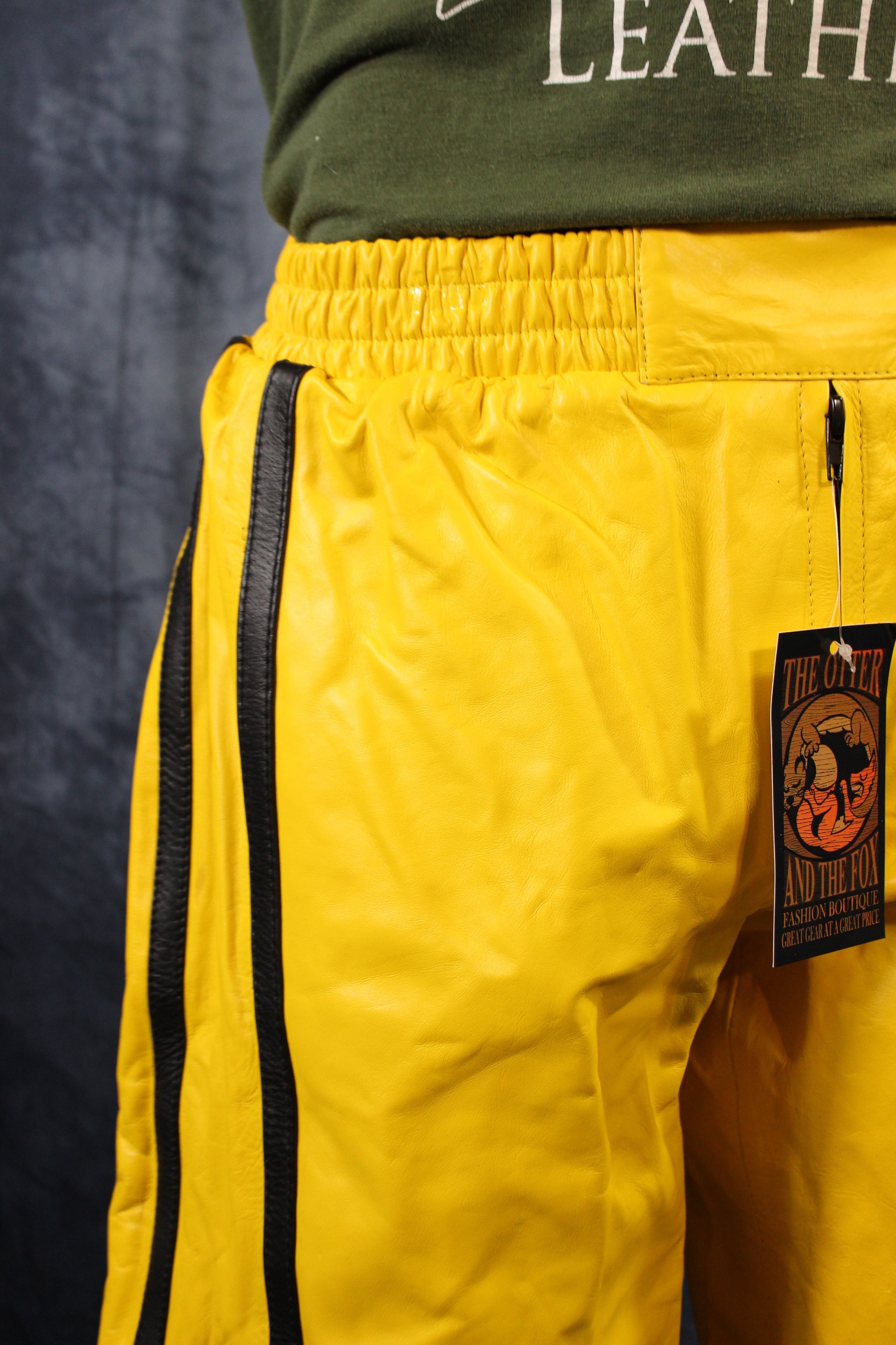 Enjoy the comfort of athletic wear with the luxury of leather with these shorts by The Otter and The Fox. These sporty shorts feature an elastic waistband for a comfortable, slip on fit, liner, and high quality leather. These shorts are loose and comfortable and are a perfect way to indulge your love of leather while looking and keeping cool in the hot summer.