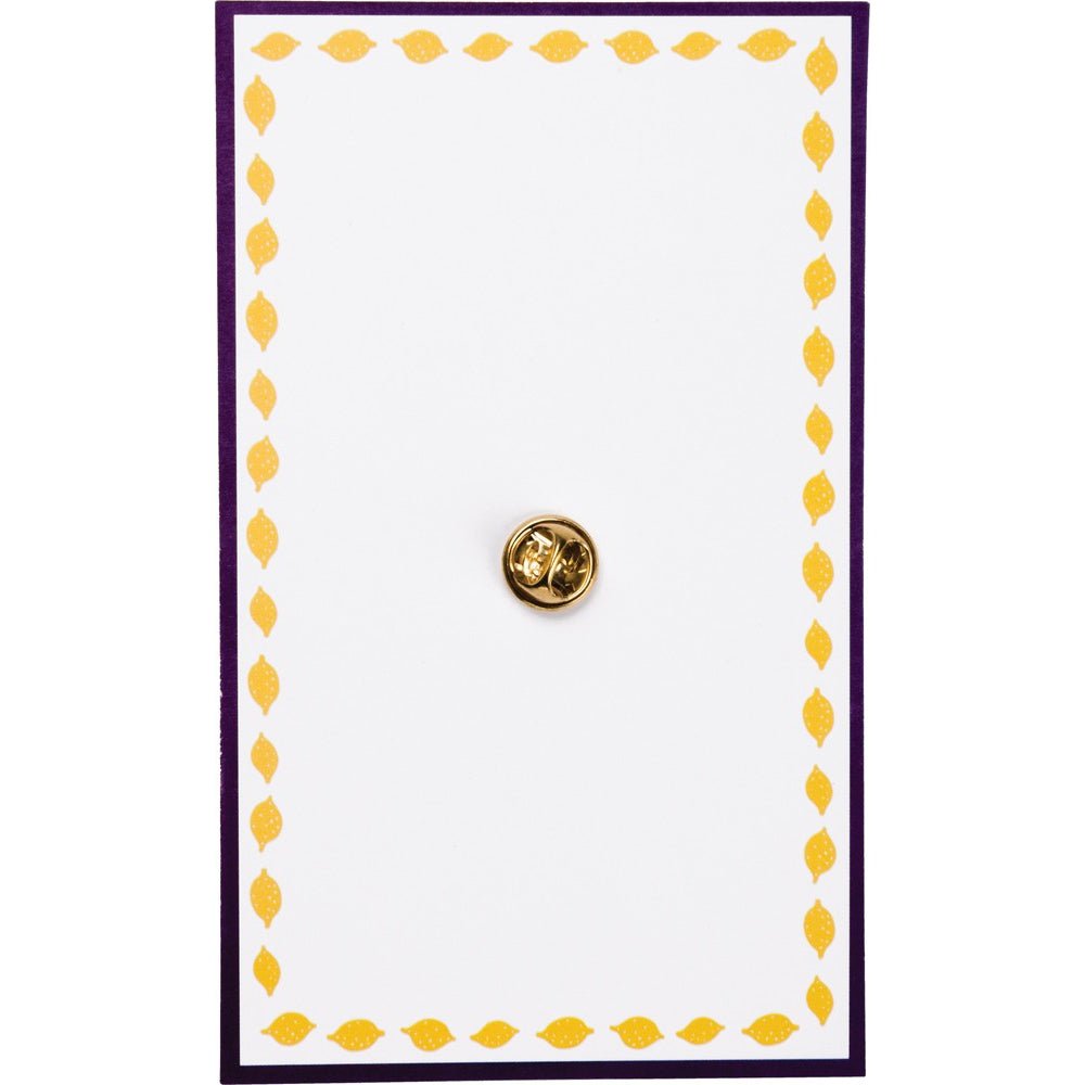 A high-quality hard enamel "Main Squeeze" pin with hugging lemons design and butterfly clip closure. Comes packaged on a double-sided, thoughtfully-coordinated "You Are My Main Squeeze" card with a blank reverse side for a handwritten note.