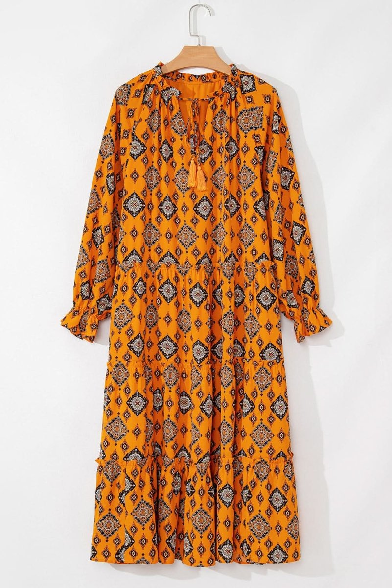 Orange Western Geometric Print Tiered Frilled Loose Fit Midi Dress