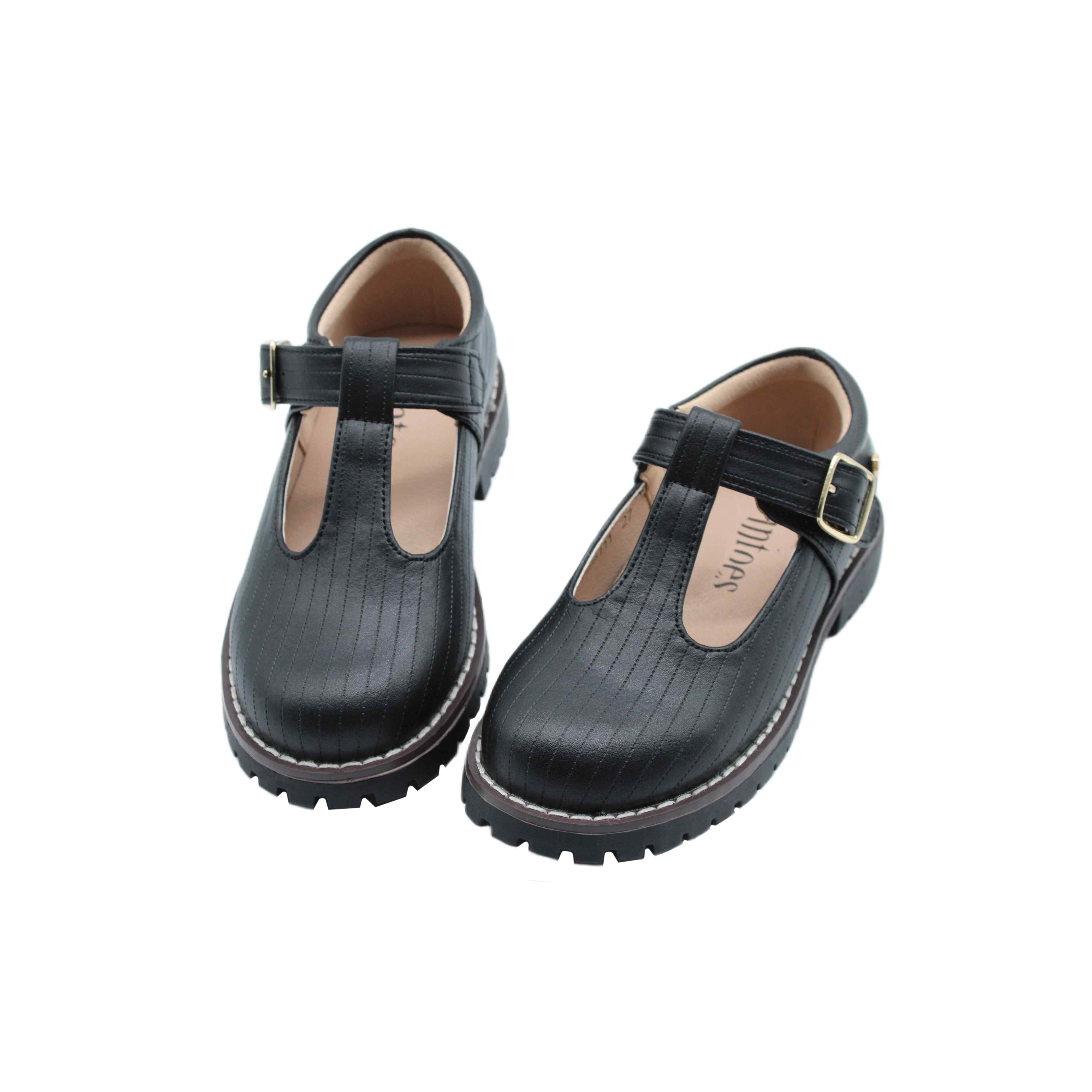 Black striped designed T strap shoe / chunky sole