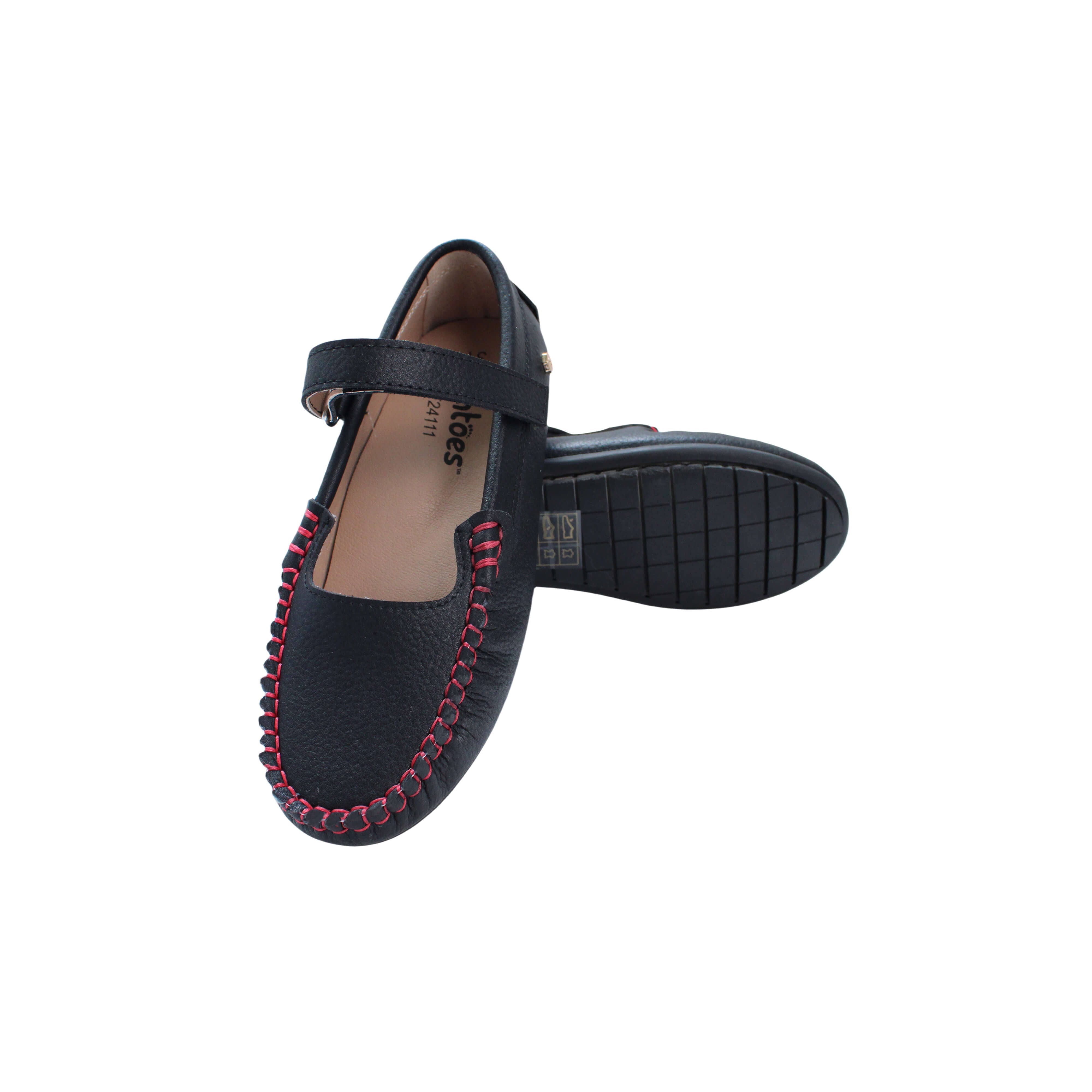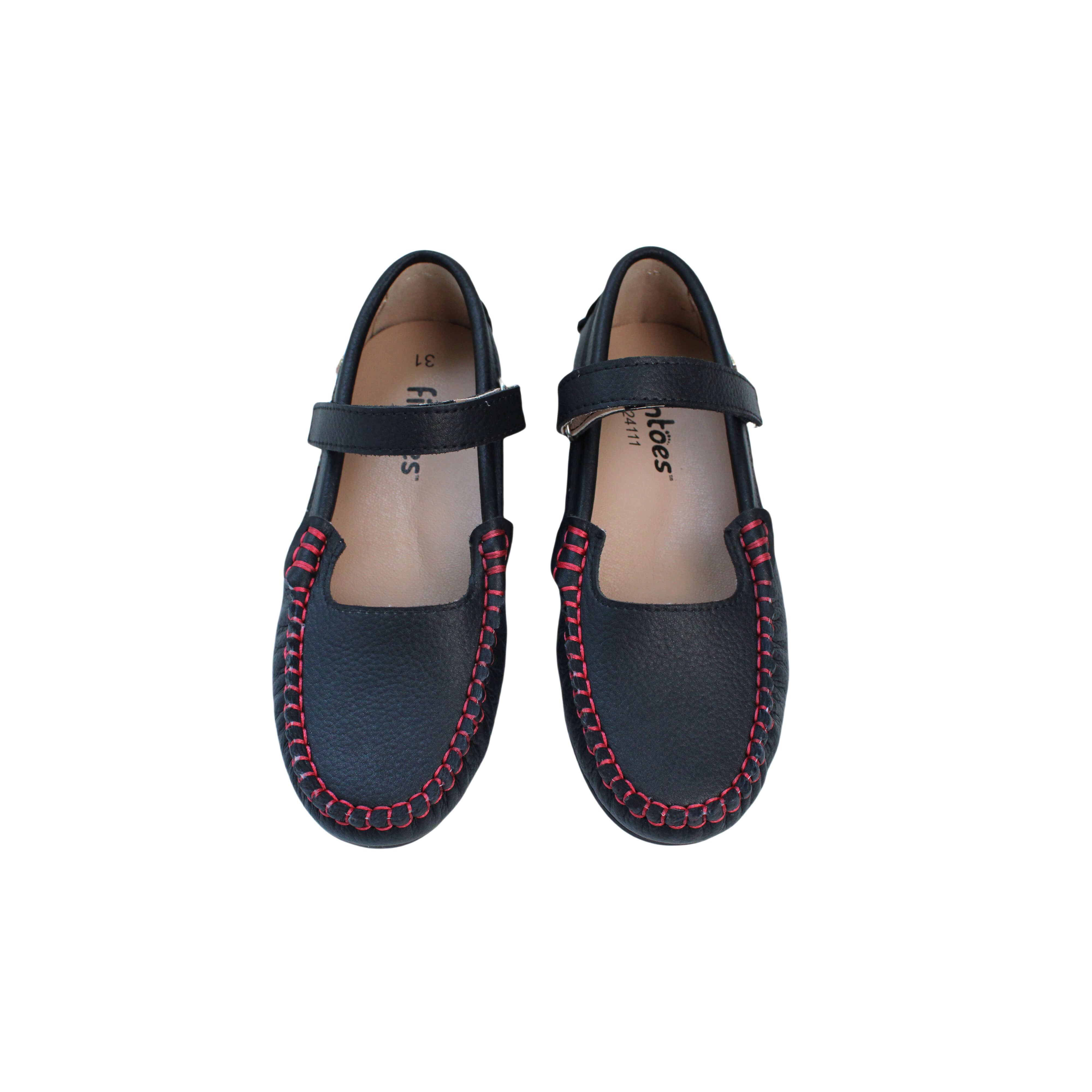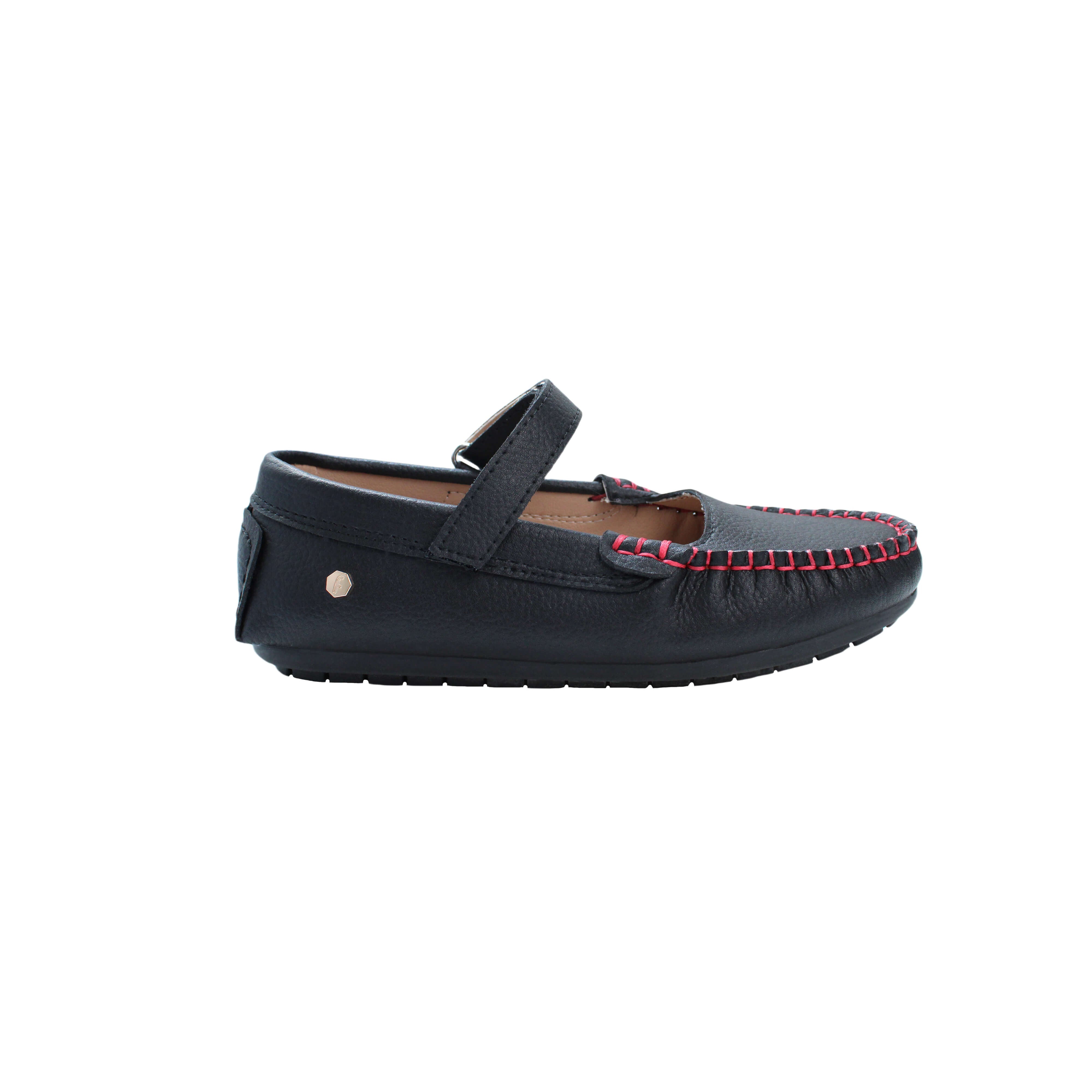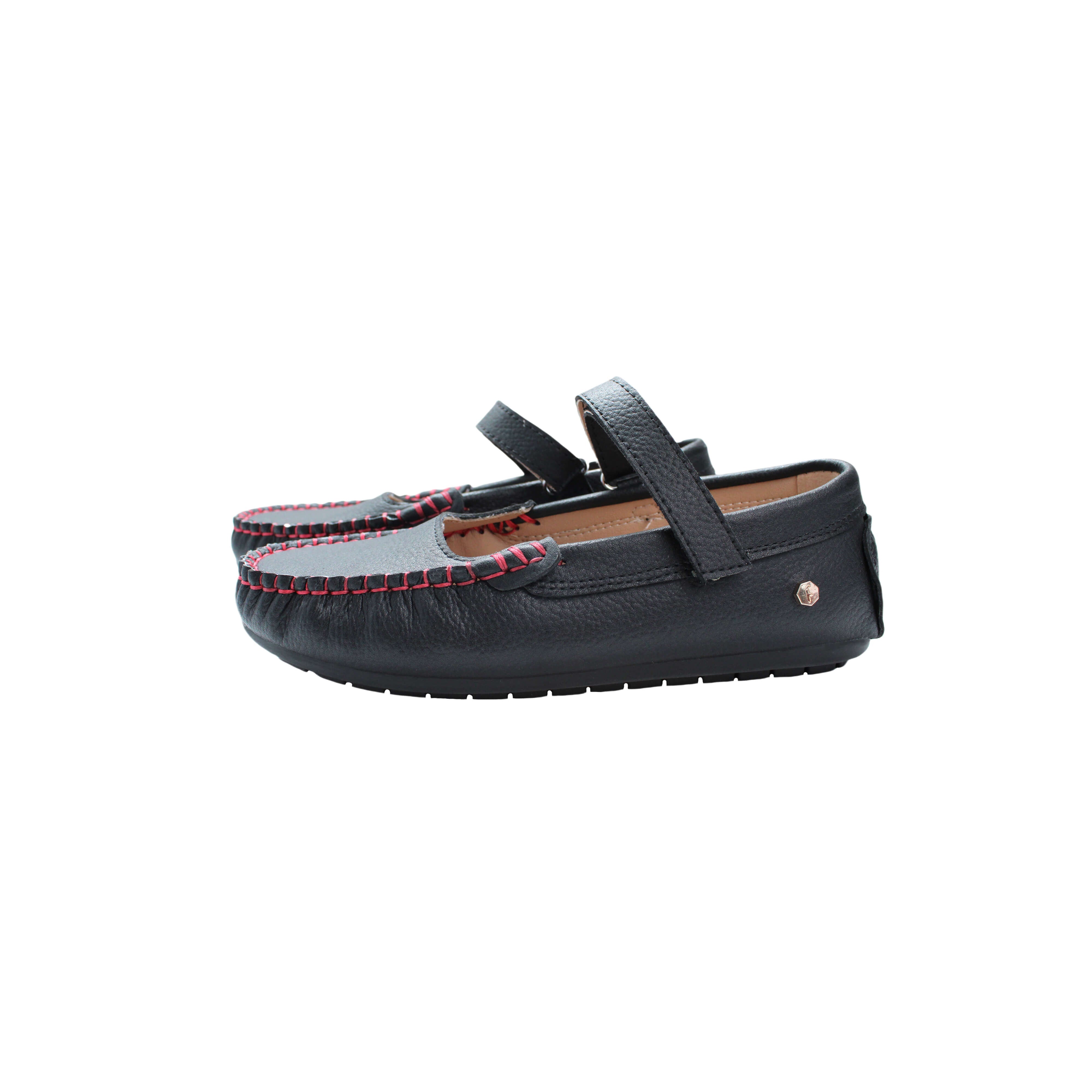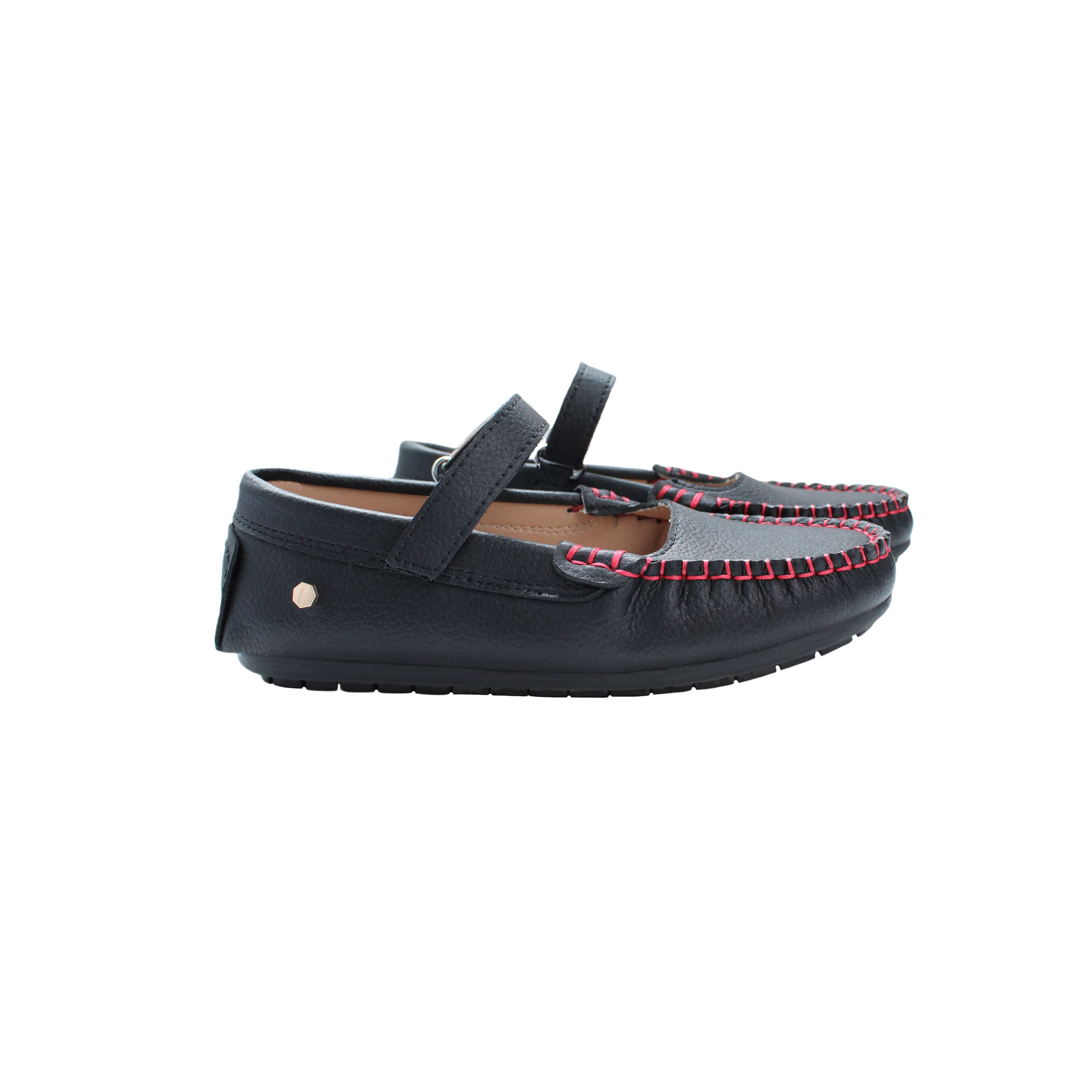 Black pebbled leather with red stitching/ Velcro closure