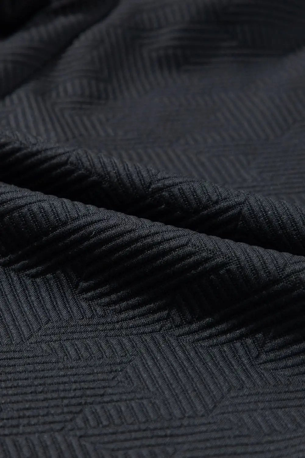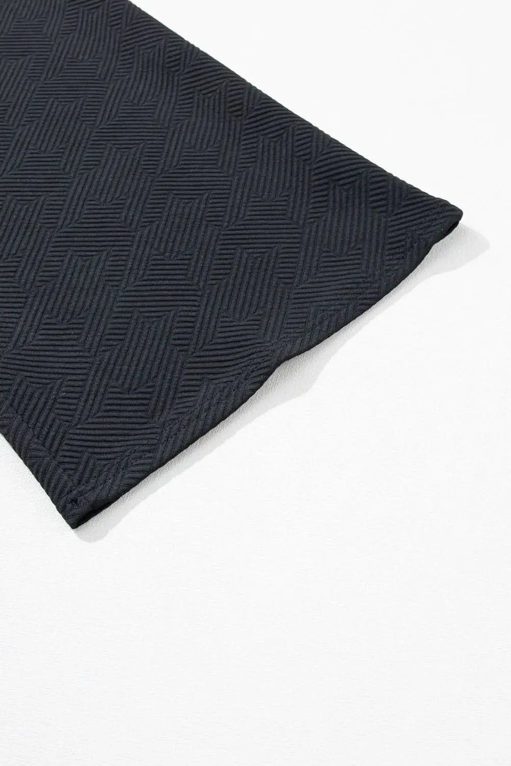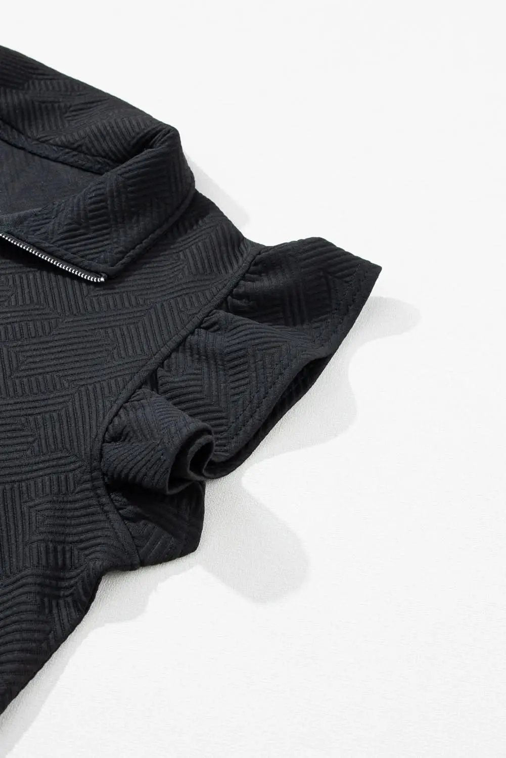 Elevate your everyday wardrobe with this two-piece set in classic black. The textured knit fabric blends 95% polyester with 5% elastane, delivering a comfortable stretch that moves with you. The top features flutter sleeves for a feminine silhouette and a zip neckline for adjustable coverage and styling options. The accompanying wide-leg pants offer easy movement with an elastic waistband and a functional drawstring for a secure, custom fit. This set is designed for versatility, easily transitioning from casual day outings to relaxed gatherings while maintaining a polished look. Pair with sandals or heels to suit the occasion, and layer with minimal accessories for a streamlined, modern aesthetic. The timeless black finish ensures it coordinates with accessories and footwear across your existing wardrobe.