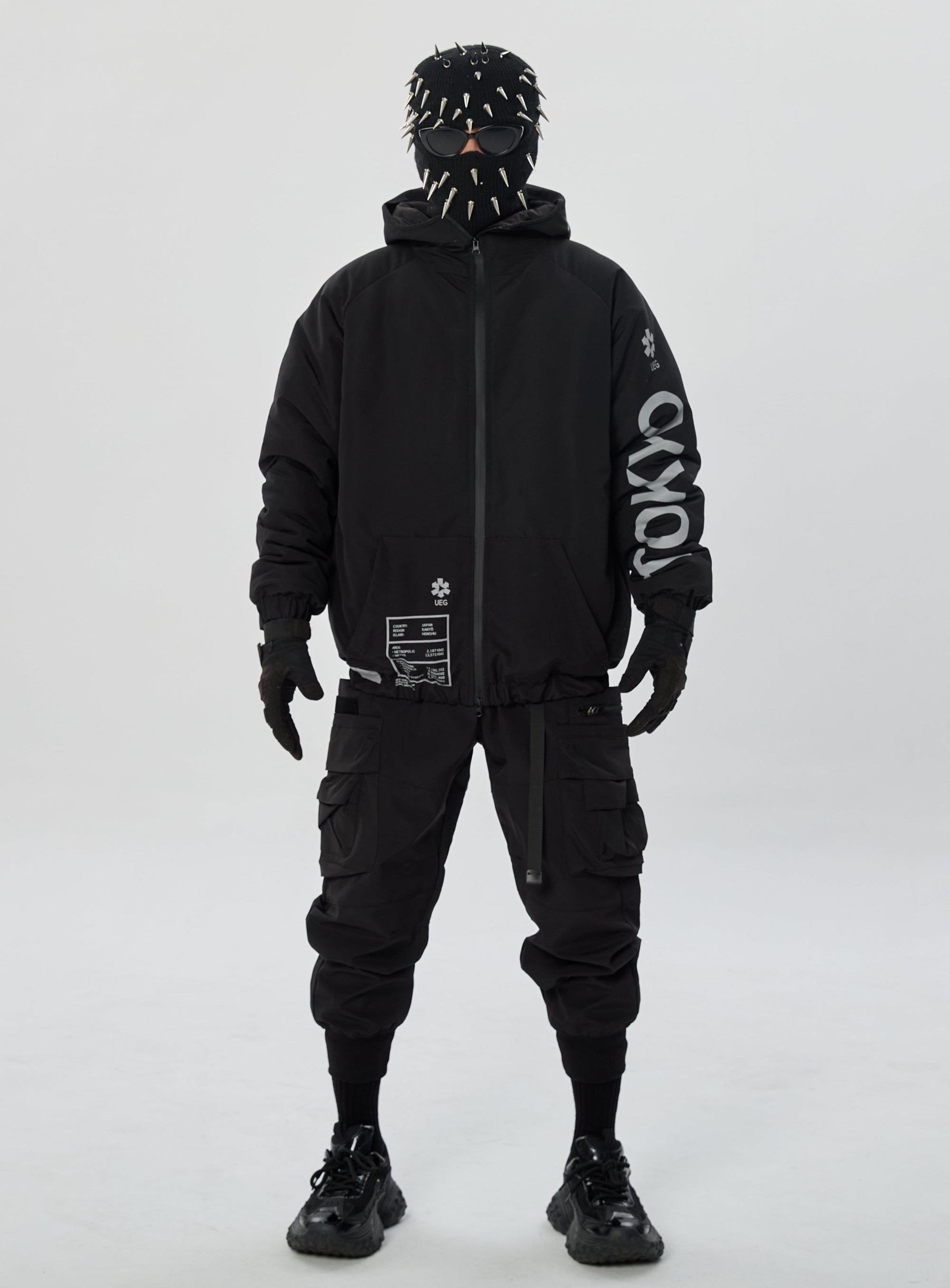 - Data of population, location, and size of Tokyo used as designs on the hood and right bottom corner of the jacket