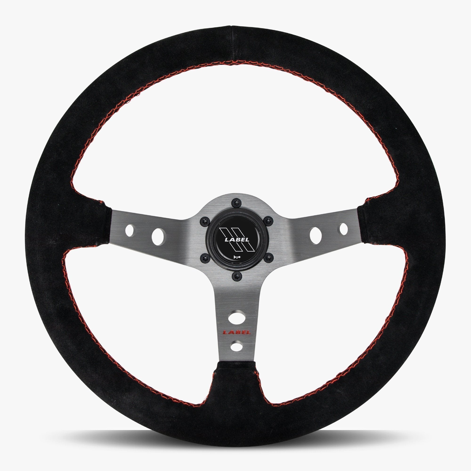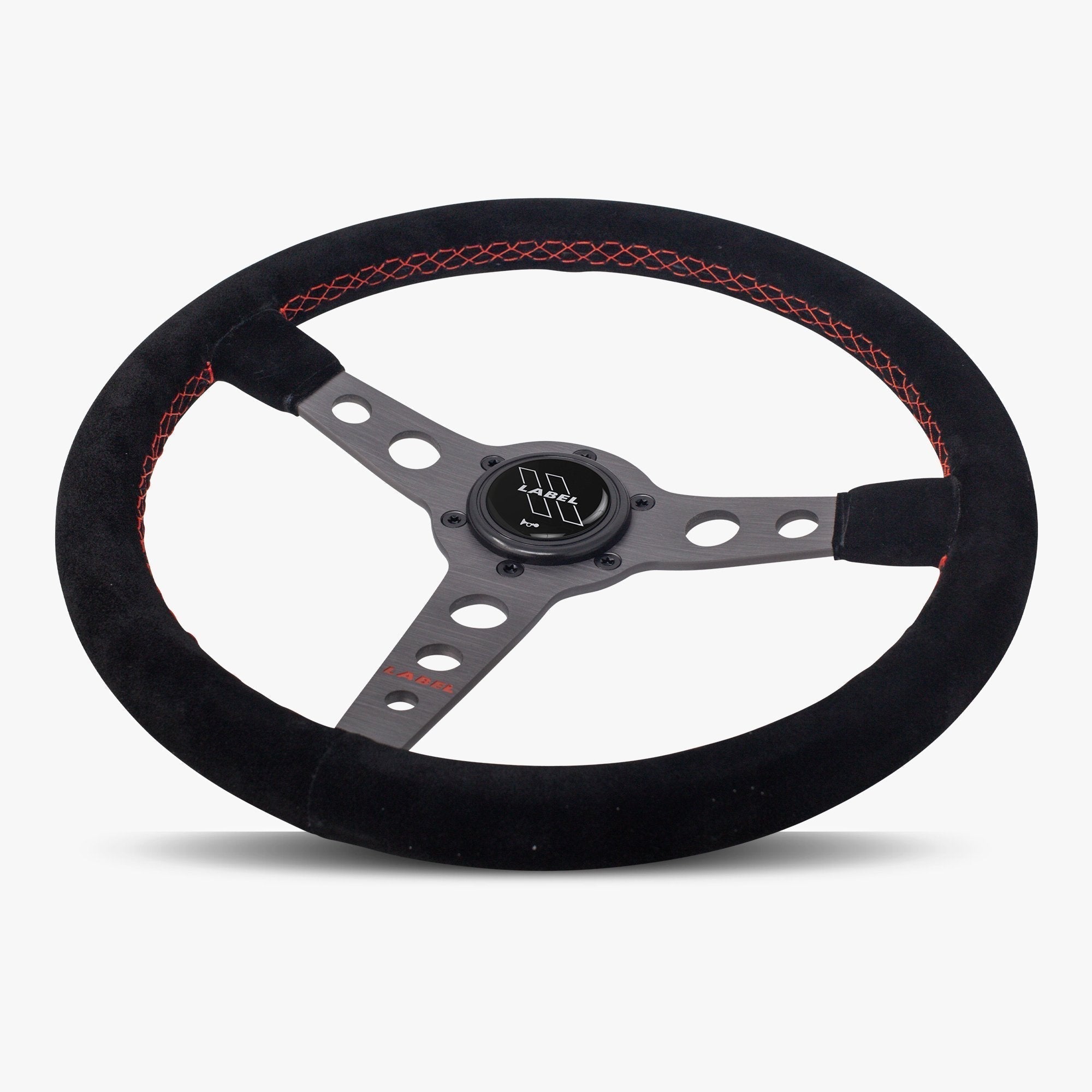 The Daytona | Black Alcantara Suede | Graphite Spoke | Red Stitch ‐ The Daytona Plus (100mm depth)