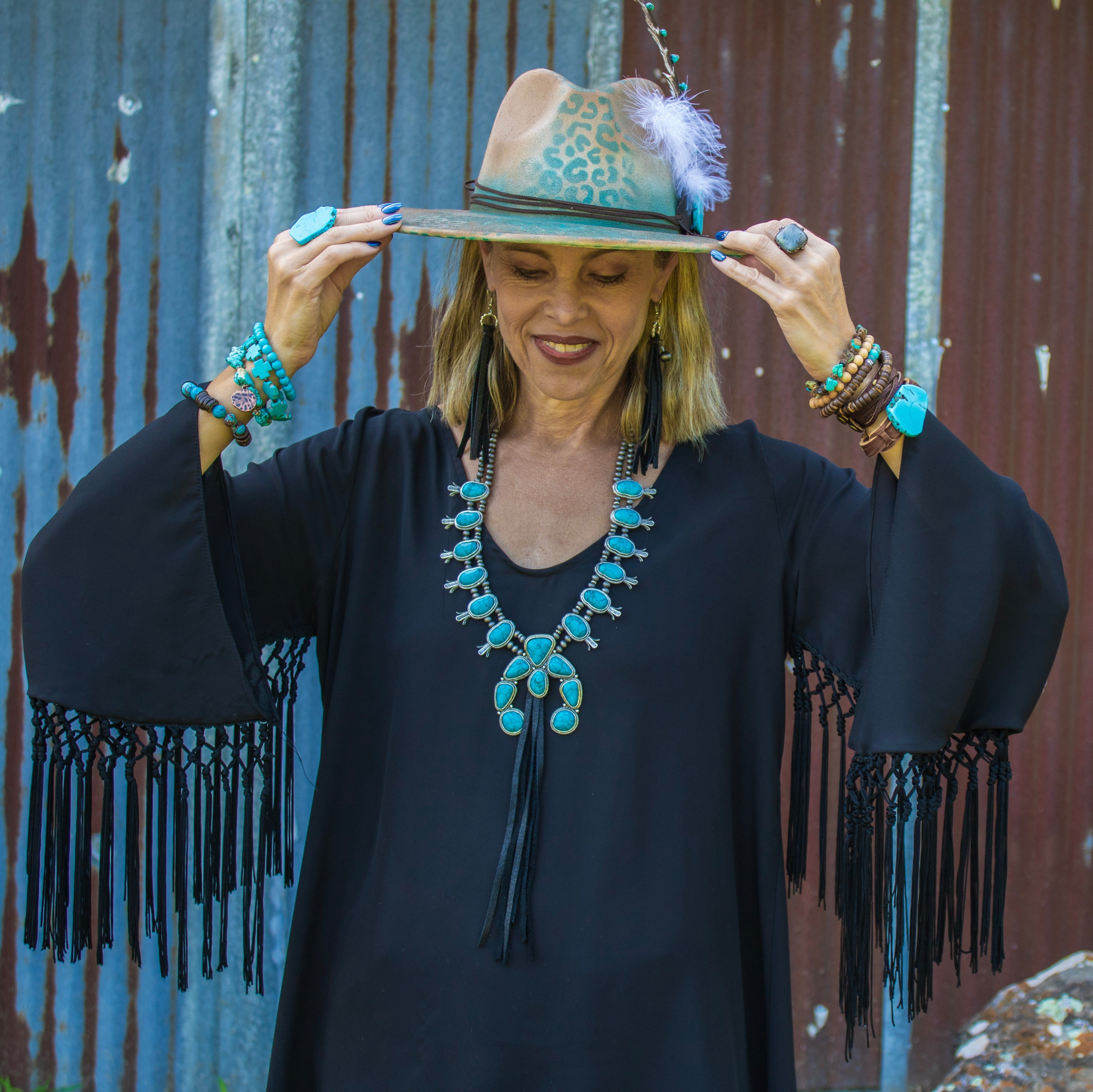 Embrace bold boho charm with this Turquoise Squash Blossom Necklace featuring a striking long black tassel and large Naja Pendant. Its classic western-inspired design pairs vibrant howlite turquoise stones with intricate silver detailing, making it a standout accessory for any outfit. Perfect for adding a touch of unique style and effortless flair, this necklace elevates your look with authentic Southwestern spirit.