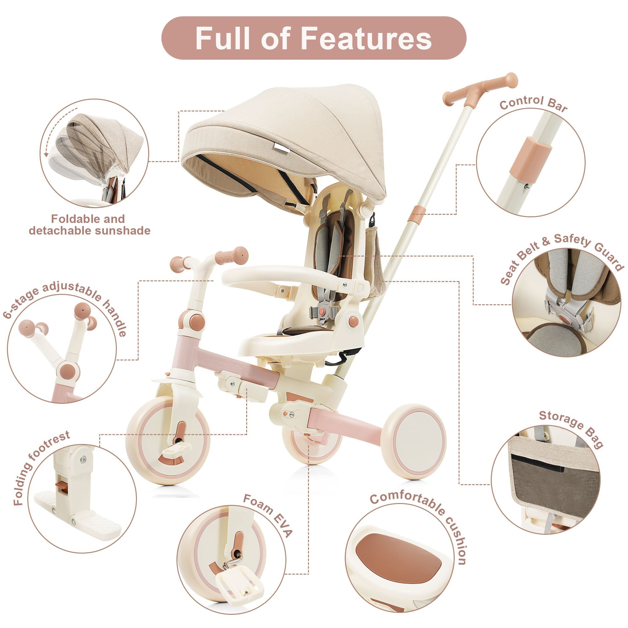 - 7-in-1 Multifunctional-This baby tricycle can be used as a learn-to-ride trike with a canopy, a push tricycle, a standard tricycle, and a balance bike, which meets the needs of children at different stages of growth from 1 to 6 years old.