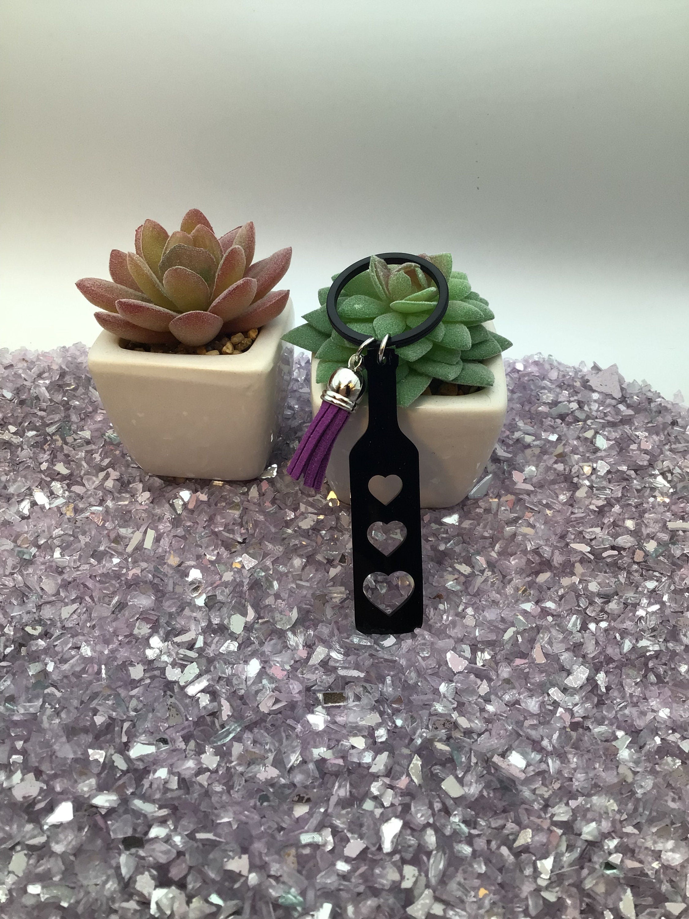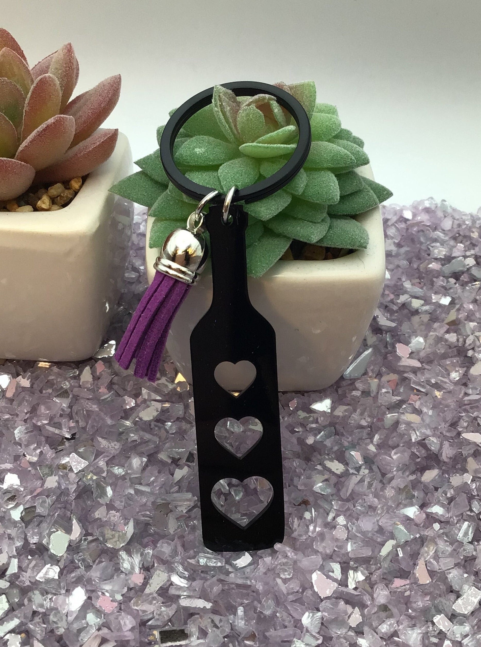 BDSM Heart Paddle Keyring, Black Acrylic w/Purple Tassel
