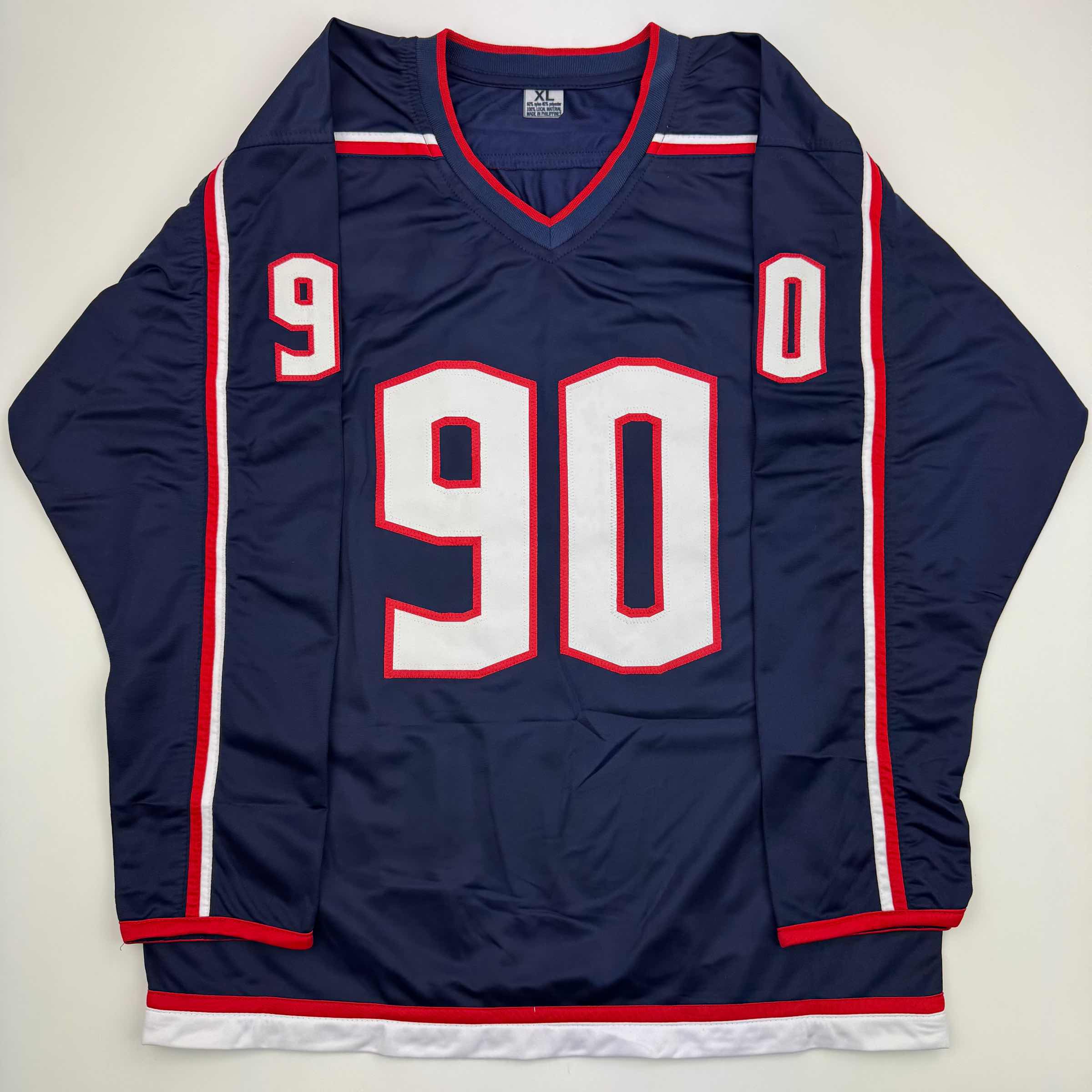 Jersey has no brand names or logos. This is a custom jersey and was not manufactured by or in any manner associated with any professional sports league or manufacturer. This custom jersey carries no professional sports league designation. The item is intended to be an autographed collectible. The custom jersey displays the name and number of the player. This item in no way is affiliated with or connected to any professional sports organization. Size is XL