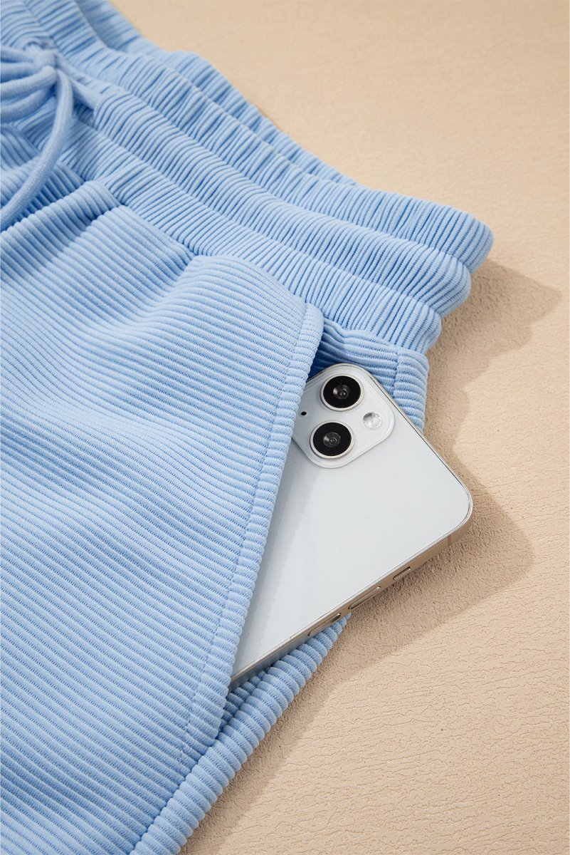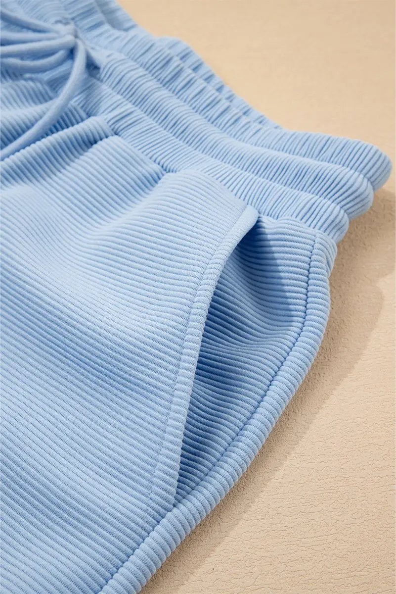 Beau Blue Textured Ruffled Sleeve Zipped Top and Wide Leg Pants Set is the perfect ensemble for the modern woman who cherishes both style and comfort. This chic two-piece set seamlessly blends sophistication with playful elements.